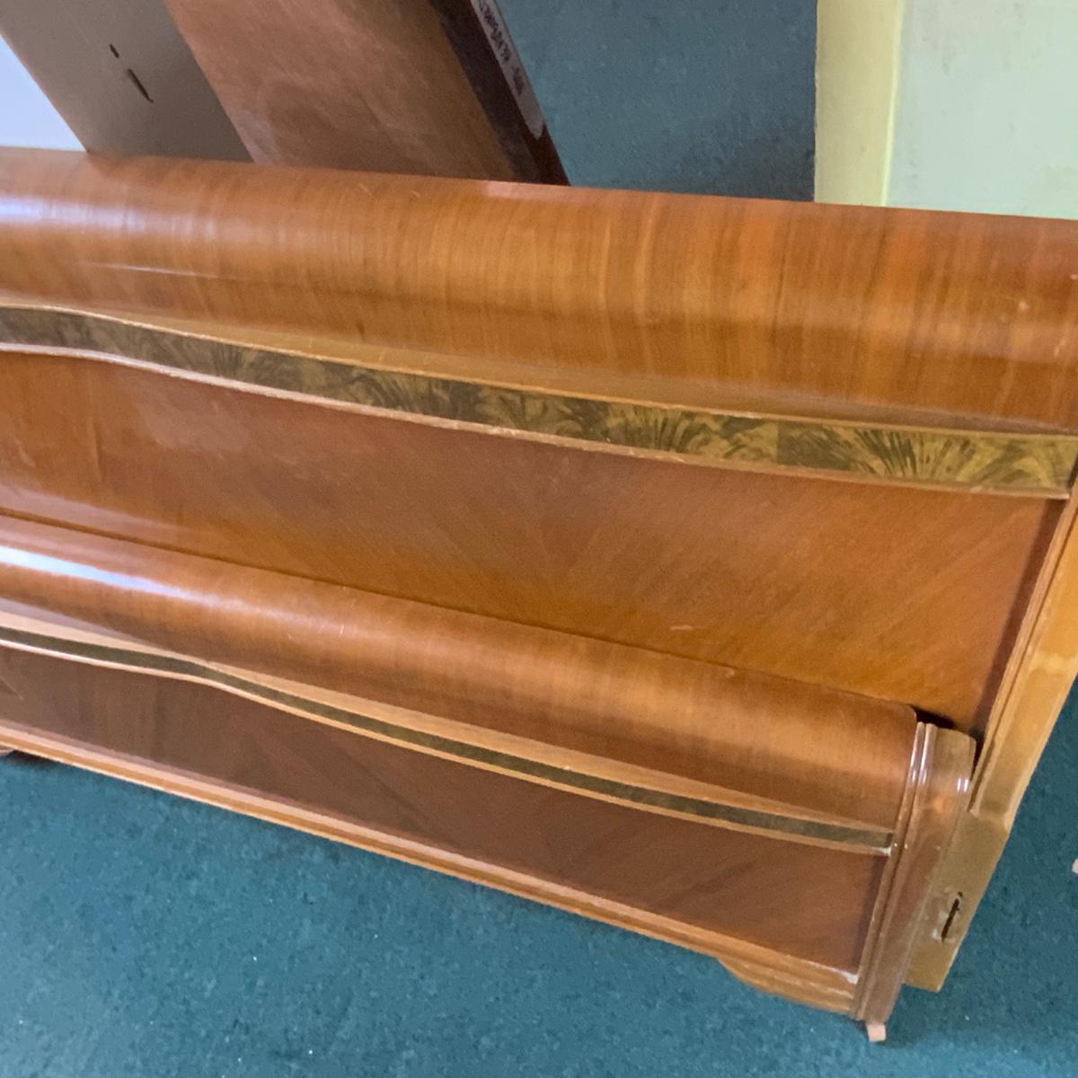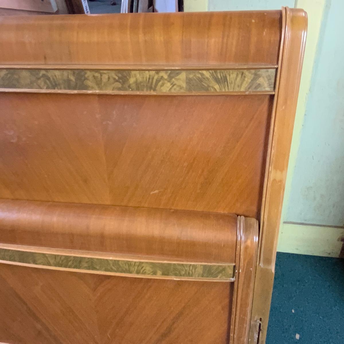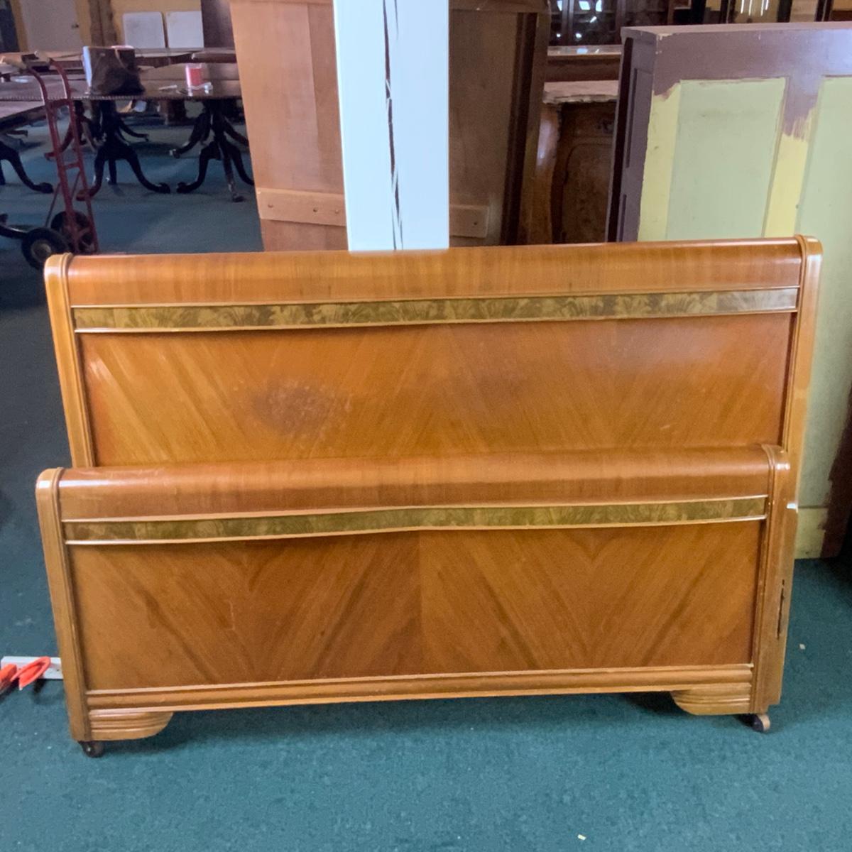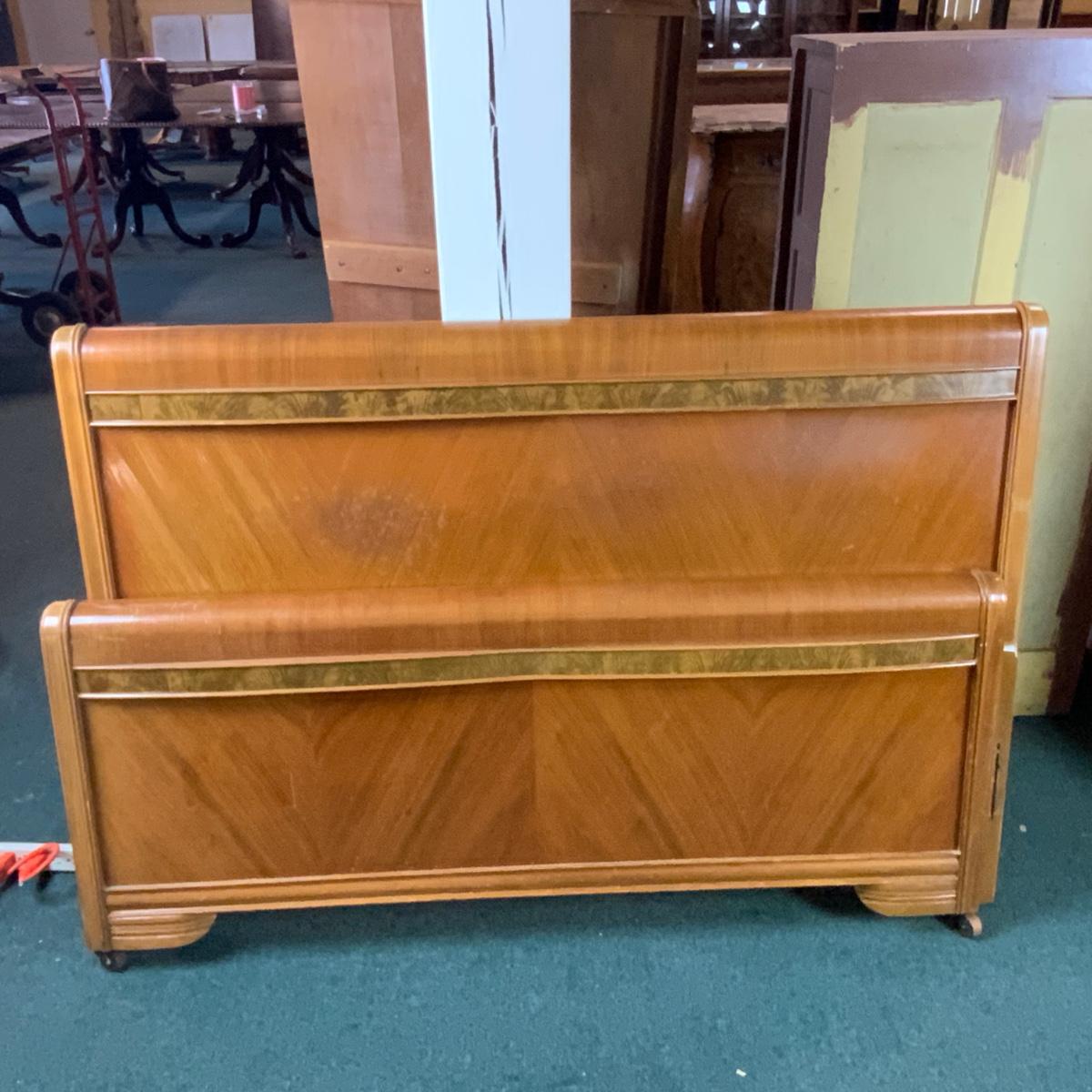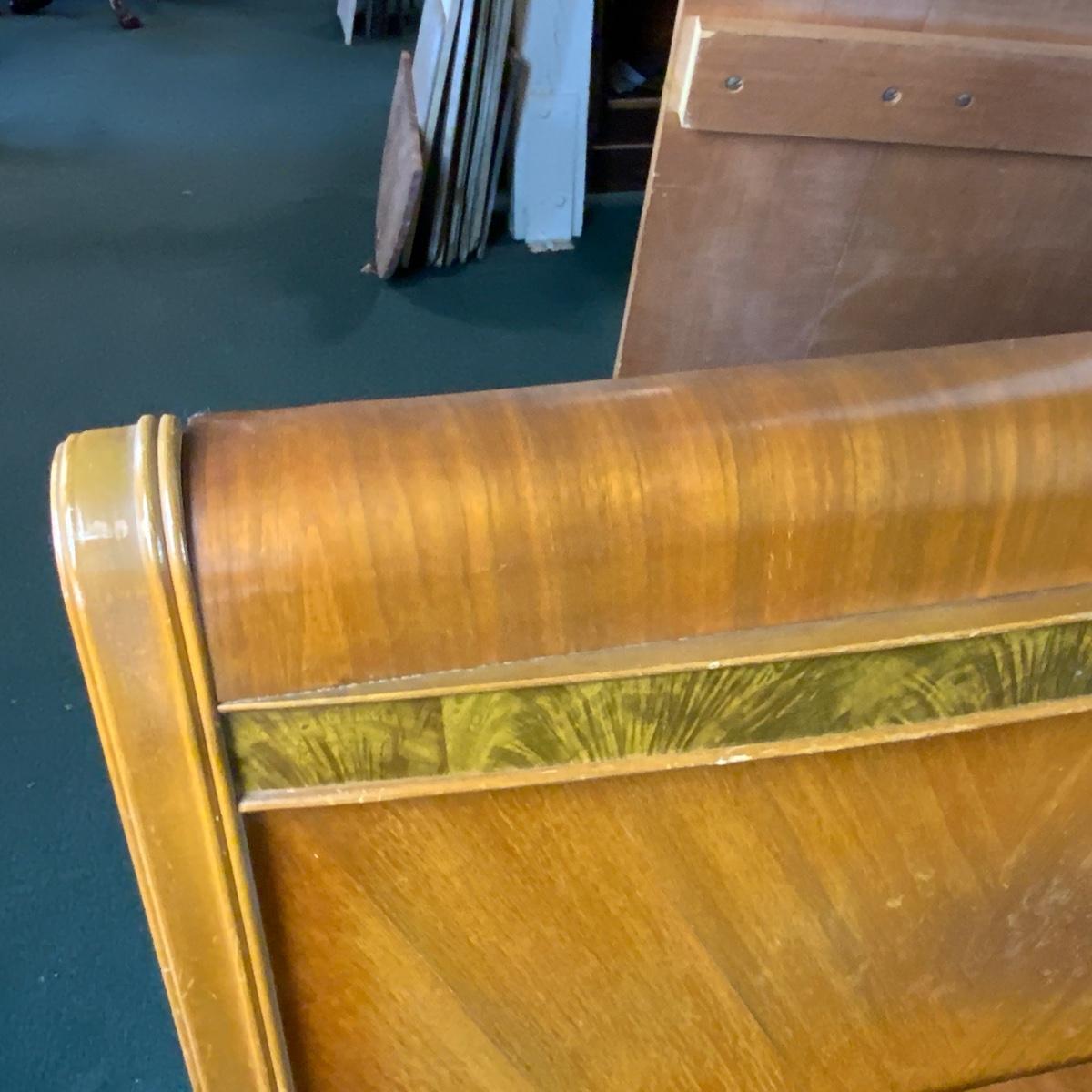 Stunning Art Deco Waterfall Head and Foot Boards. Interior of footboard is finished nicely. Would be a lovely piece in your home. //::\\ Please see photos for details and condition. No attempt has been made to hide any imperfections. All items listed in this auction are warehouse items, and need to be cleaned. A majority of the items need restoration as well. All items are sold AS IS and WITHOUT GUARANTEE. If you are uncertain about an item, DO NOT BID. Due to the nature of this online auction in-person inspection is HIGHLY recommended. All Sales are FINAL. Pick Up Times are FIRM. Please confirm with your own schedule that you can pick up in the scheduled times listed in the Terms and Conditions. Any questions please message the auctioneer. DO NOT Contact The Harp Gallery.