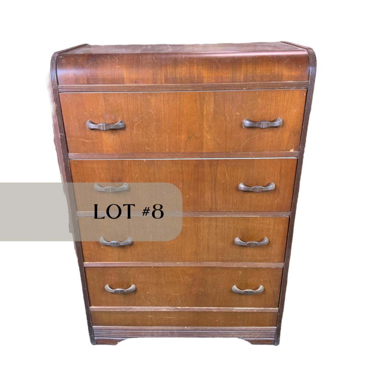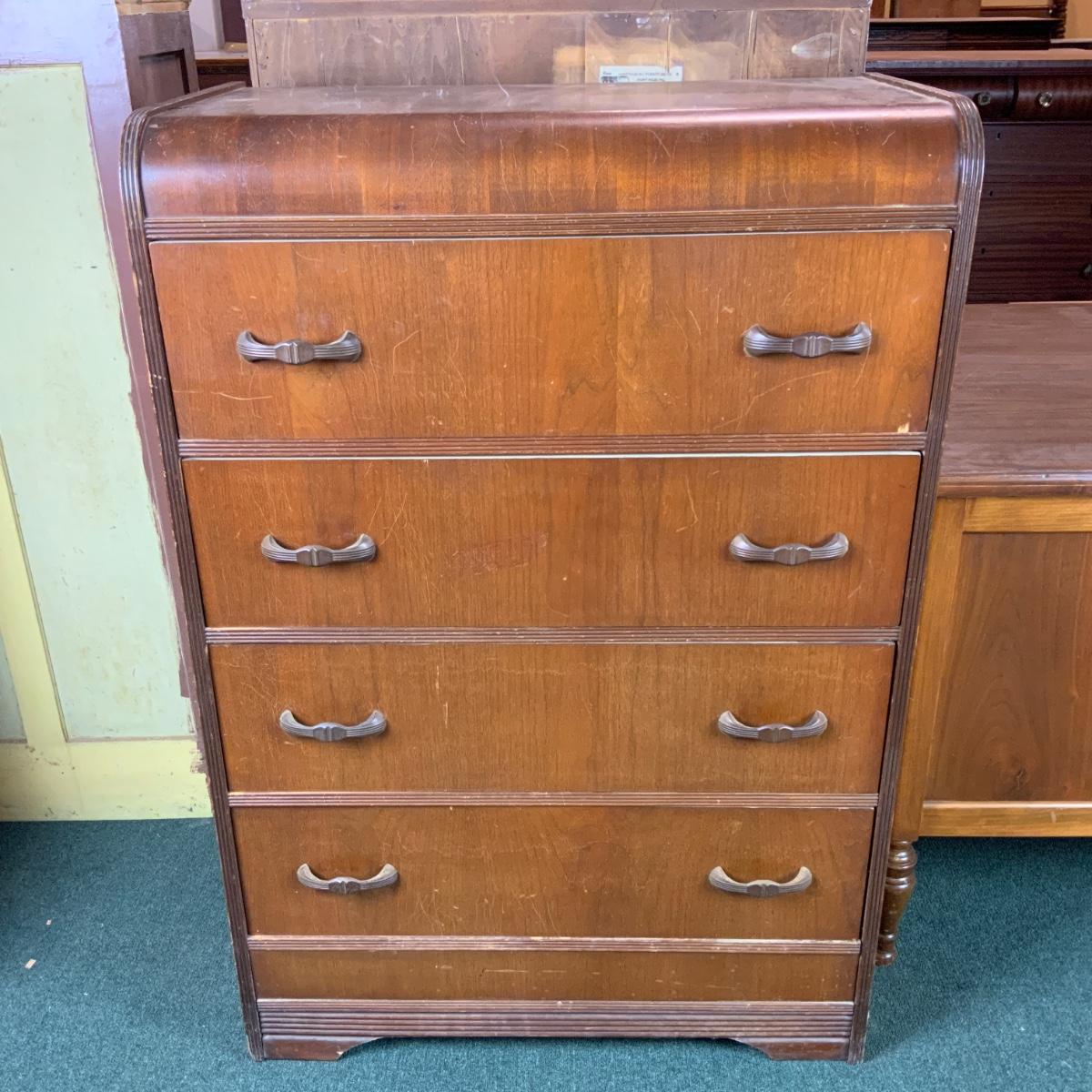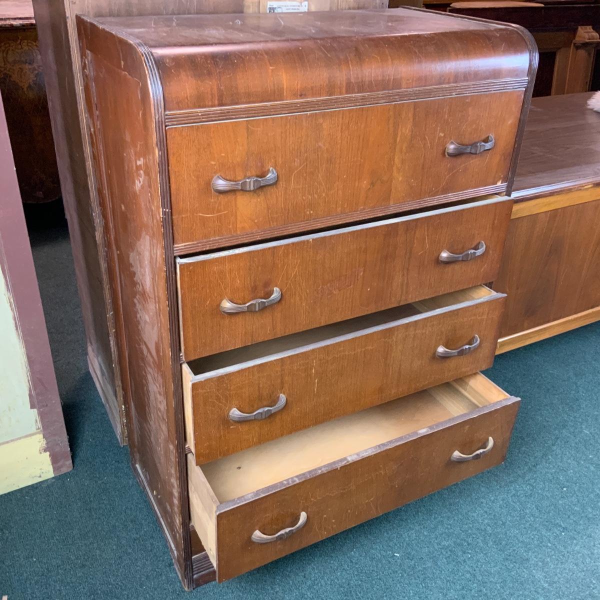 Beautiful Art Deco Waterfall Dresser with dove-tailed drawers. Veneer needs restoration. //::\\ Please see photos for details and condition. No attempt has been made to hide any imperfections. All items listed in this auction are warehouse items, and need to be cleaned. A majority of the items need restoration as well. All items are sold AS IS and WITHOUT GUARANTEE. If you are uncertain about an item, DO NOT BID. Due to the nature of this online auction in-person inspection is HIGHLY recommended. All Sales are FINAL. Pick Up Times are FIRM. Please confirm with your own schedule that you can pick up in the scheduled times listed in the Terms and Conditions. Any questions please message the auctioneer. DO NOT Contact The Harp Gallery.