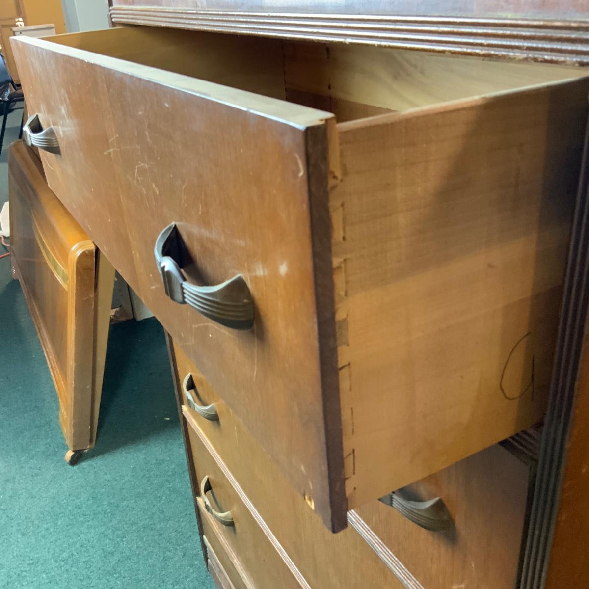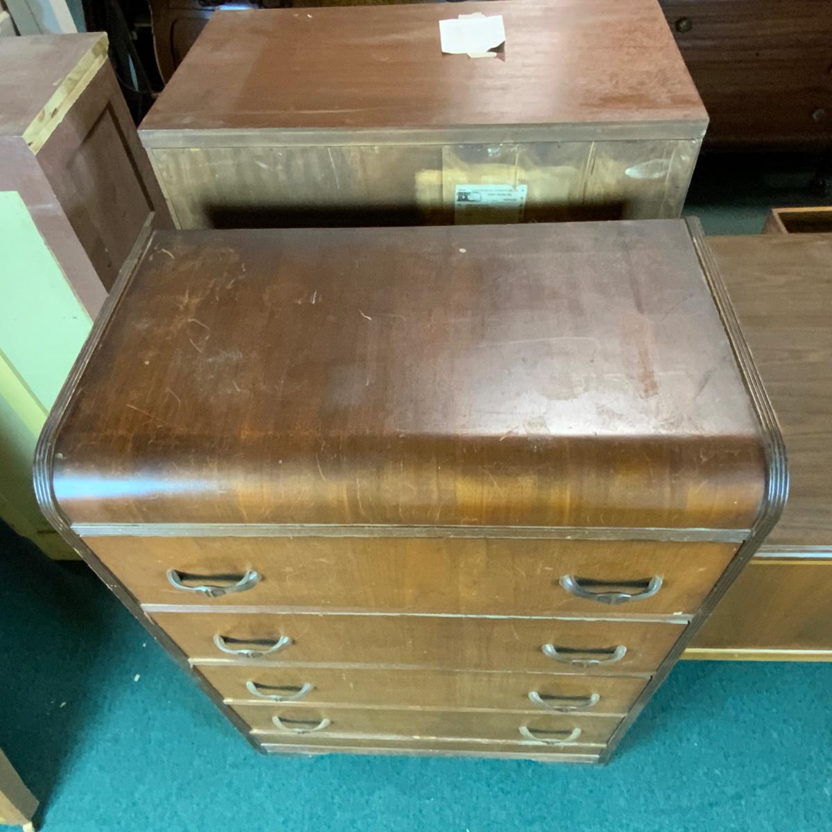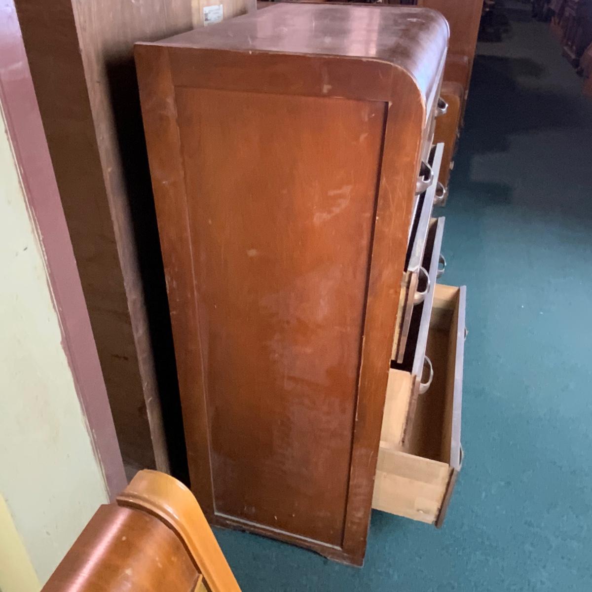 Beautiful Art Deco Waterfall Dresser with dove-tailed drawers. Veneer needs restoration. //::\\ Please see photos for details and condition. No attempt has been made to hide any imperfections. All items listed in this auction are warehouse items, and need to be cleaned. A majority of the items need restoration as well. All items are sold AS IS and WITHOUT GUARANTEE. If you are uncertain about an item, DO NOT BID. Due to the nature of this online auction in-person inspection is HIGHLY recommended. All Sales are FINAL. Pick Up Times are FIRM. Please confirm with your own schedule that you can pick up in the scheduled times listed in the Terms and Conditions. Any questions please message the auctioneer. DO NOT Contact The Harp Gallery.