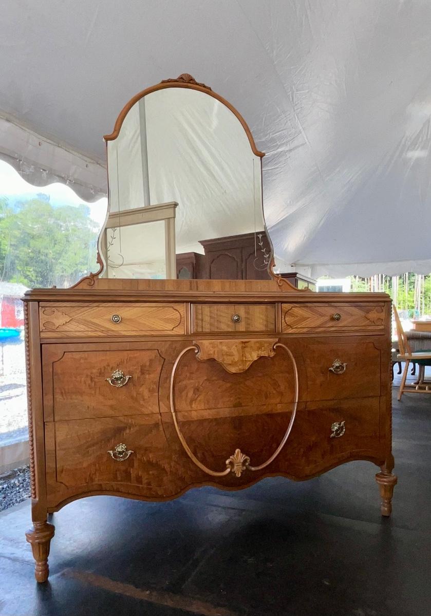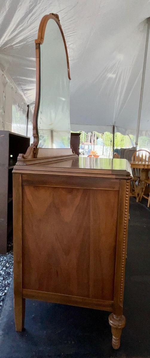 Lot# 010 Antique Walnut/Veneer Wooden 5 Drawer Dresser with Detachable Beveled Mirror
