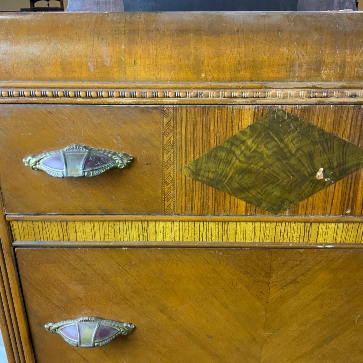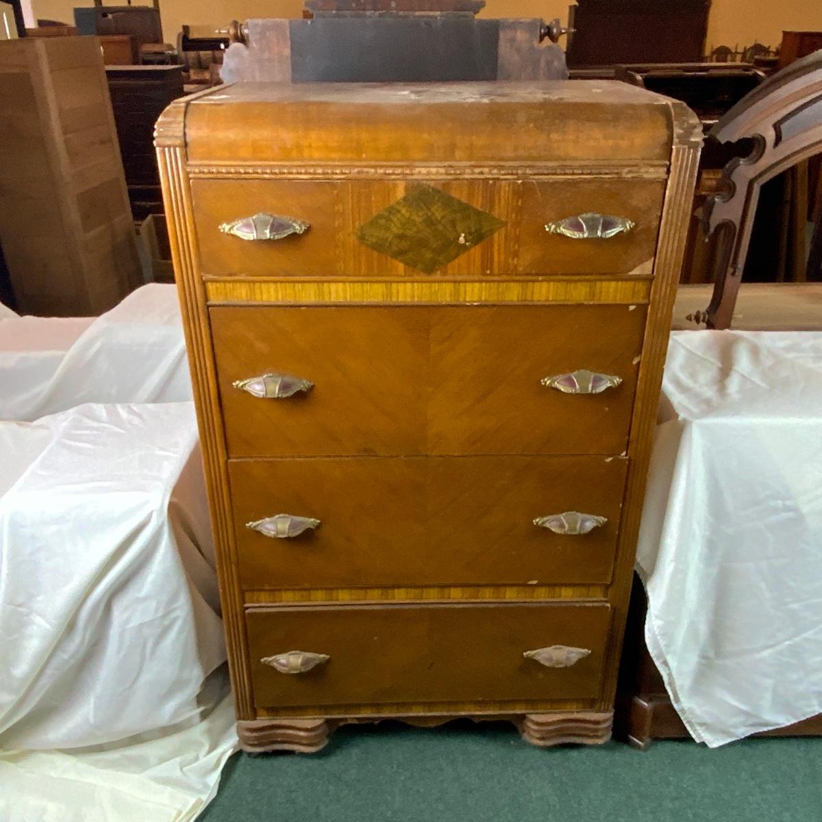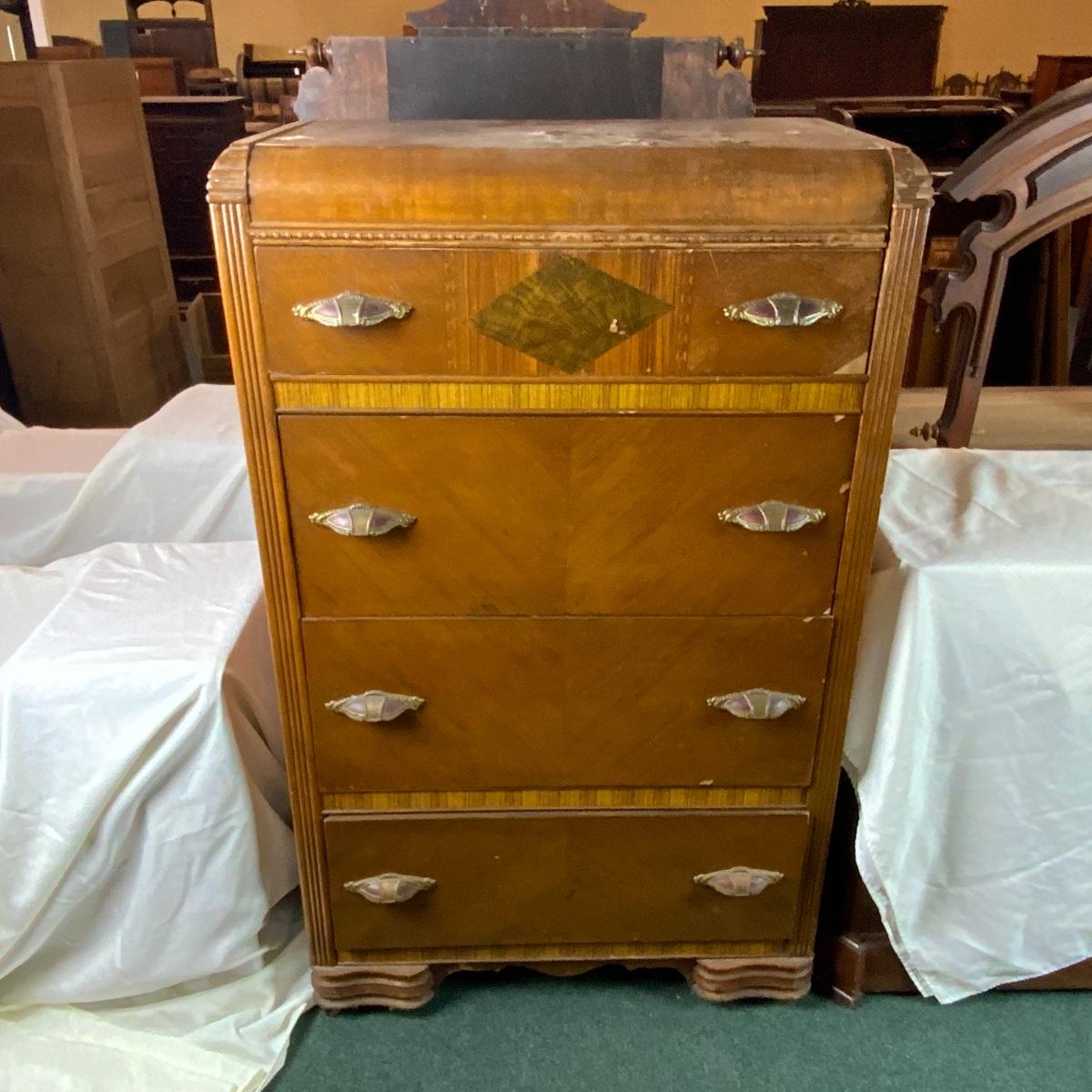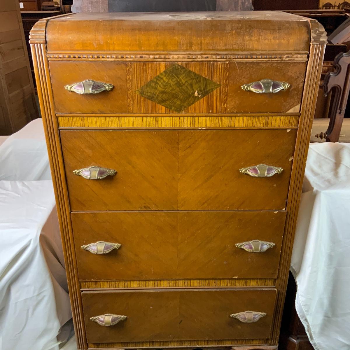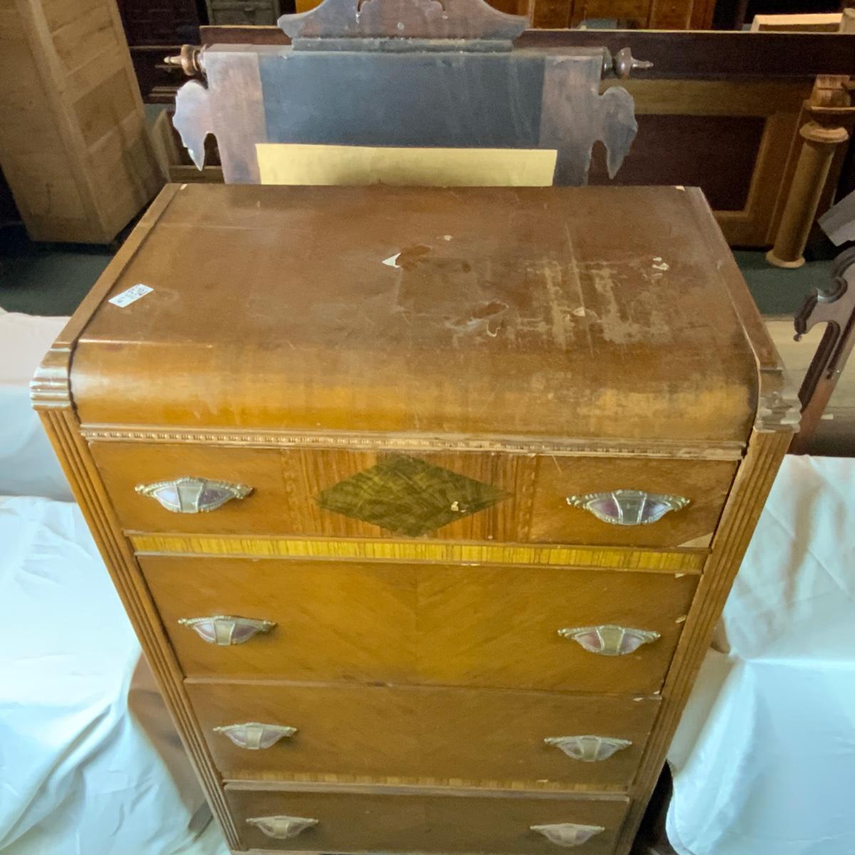 Attractive Art Deco Waterfall Chest with dovetailed drawers. Back left foot needs to be replaced, as it has gone missing. //::\\ Please see photos for details and condition. No attempt has been made to hide any imperfections. All items listed in this auction are warehouse items, and need to be cleaned. A majority of the items need restoration as well. All items are sold AS IS and WITHOUT GUARANTEE. If you are uncertain about an item, DO NOT BID. Due to the nature of this online auction in-person inspection is HIGHLY recommended. All Sales are FINAL. Pick Up Times are FIRM. Please confirm with your own schedule that you can pick up in the scheduled times listed in the Terms and Conditions. Any questions please message the auctioneer. DO NOT Contact The Harp Gallery.