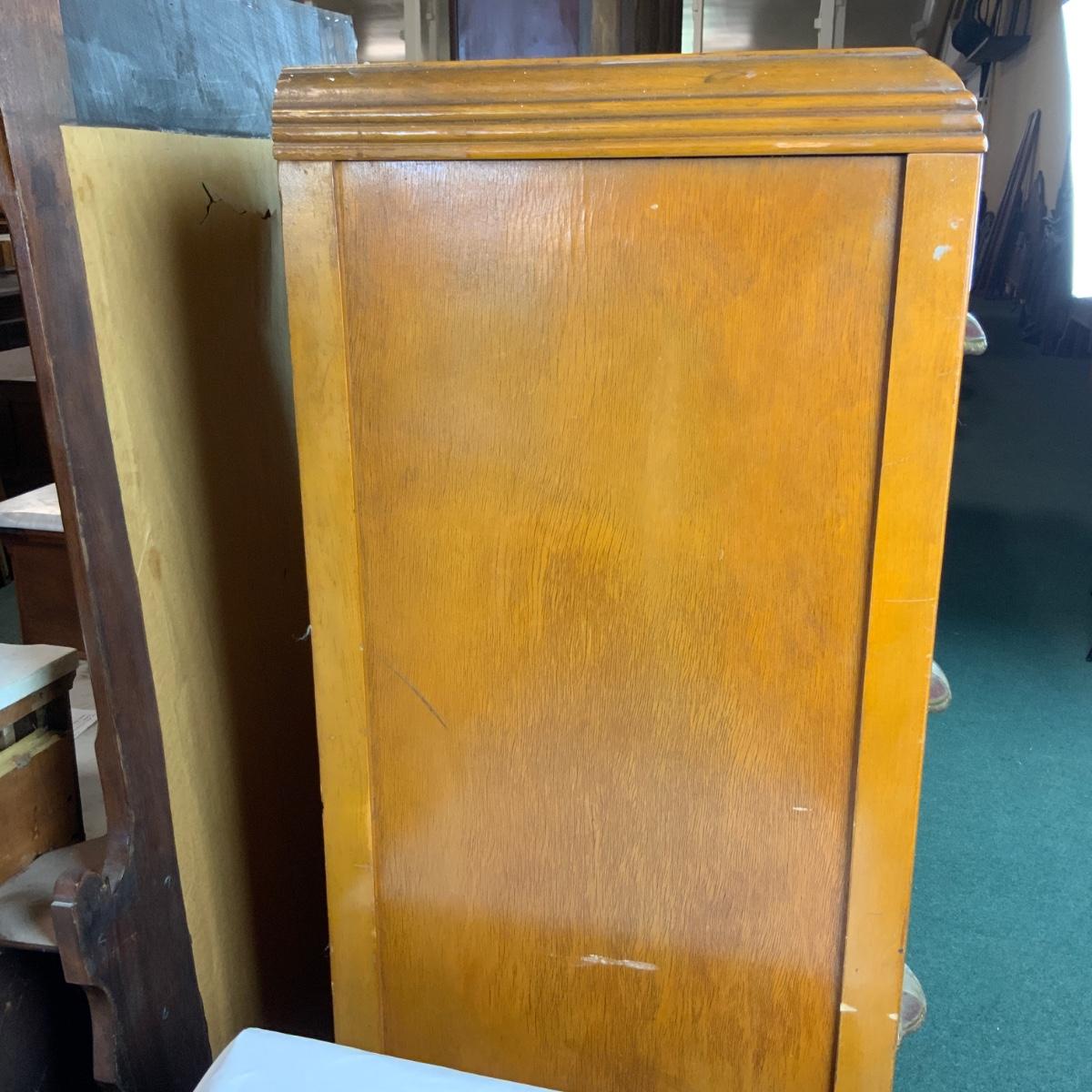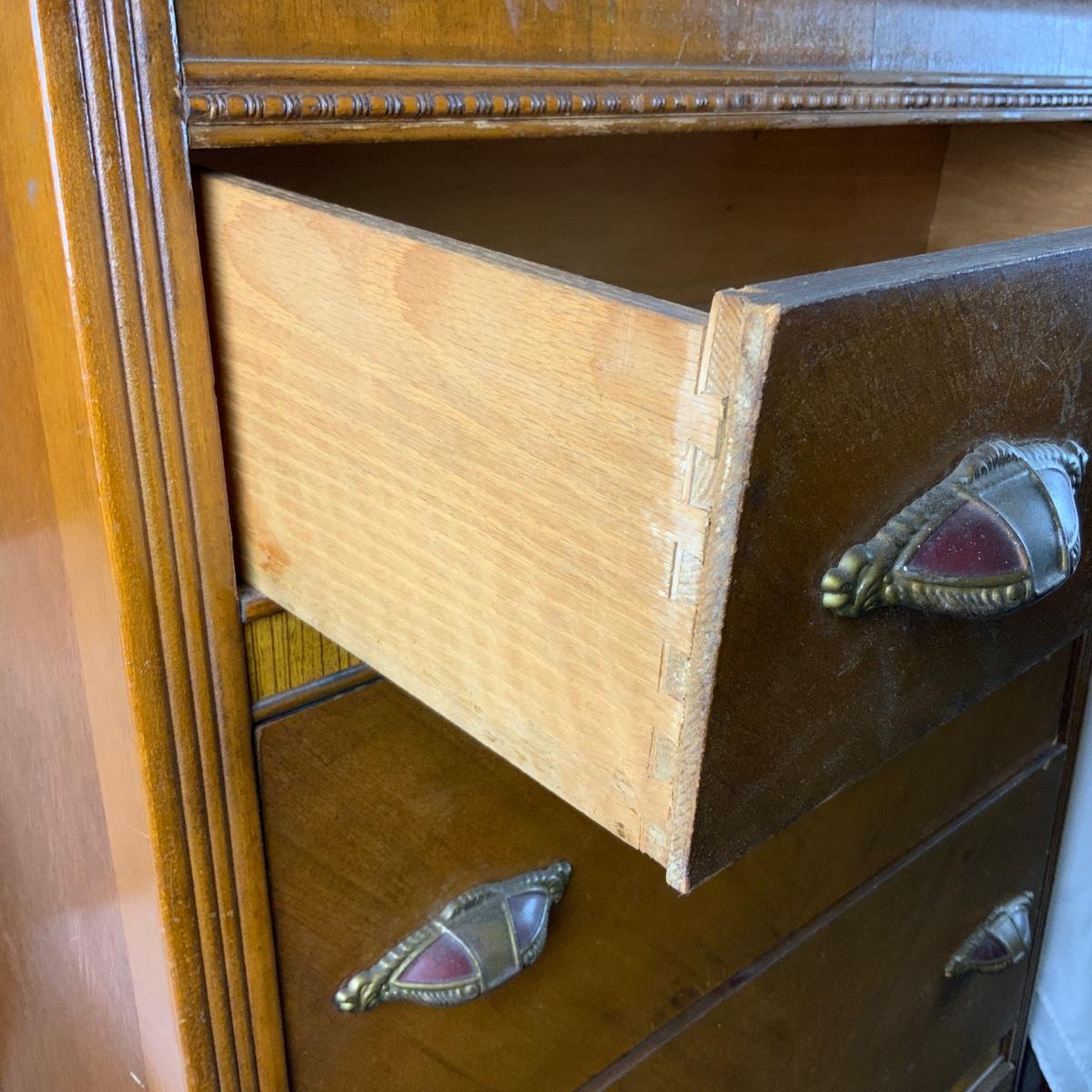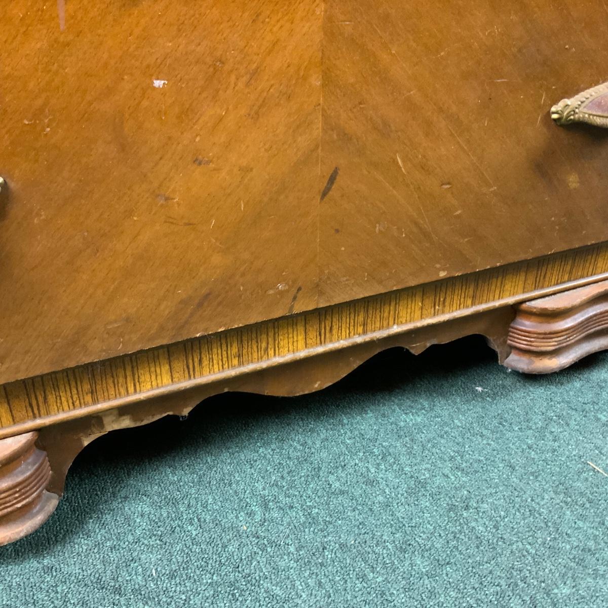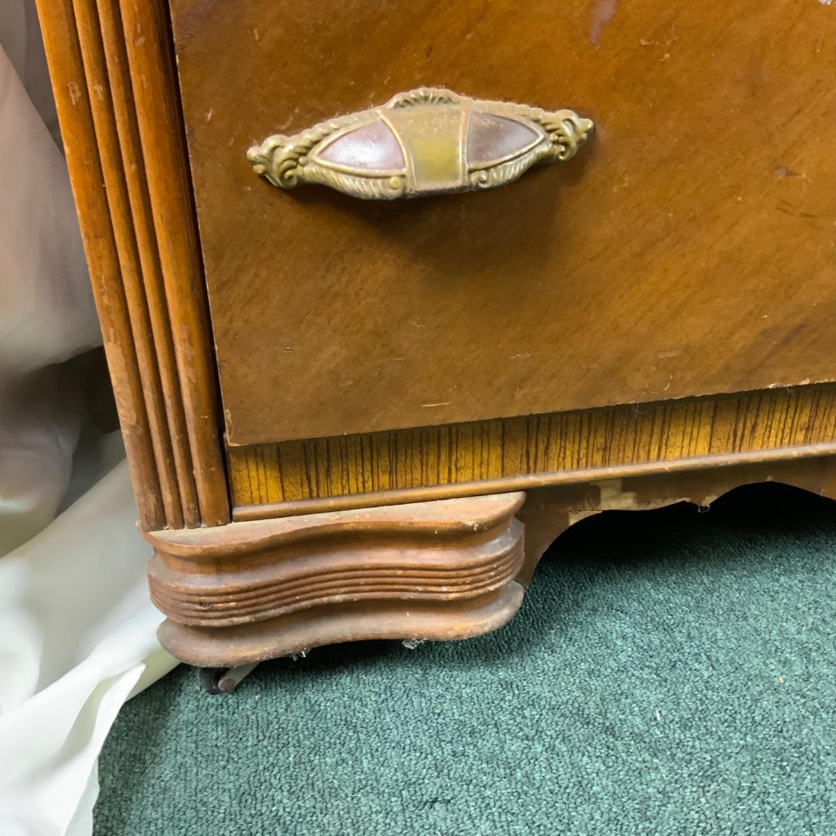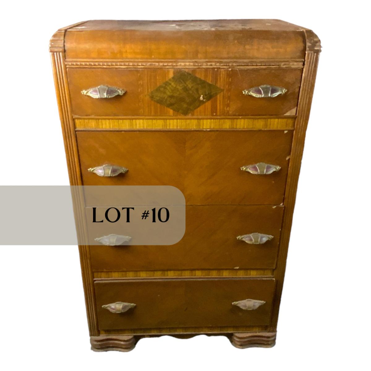 Attractive Art Deco Waterfall Chest with dovetailed drawers. Back left foot needs to be replaced, as it has gone missing. //::\\ Please see photos for details and condition. No attempt has been made to hide any imperfections. All items listed in this auction are warehouse items, and need to be cleaned. A majority of the items need restoration as well. All items are sold AS IS and WITHOUT GUARANTEE. If you are uncertain about an item, DO NOT BID. Due to the nature of this online auction in-person inspection is HIGHLY recommended. All Sales are FINAL. Pick Up Times are FIRM. Please confirm with your own schedule that you can pick up in the scheduled times listed in the Terms and Conditions. Any questions please message the auctioneer. DO NOT Contact The Harp Gallery.
