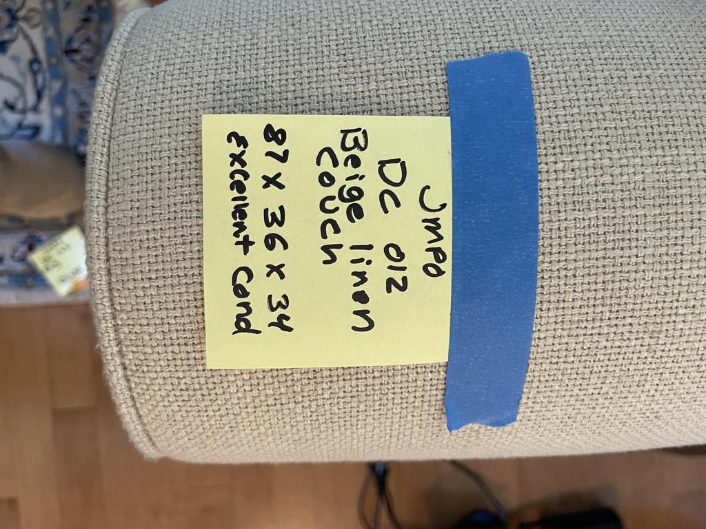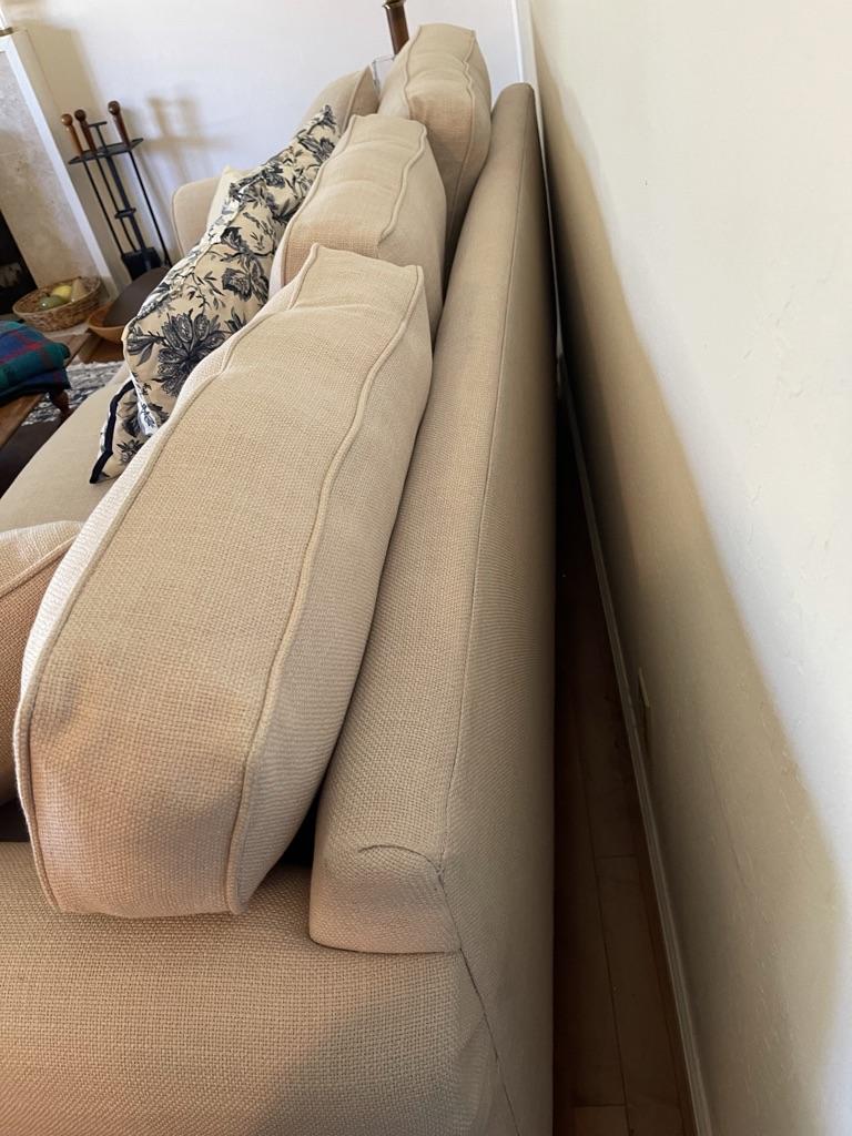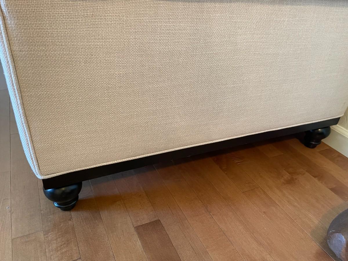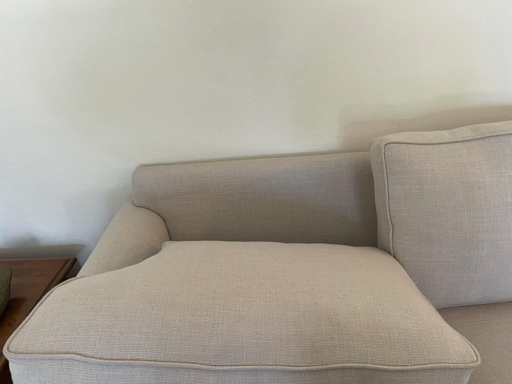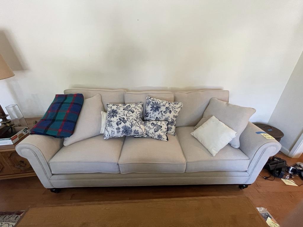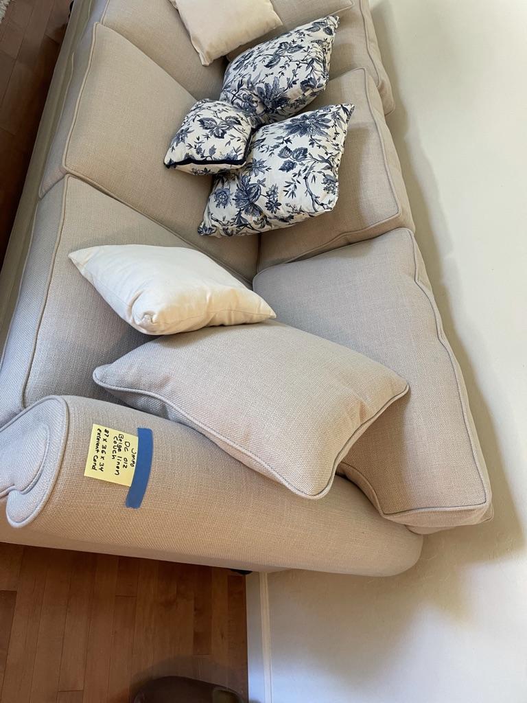 3 seat and back cushions, linen fabric, piped edged cushions, scrolled arms, dark wood bottom trim. 2 matching pillow, 5 decor pillows. No obvious stains or damage. Great condition.
