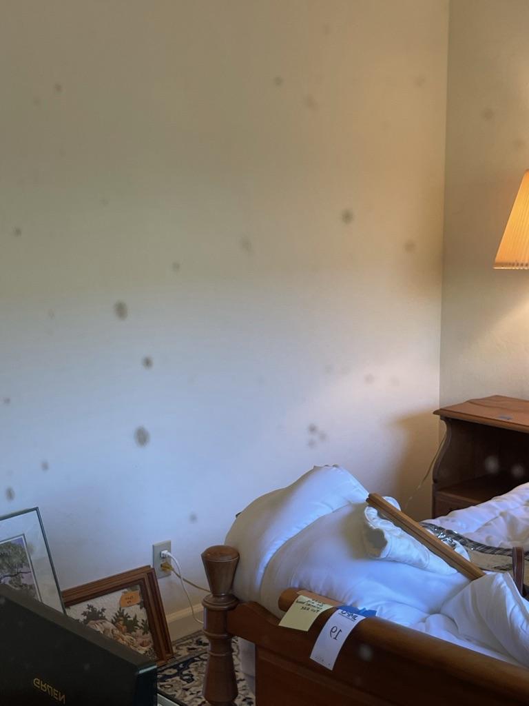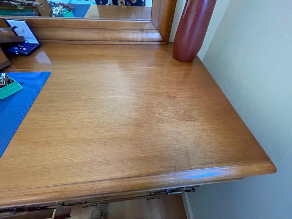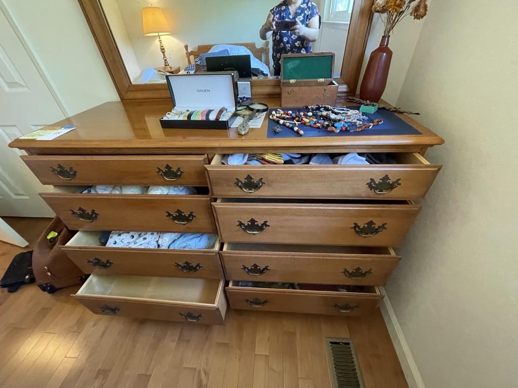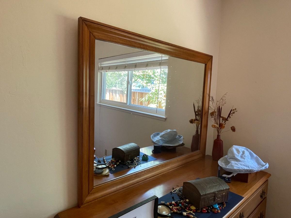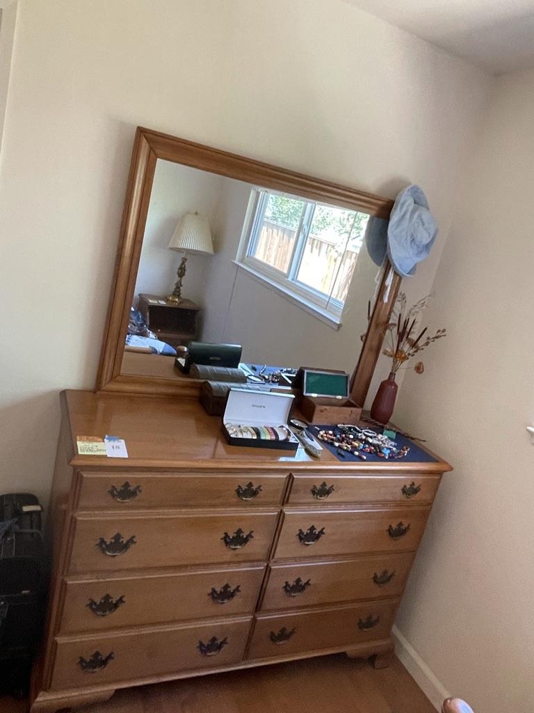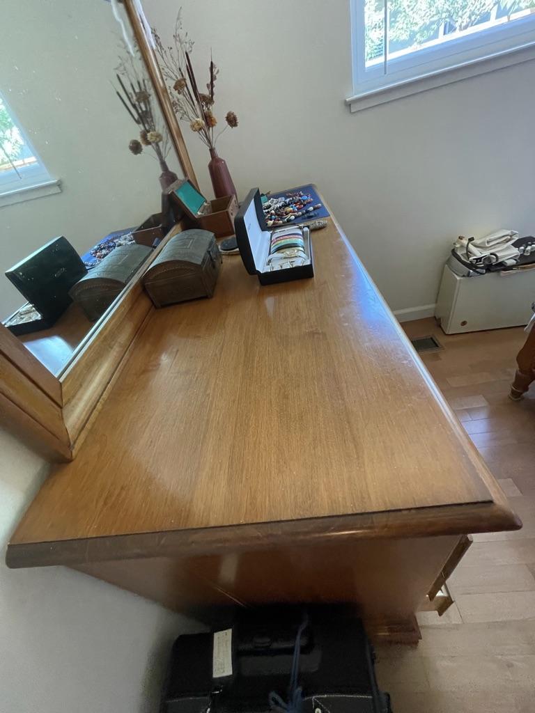 Bring tools to detach mirror - bring hand truck/help to carry out dresser.