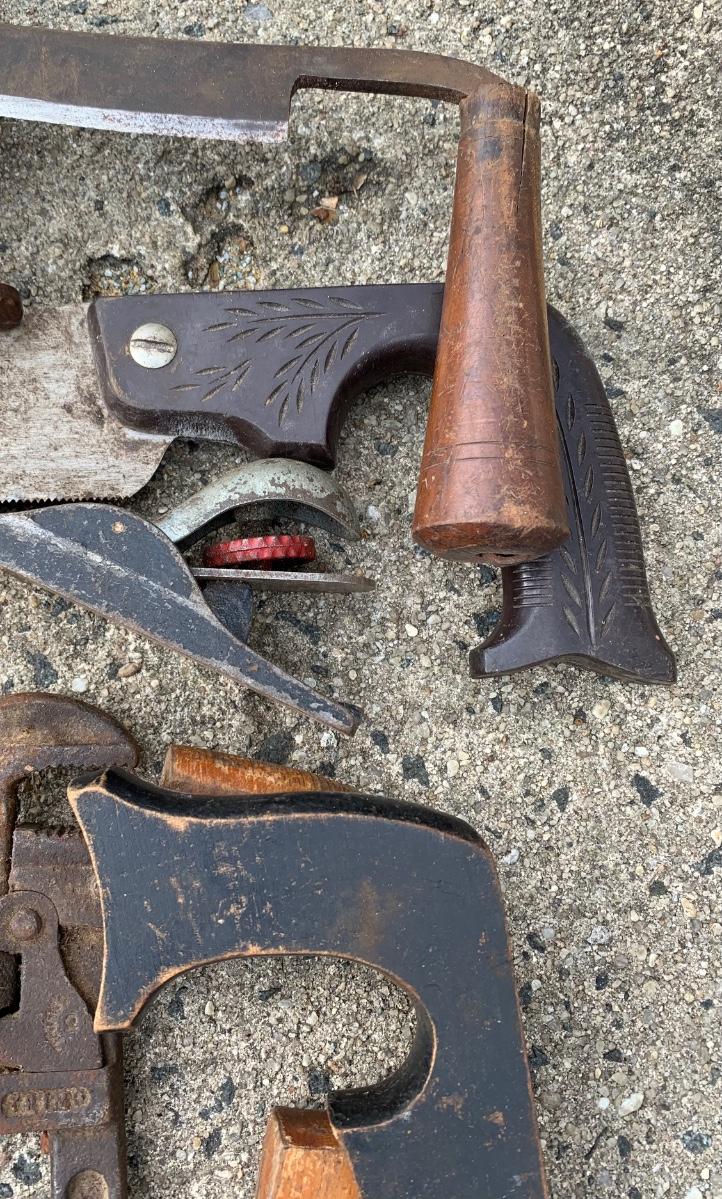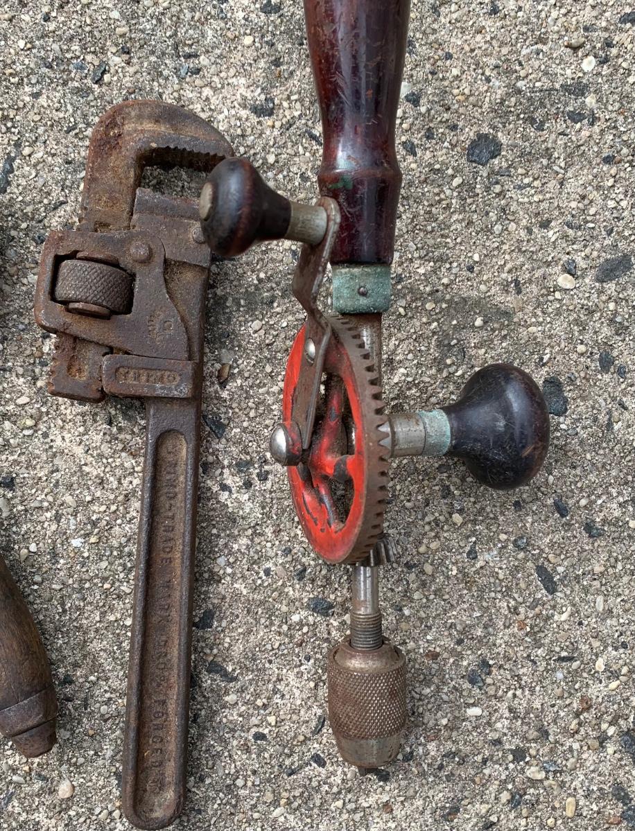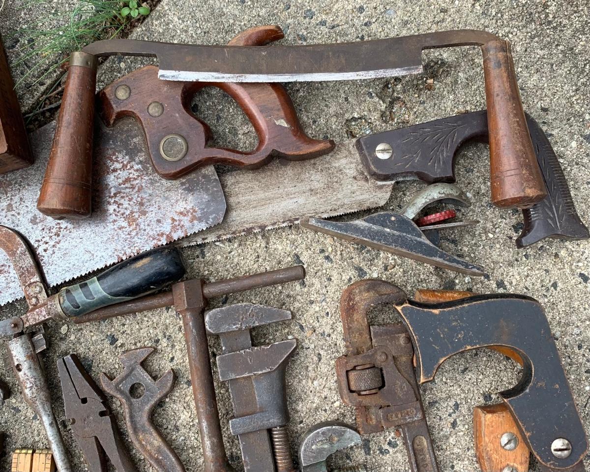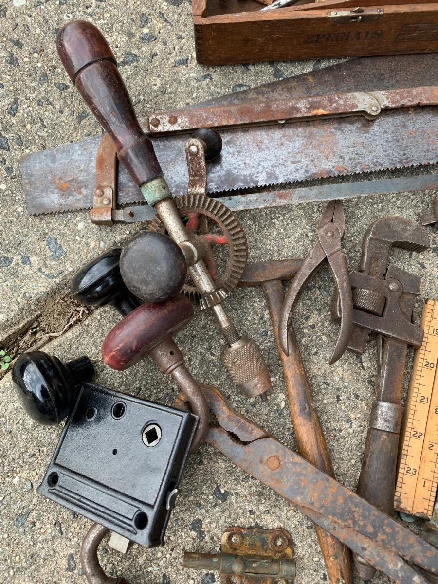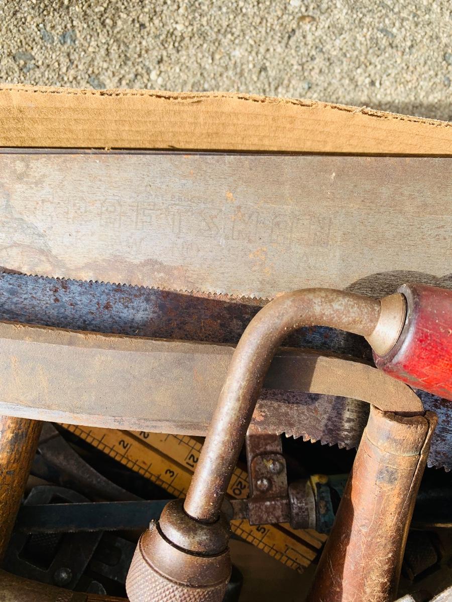 A lot to look at here vintage draw knife, craftsman hand saw, hand drill, window markers wrenches