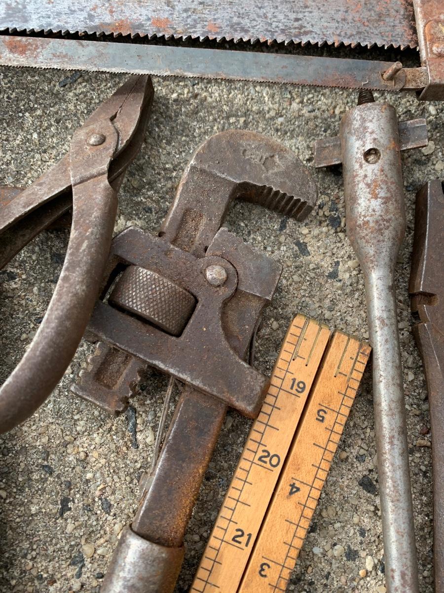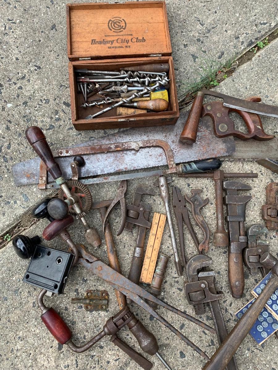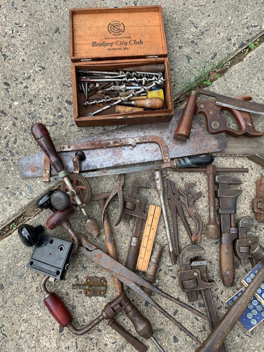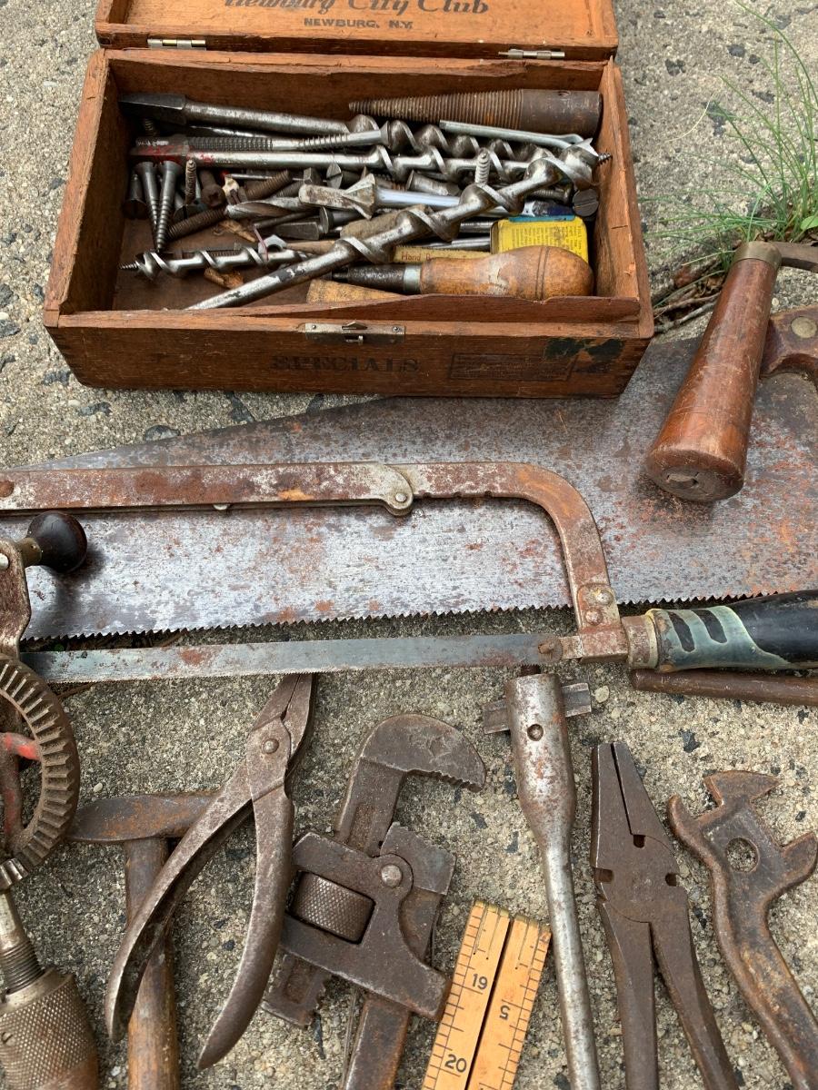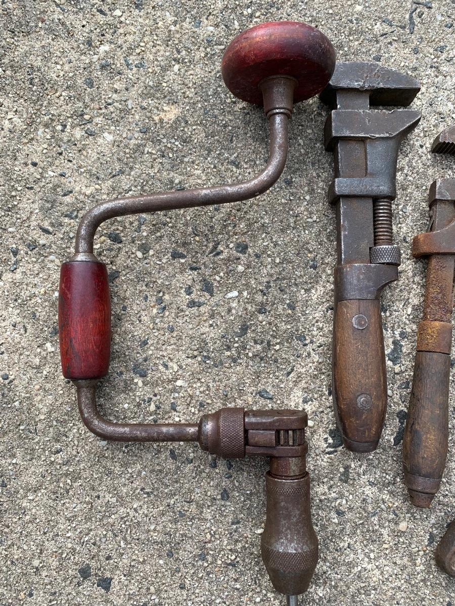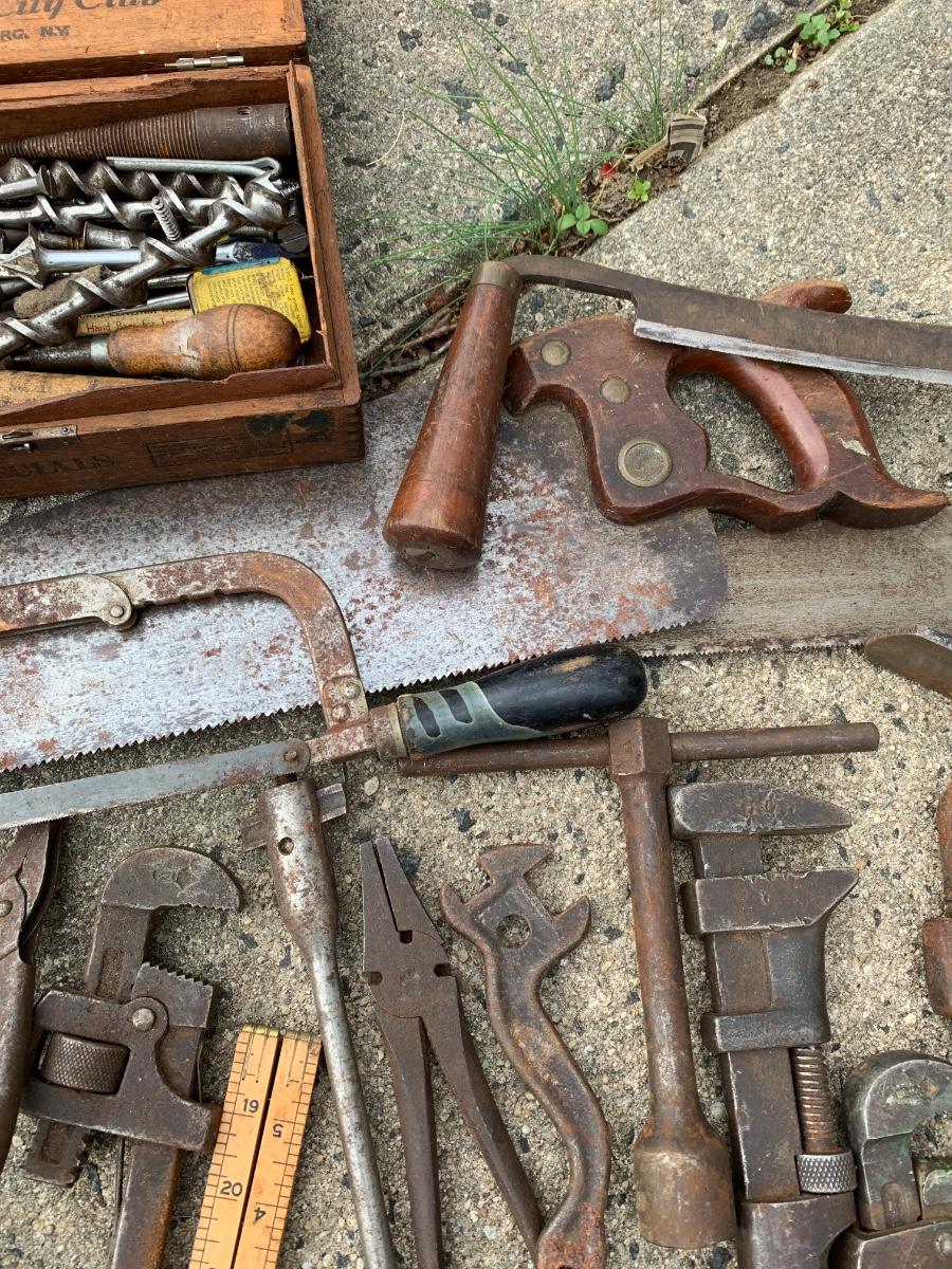 A lot to look at here vintage draw knife, craftsman hand saw, hand drill, window markers wrenches
