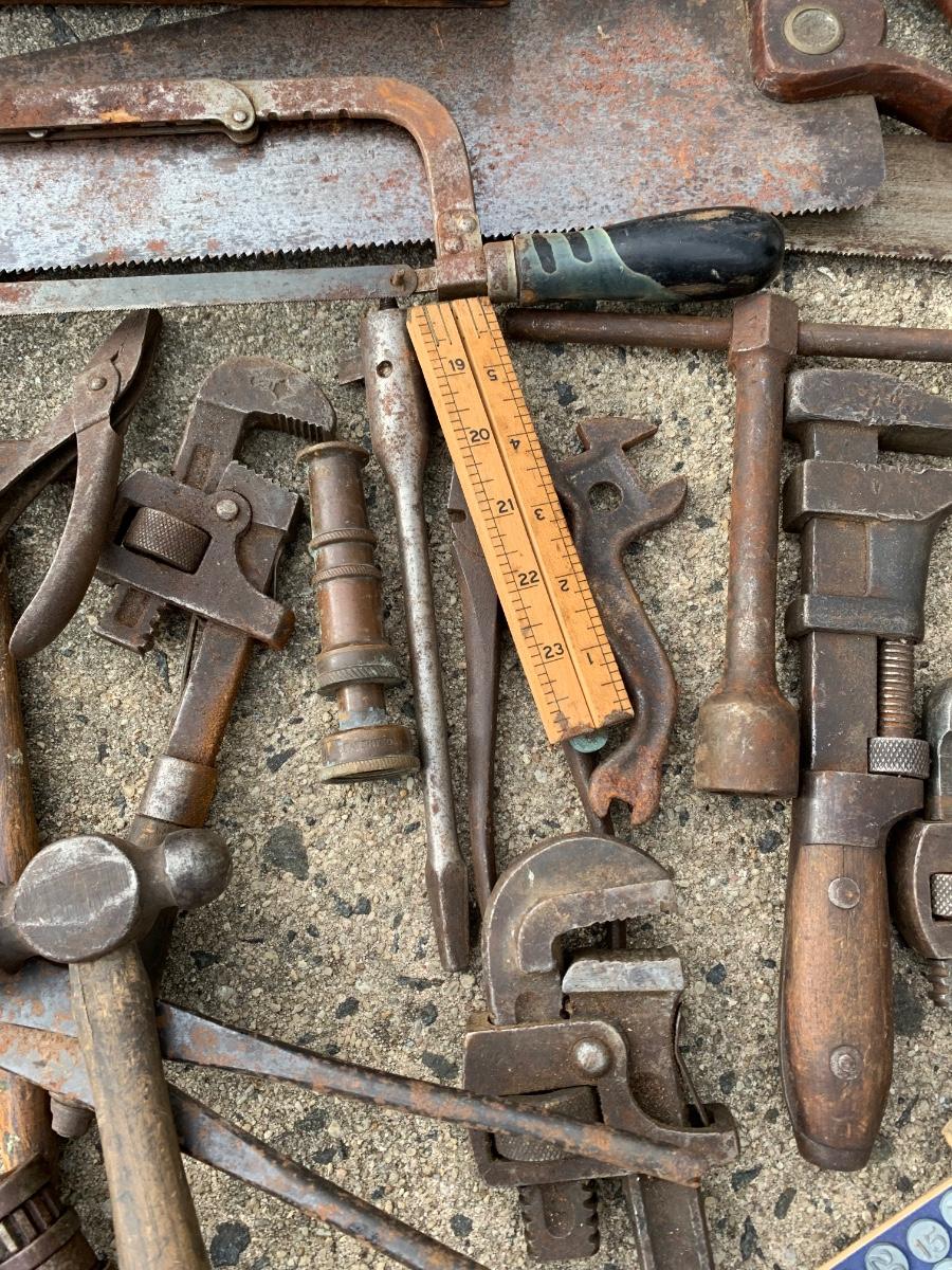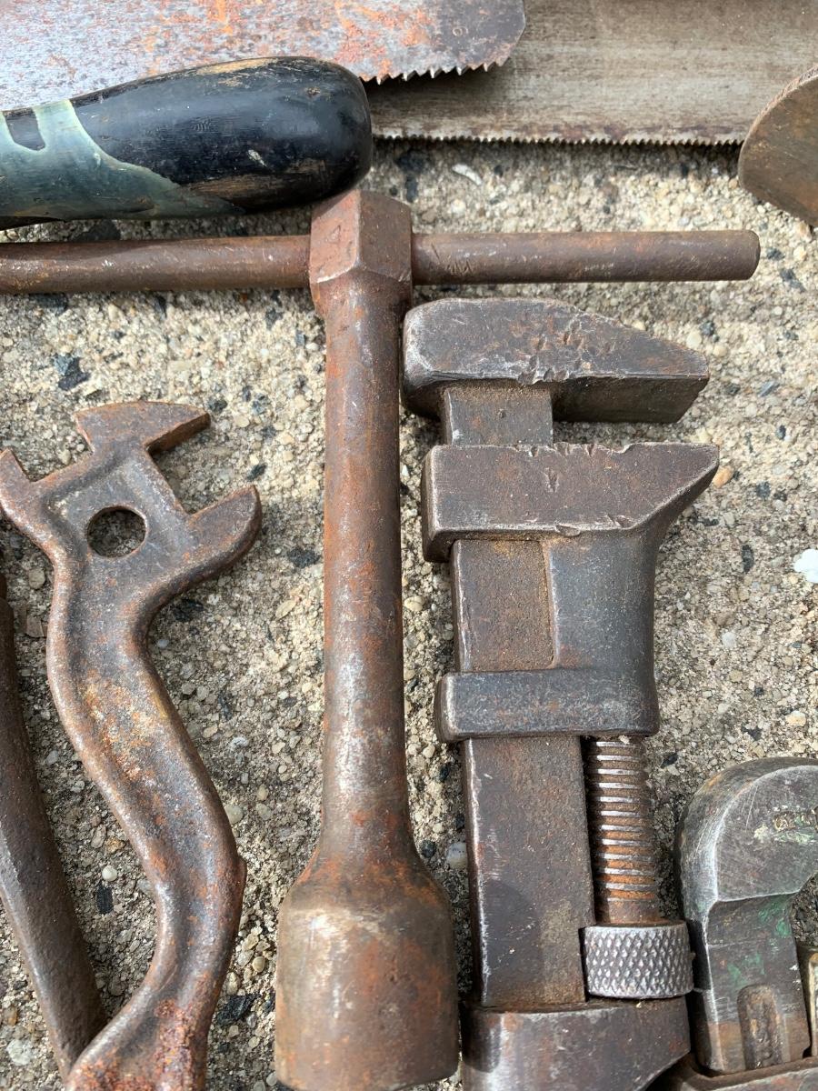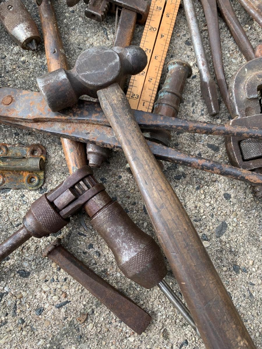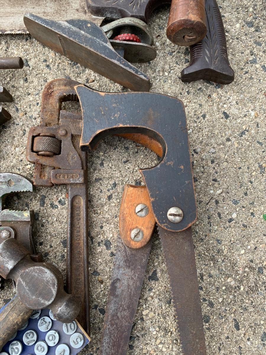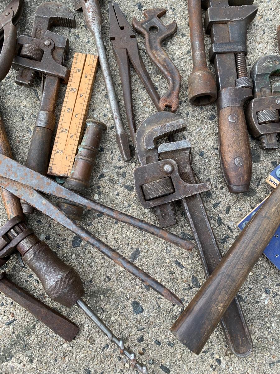 A lot to look at here vintage draw knife, craftsman hand saw, hand drill, window markers wrenches