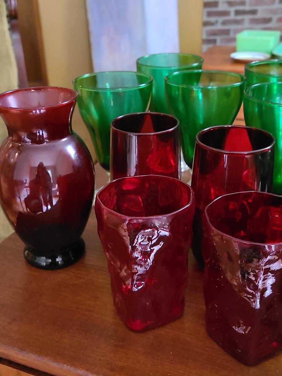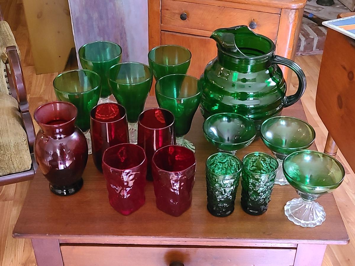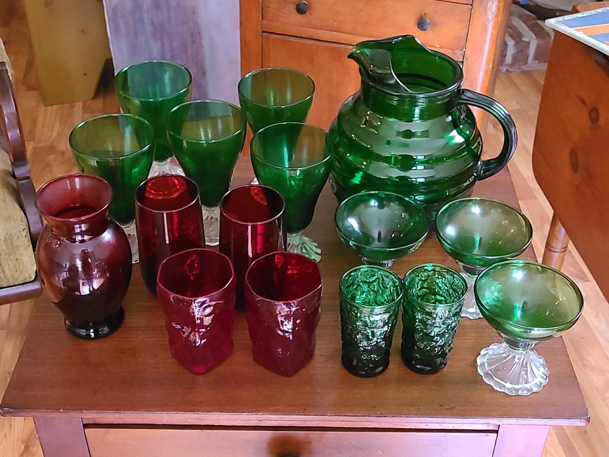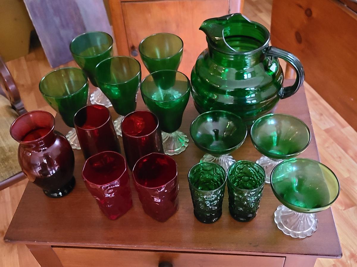 Lot 019: Vintage Ruby Red & Green Glassware (Pitcher, Vase, Glasses and More)
