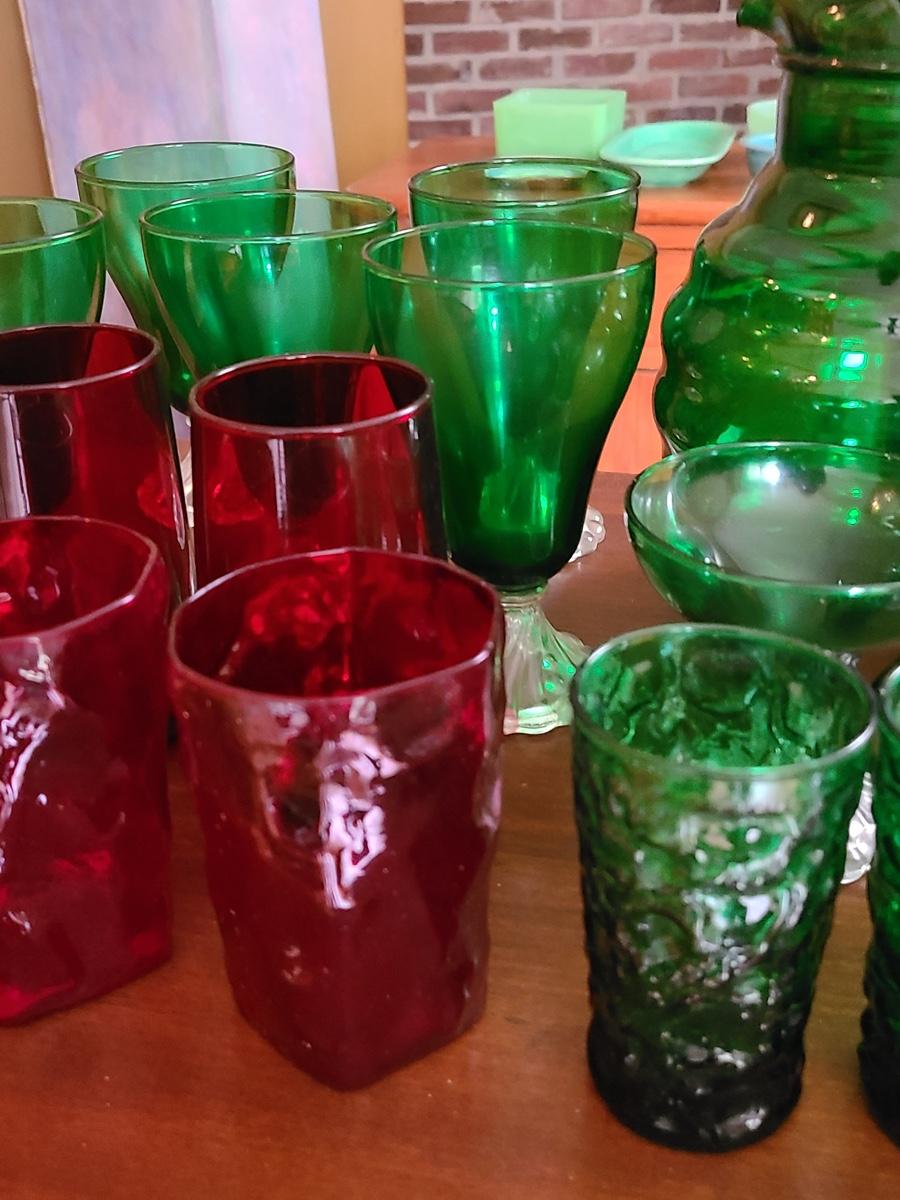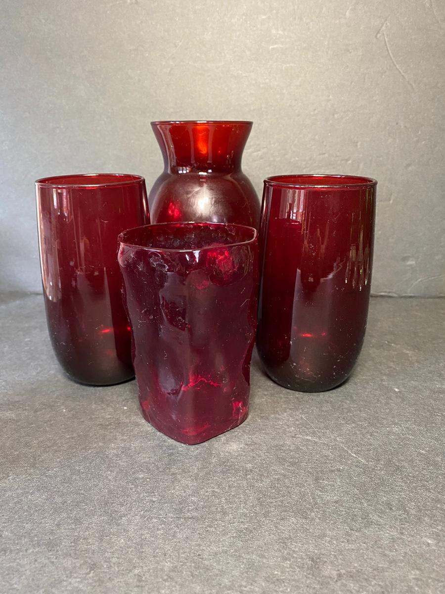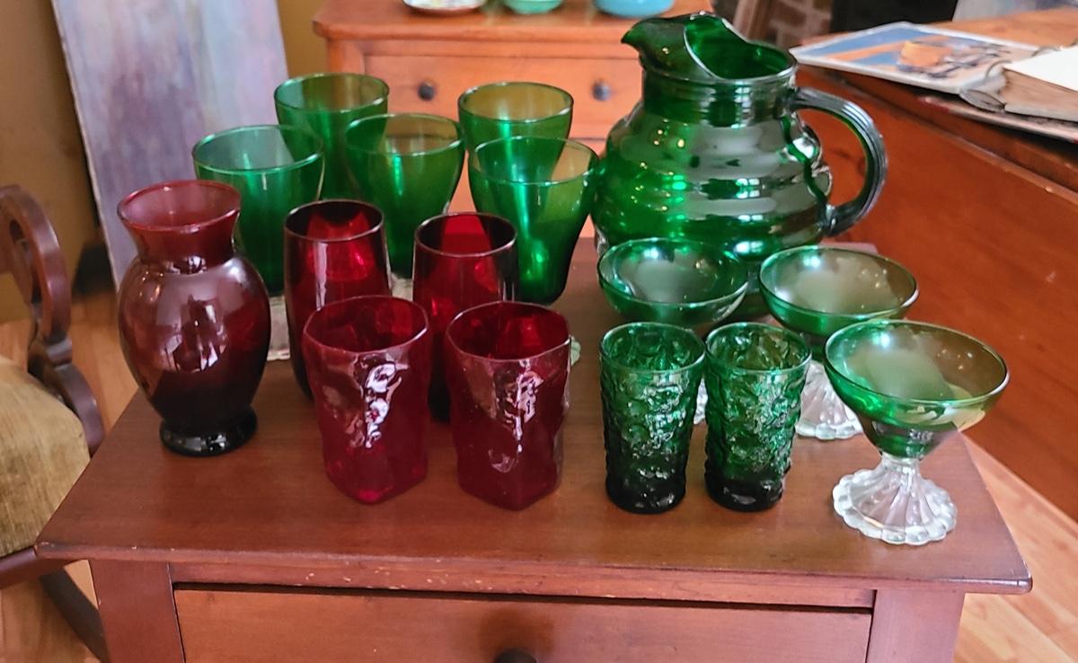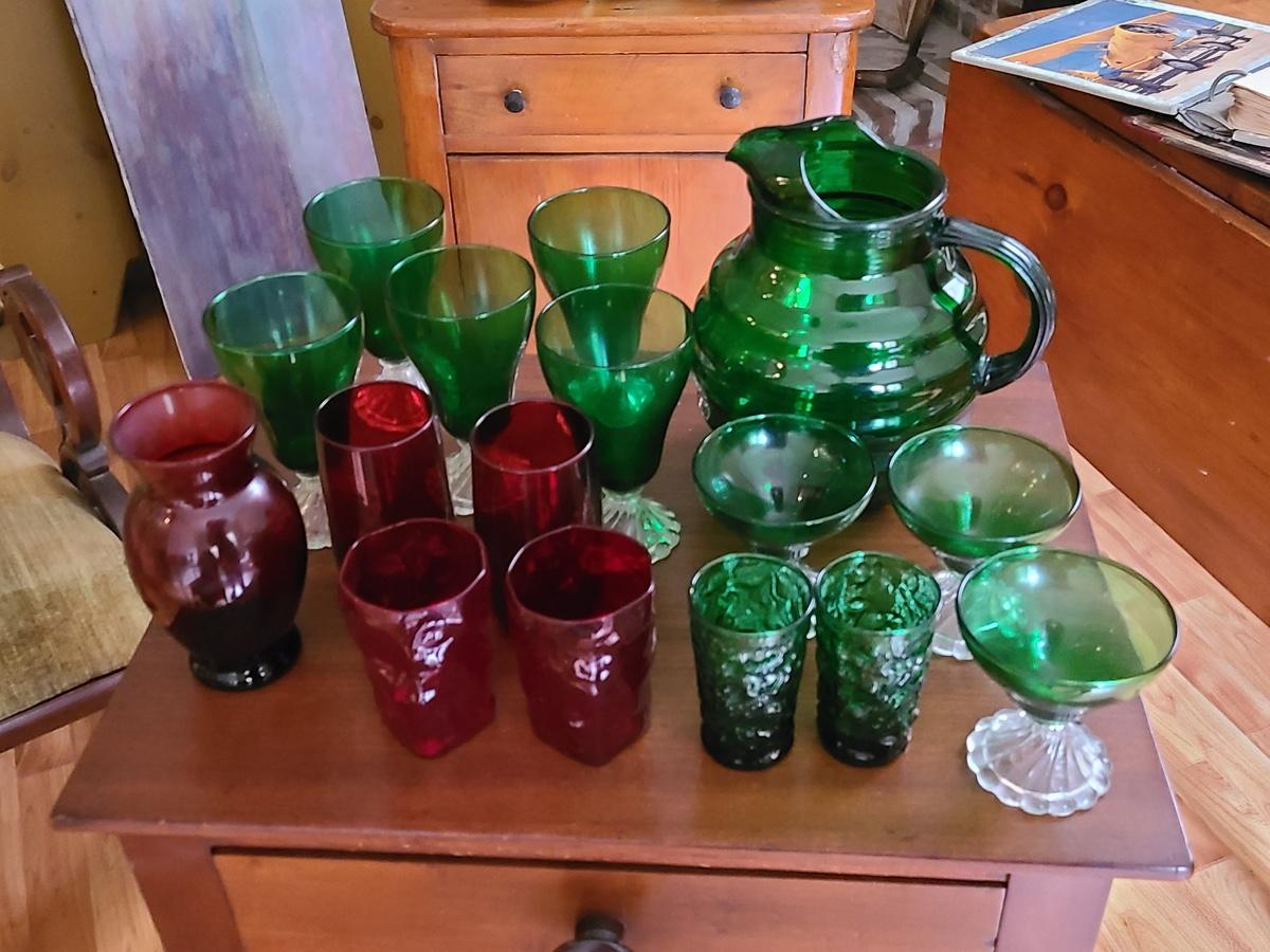 Lot 019: Vintage Ruby Red & Green Glassware (Pitcher, Vase, Glasses and More)