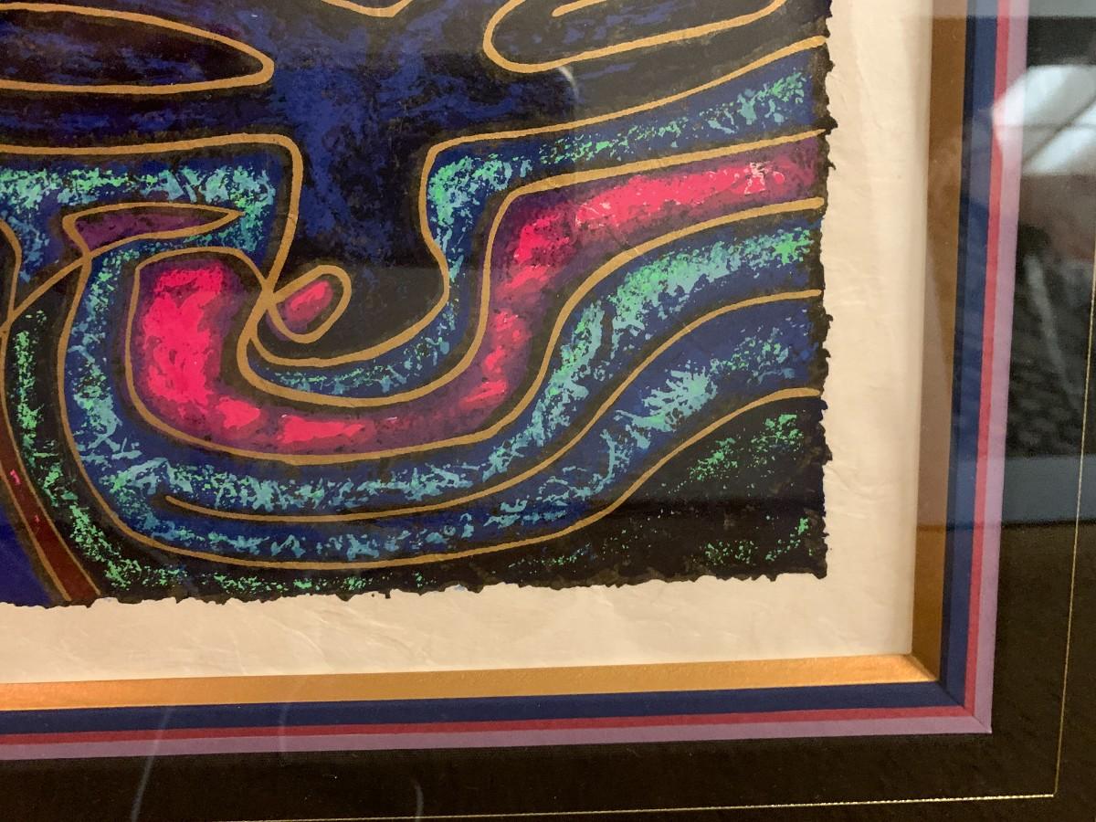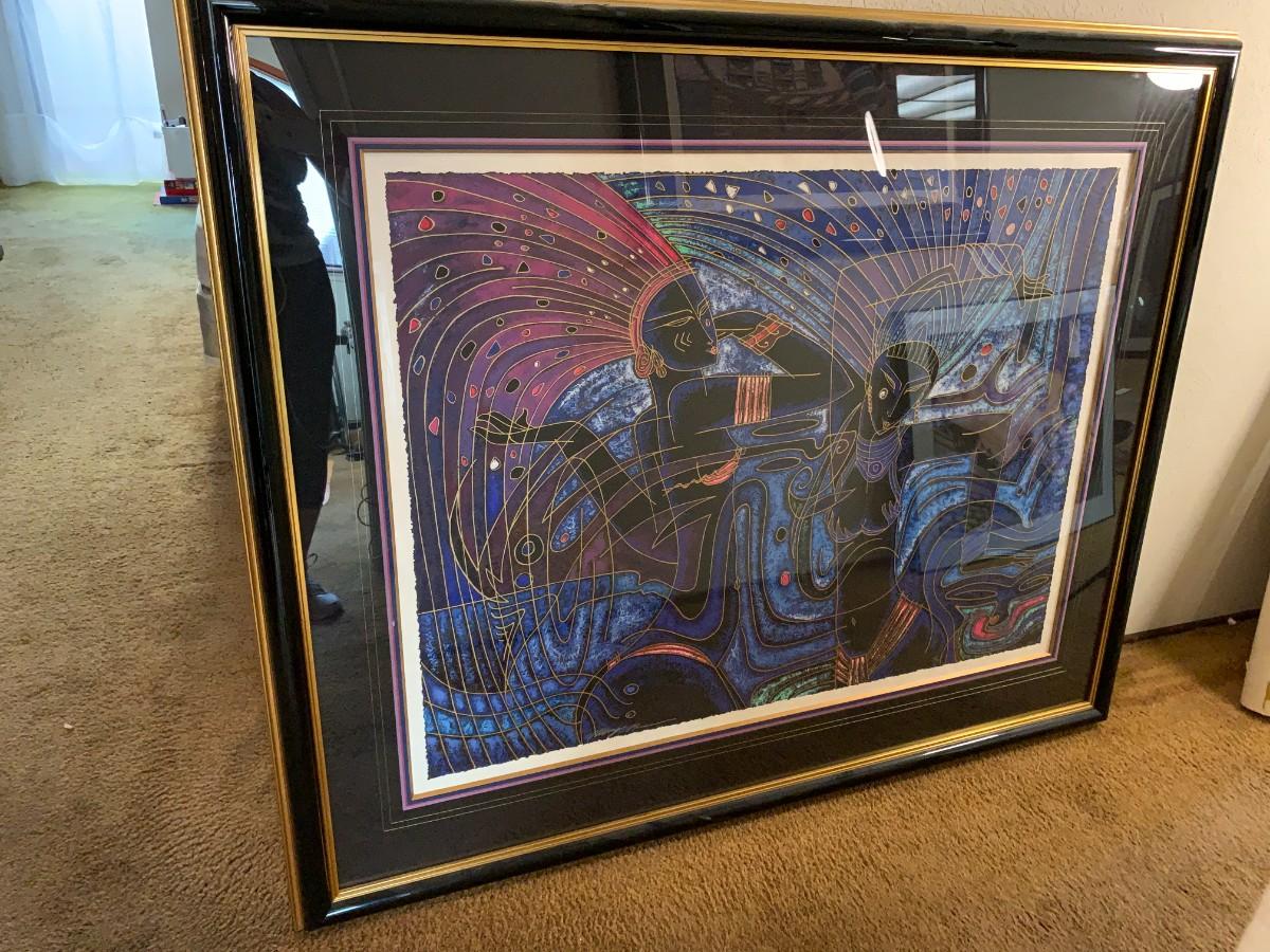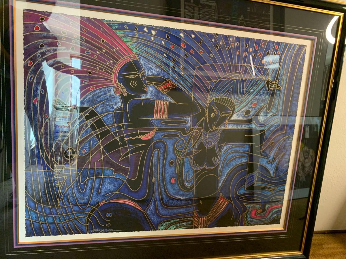 Adrian Wong Shue Serigraph: numbered and signed. 45x54” frame. Title: Sambistas. 1990. Edition: 54/300. Acrylic frame. Yunnan School art by Jamaican-Californian artist.