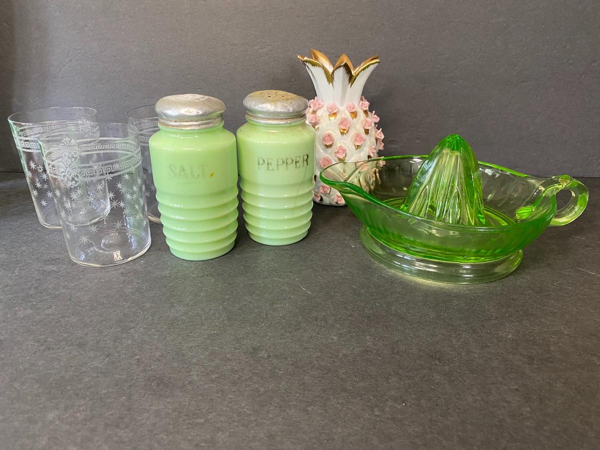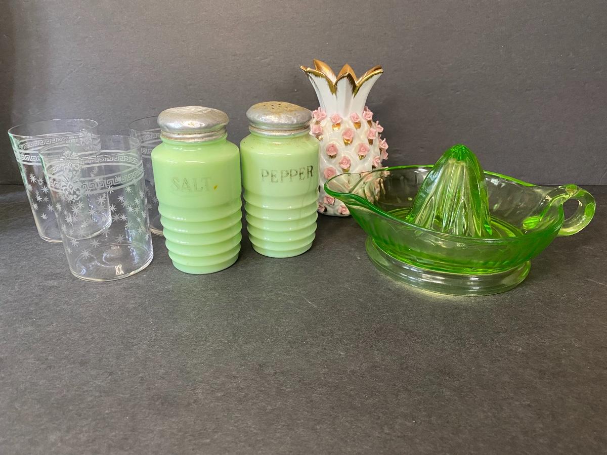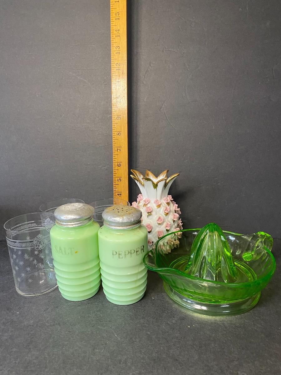 Jadeite salt and pepper shakers, Lefton China pineapple and more. Please see all pictures as they are the best representation of the items. The pictures show condition, measurements if taken, and what is included in the lot. Due to the large amount that we photograph and the time frame, we are not always able to take measurements. All items unless noted, are pre-owned and have been used. If you purchased furniture, you must bring help. We do not allow one person to carry large furniture out on their own. Bring help, tools and a truck for the safety of our client’s homes, and your personal safety. Company policy. Thank you.