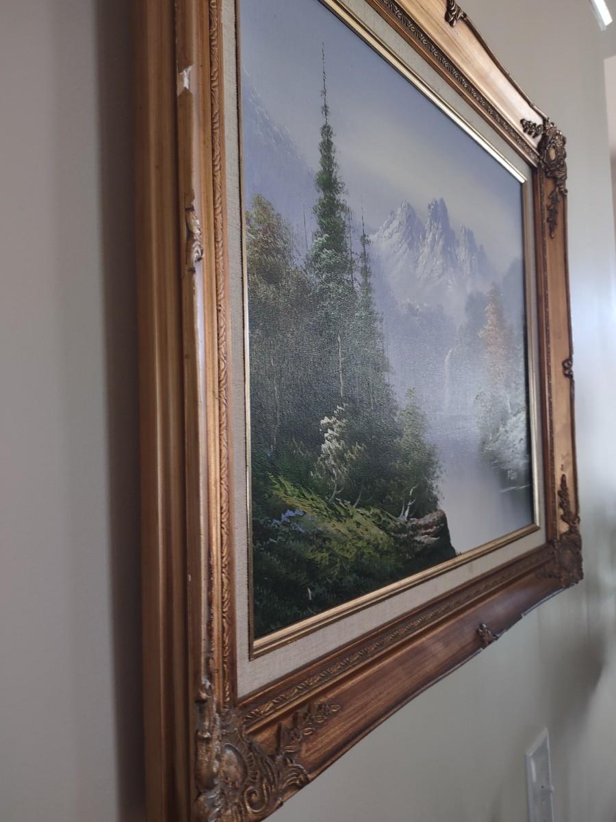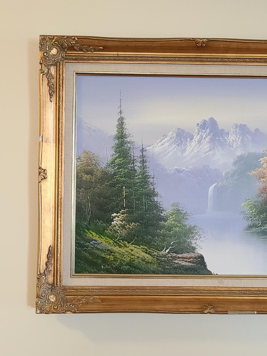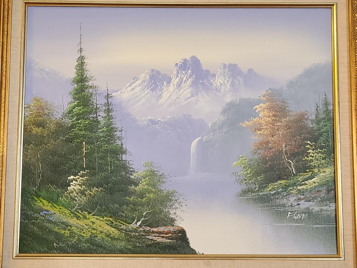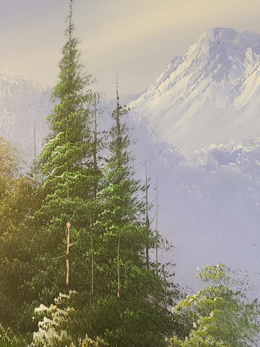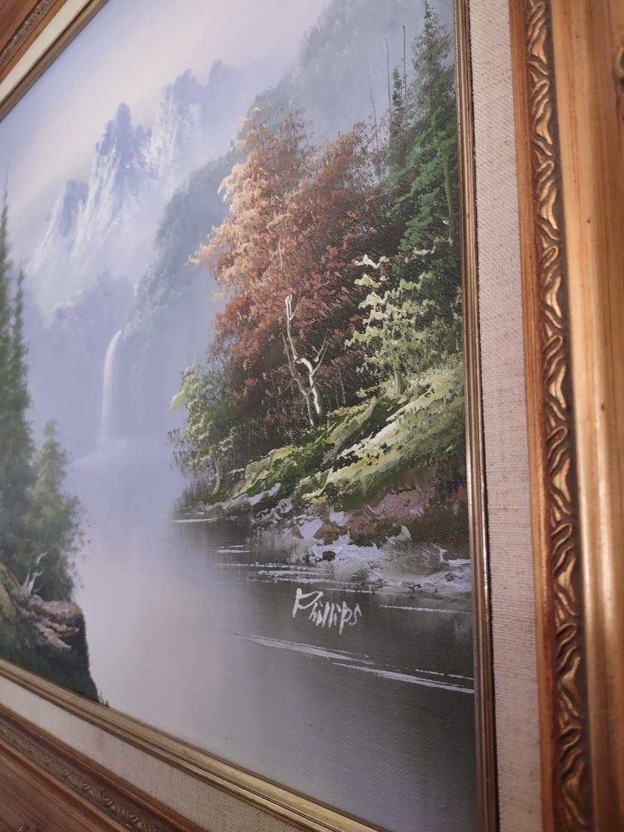 Mountain Landscape Artwork Artist Signed By Phillips 26×22"×2. This is on canvas and is a painting. Shown in early light where the picture is bright and airy; and evening light where it gives off an evening hue to the skyline.