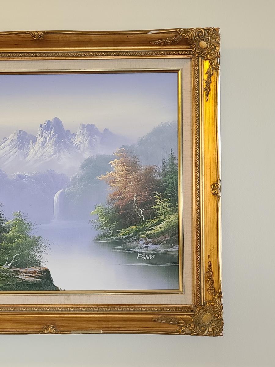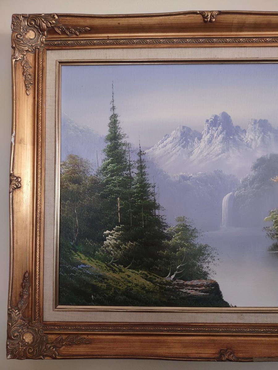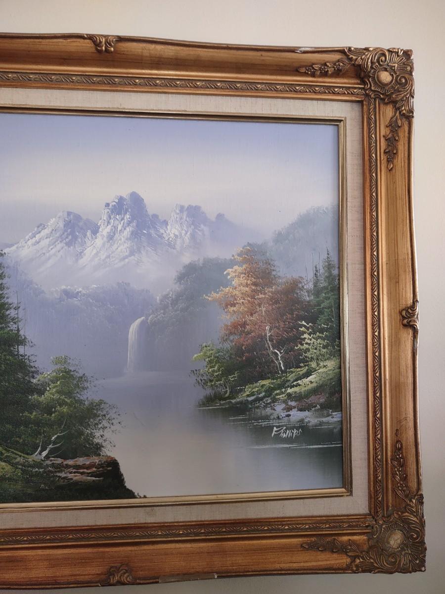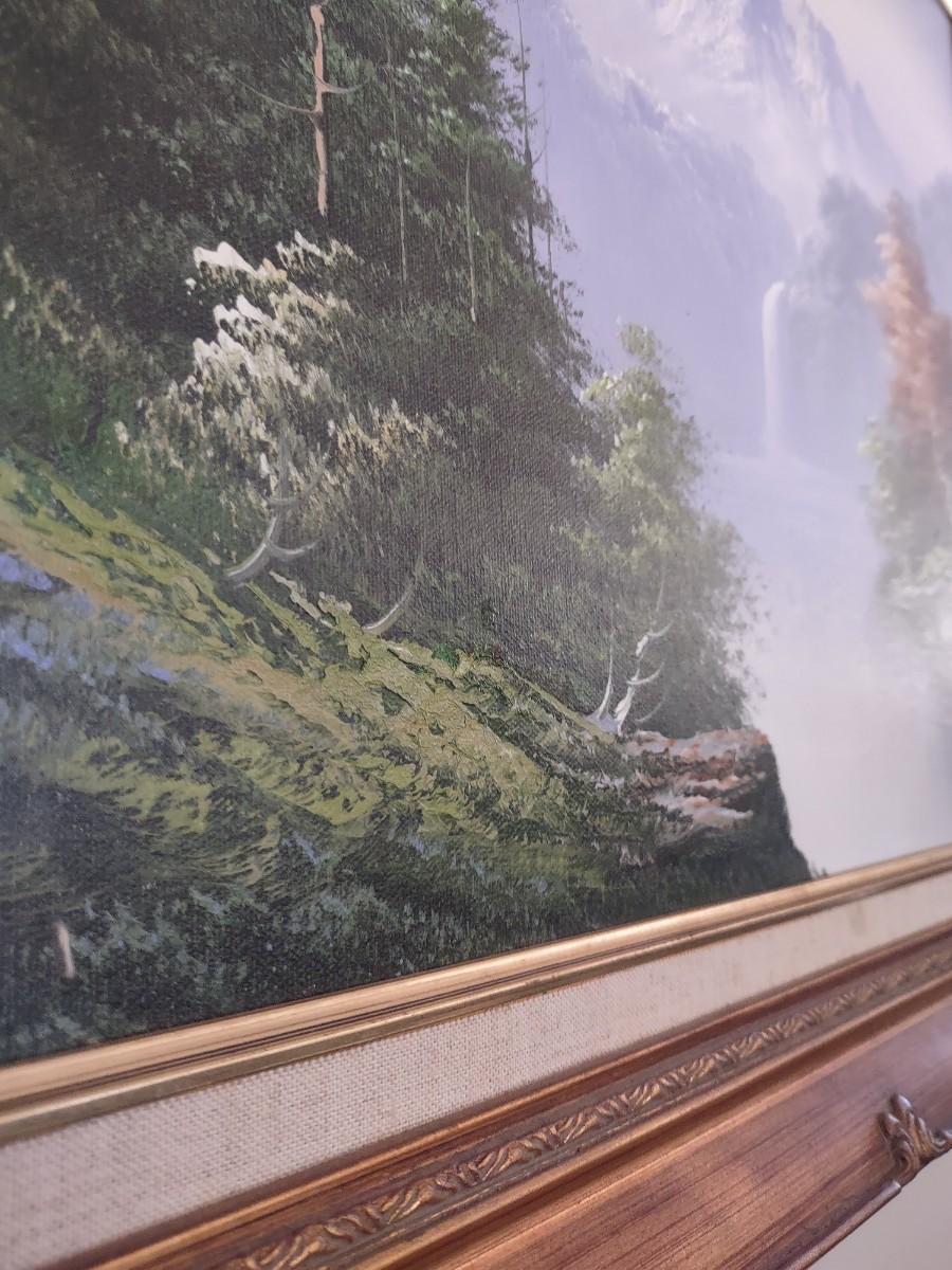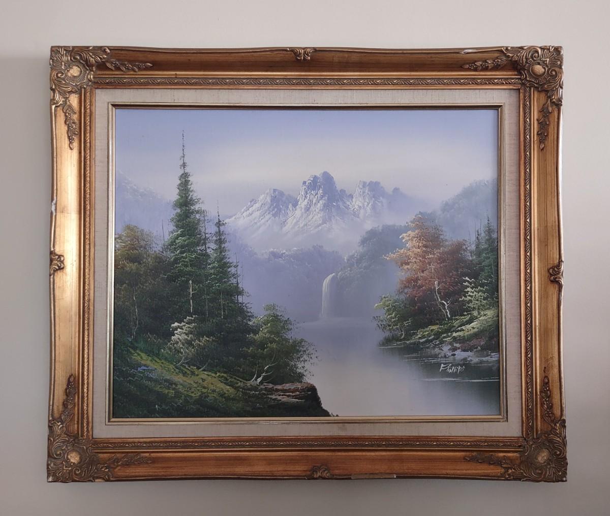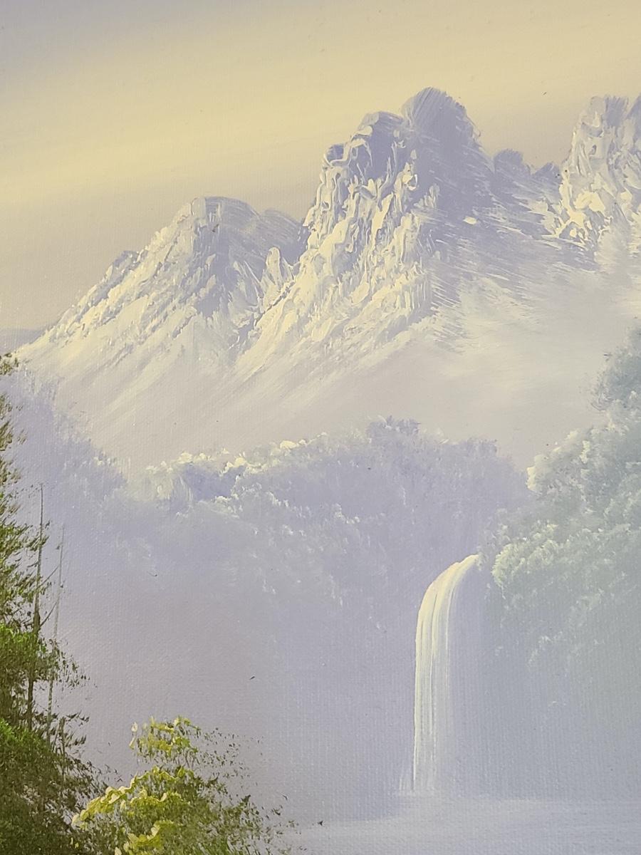 Mountain Landscape Artwork Artist Signed By Phillips 26×22"×2. This is on canvas and is a painting. Shown in early light where the picture is bright and airy; and evening light where it gives off an evening hue to the skyline.