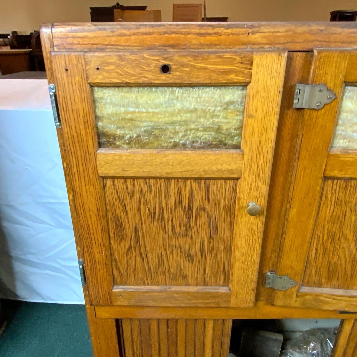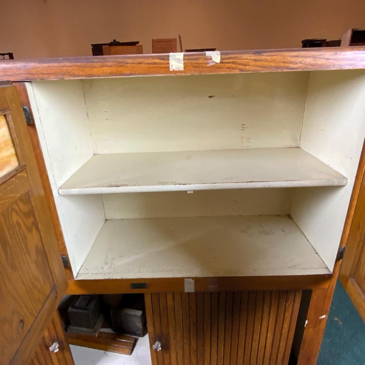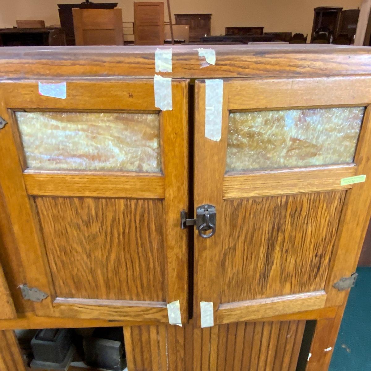 Wonderful Hoosier Cabinet Top with Slag Glass inserts. //::\\ Please see photos for details and condition. No attempt has been made to hide any imperfections. All items listed in this auction are warehouse items, and need to be cleaned. A majority of the items need restoration as well. All items are sold AS IS and WITHOUT GUARANTEE. If you are uncertain about an item, DO NOT BID. Due to the nature of this online auction in-person inspection is HIGHLY recommended. All Sales are FINAL. Pick Up Times are FIRM. Please confirm with your own schedule that you can pick up in the scheduled times listed in the Terms and Conditions. Any questions please message the auctioneer. DO NOT Contact The Harp Gallery.