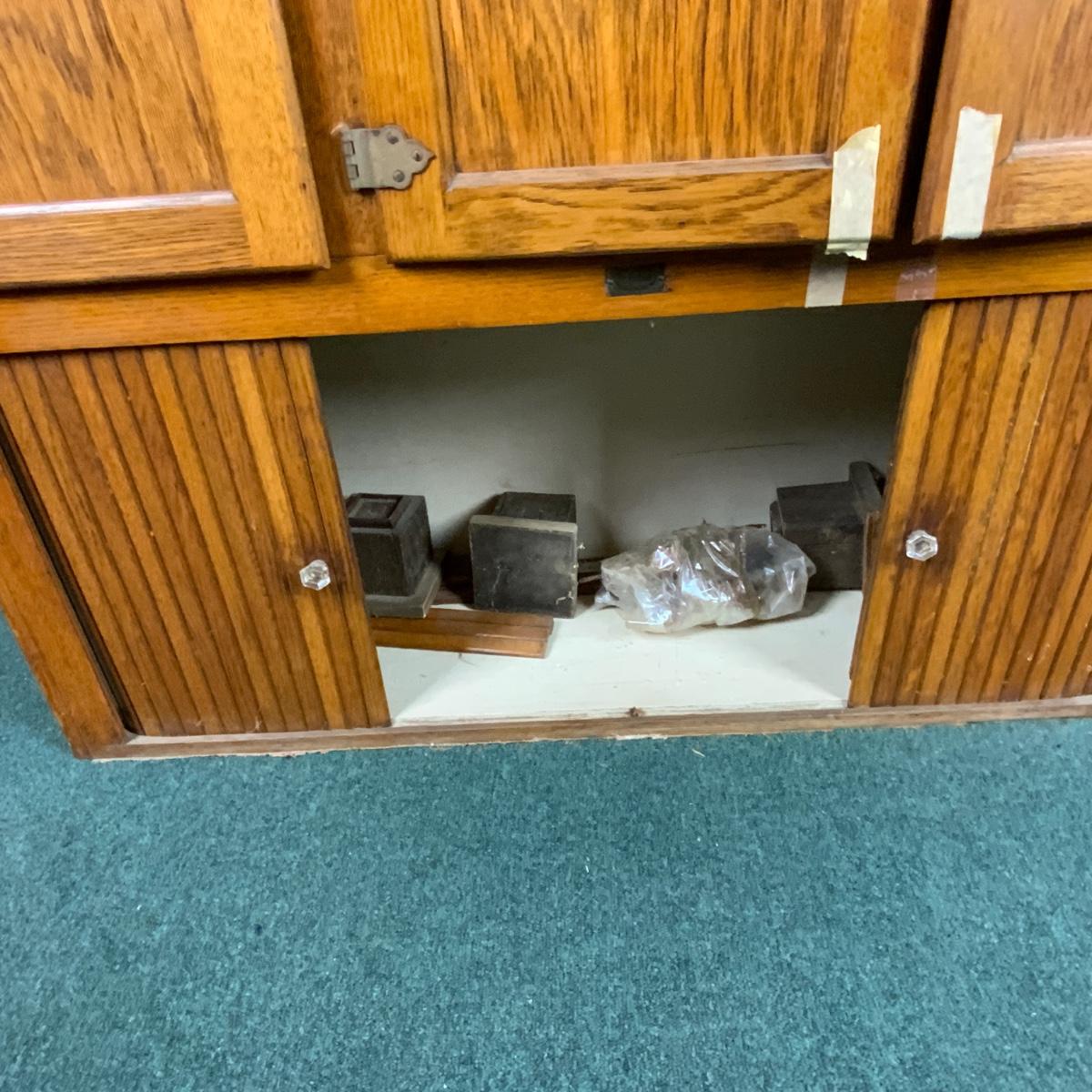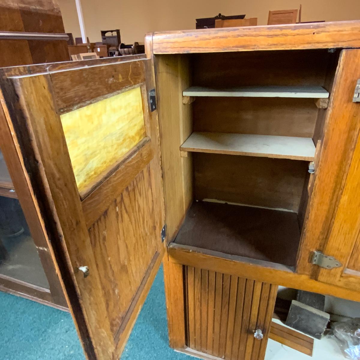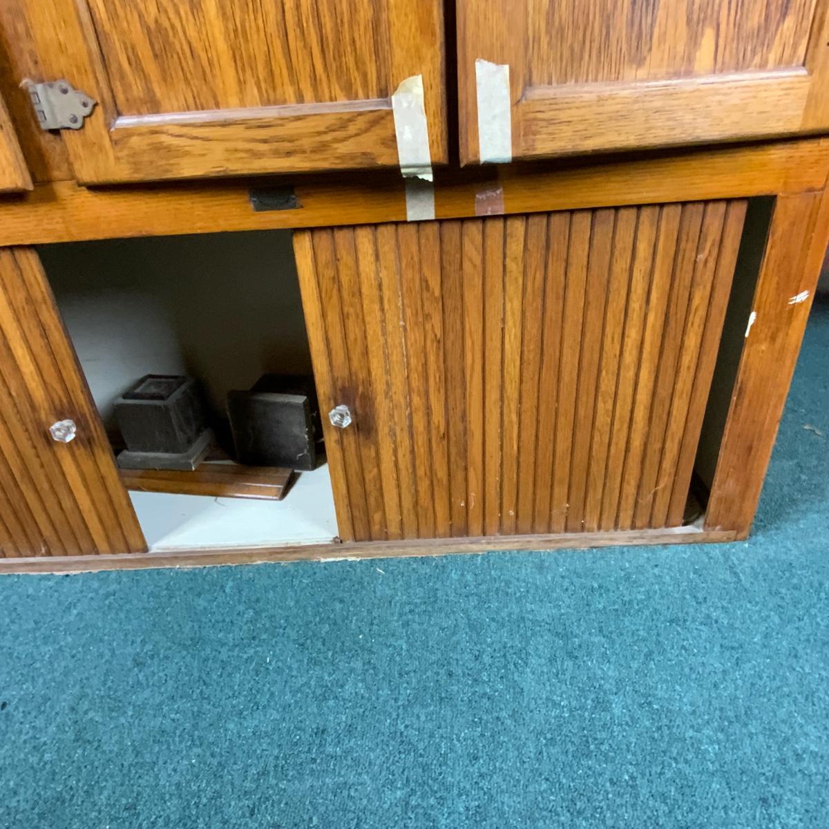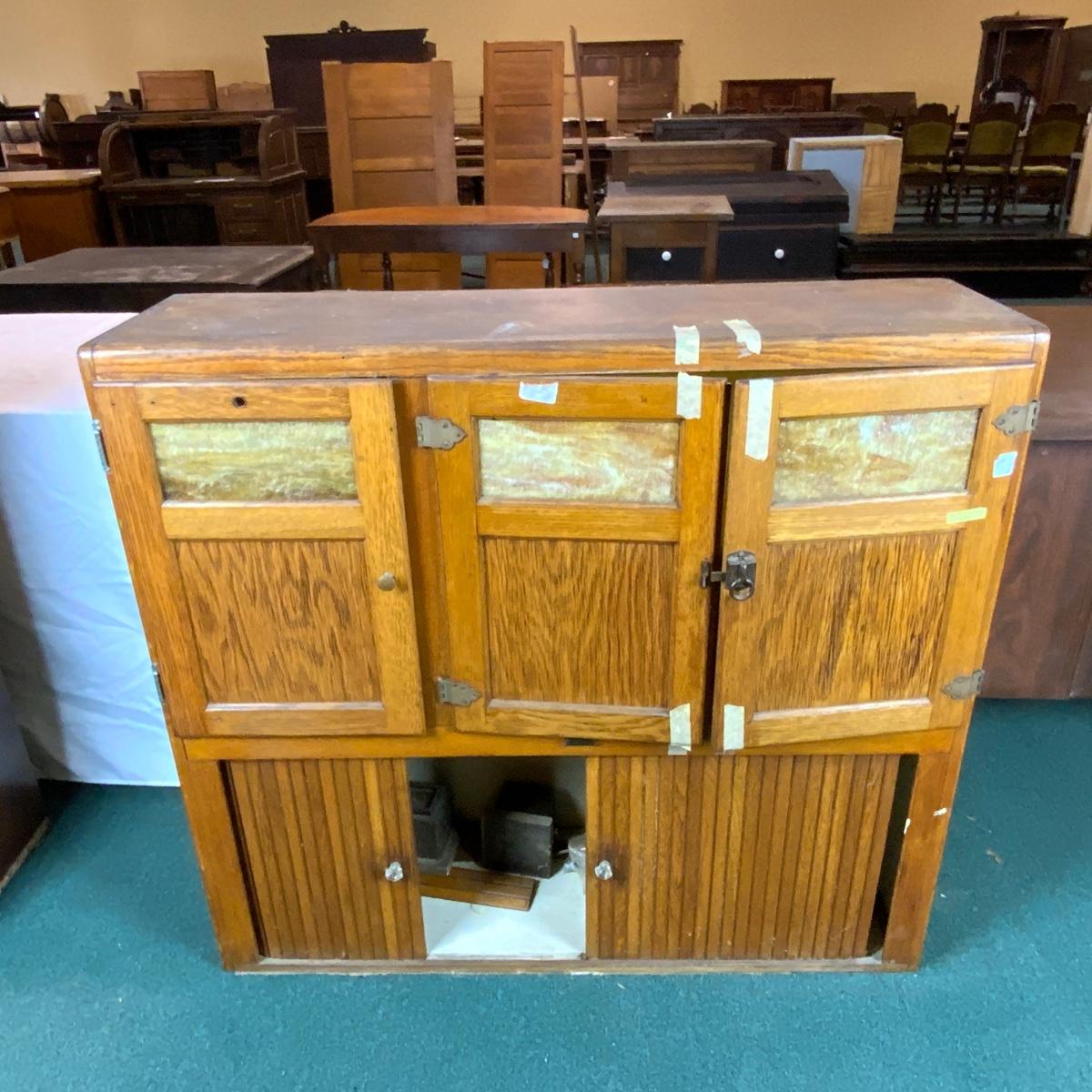 Wonderful Hoosier Cabinet Top with Slag Glass inserts. //::\\ Please see photos for details and condition. No attempt has been made to hide any imperfections. All items listed in this auction are warehouse items, and need to be cleaned. A majority of the items need restoration as well. All items are sold AS IS and WITHOUT GUARANTEE. If you are uncertain about an item, DO NOT BID. Due to the nature of this online auction in-person inspection is HIGHLY recommended. All Sales are FINAL. Pick Up Times are FIRM. Please confirm with your own schedule that you can pick up in the scheduled times listed in the Terms and Conditions. Any questions please message the auctioneer. DO NOT Contact The Harp Gallery.