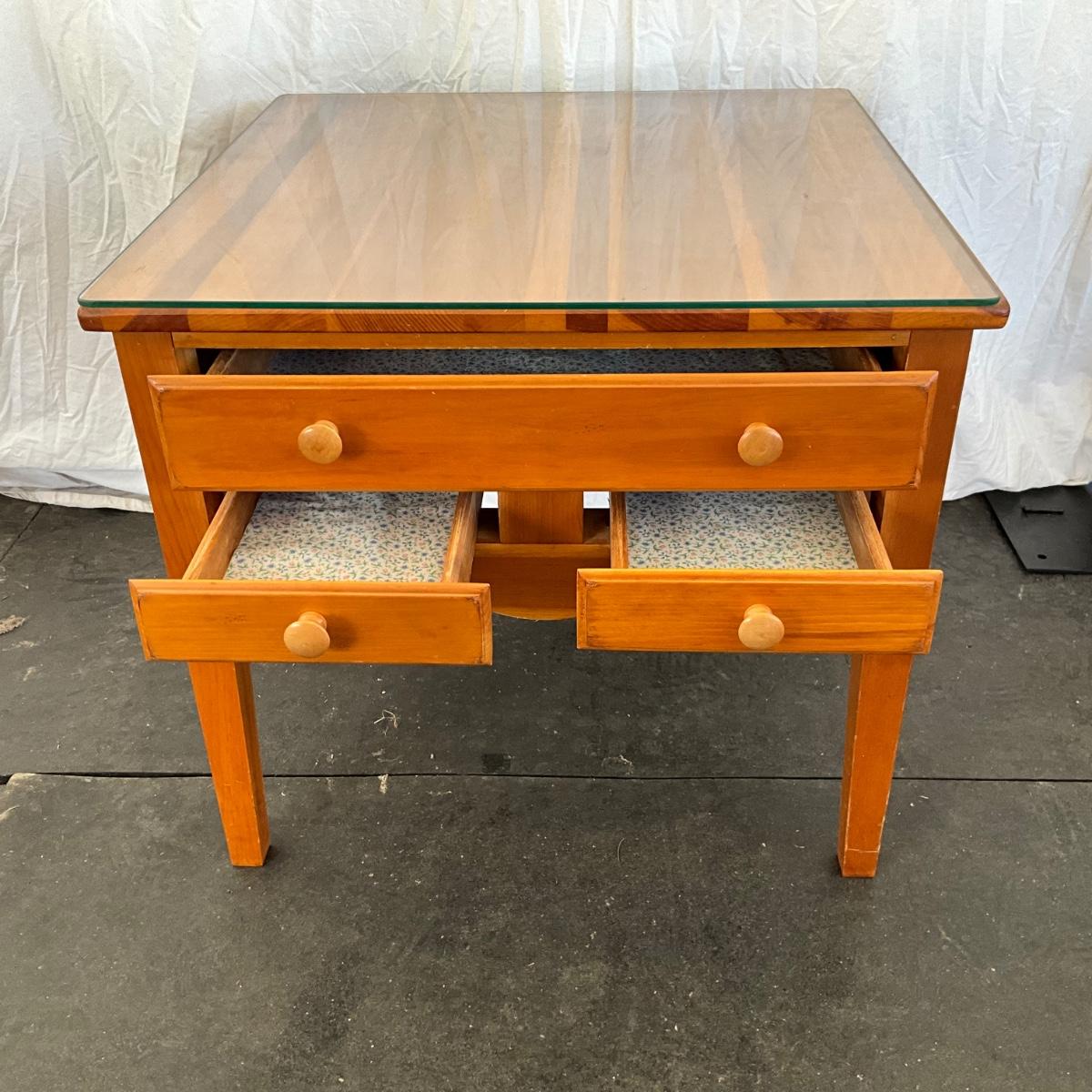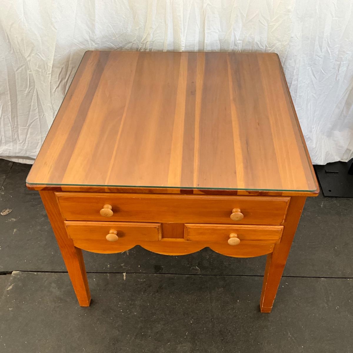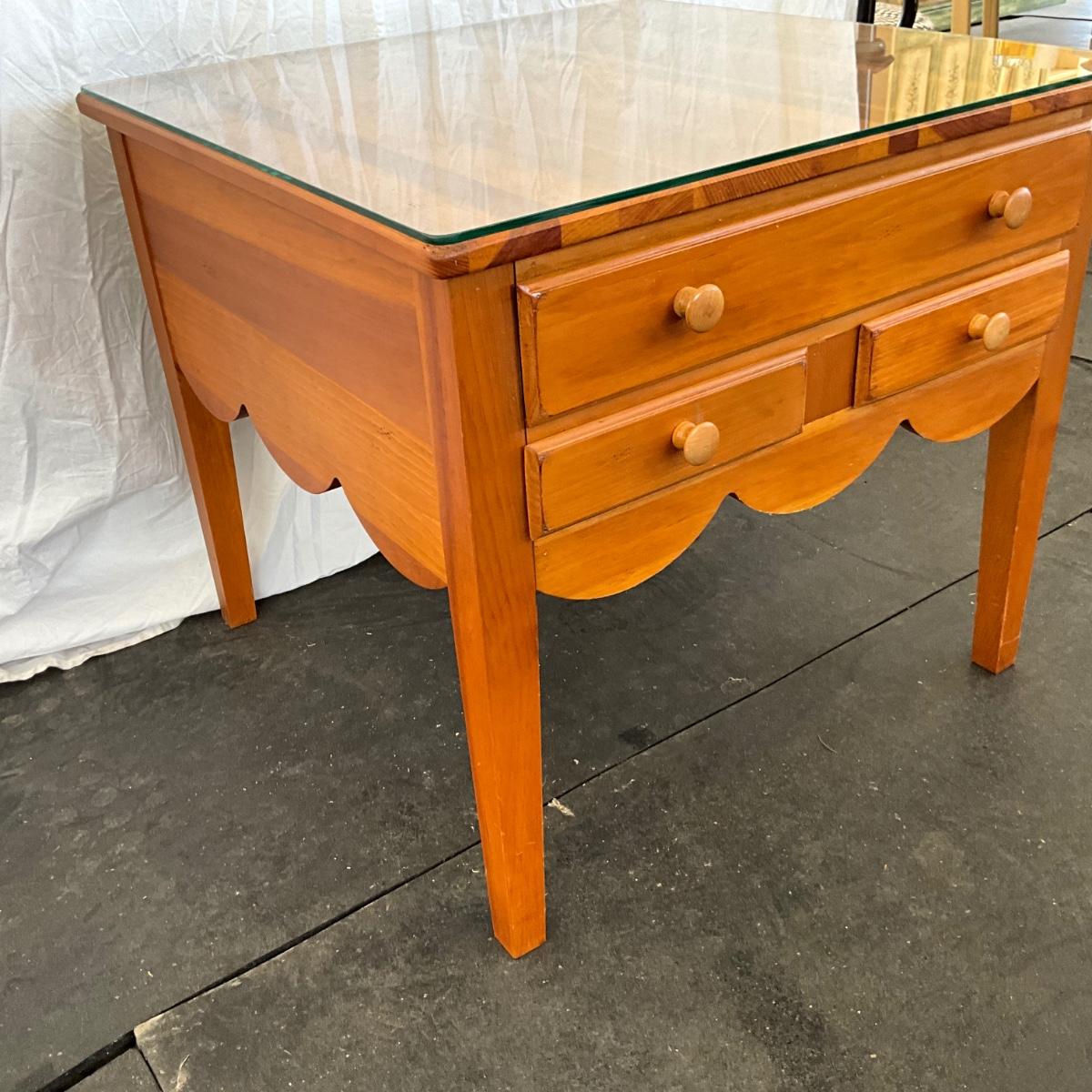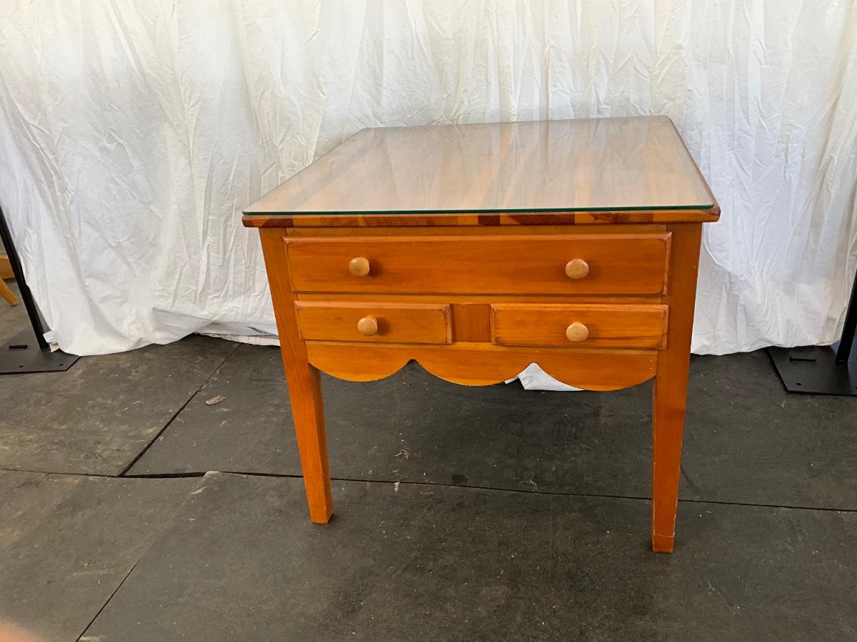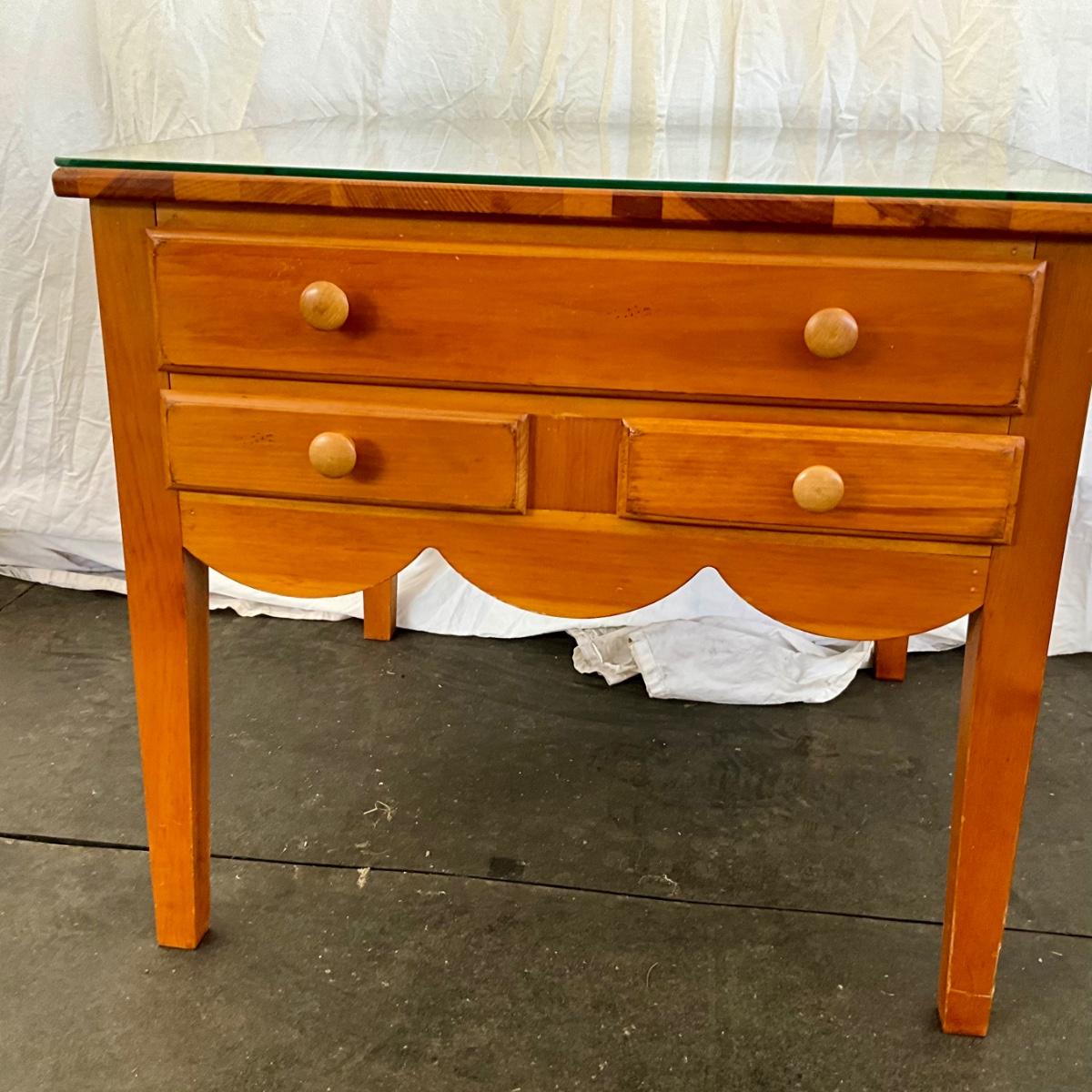 Scalloped Edge Wooden Glass-Top Table has Three Drawers
