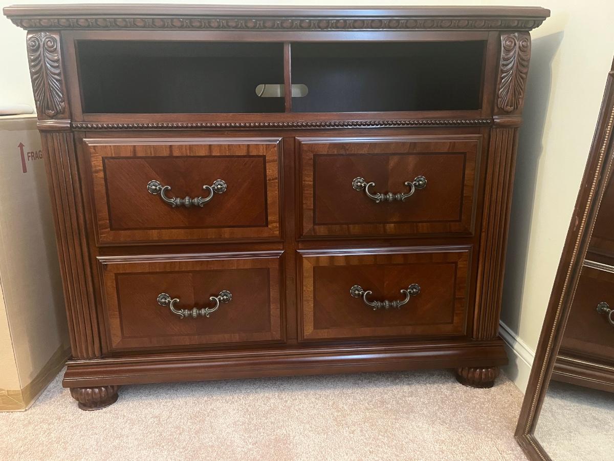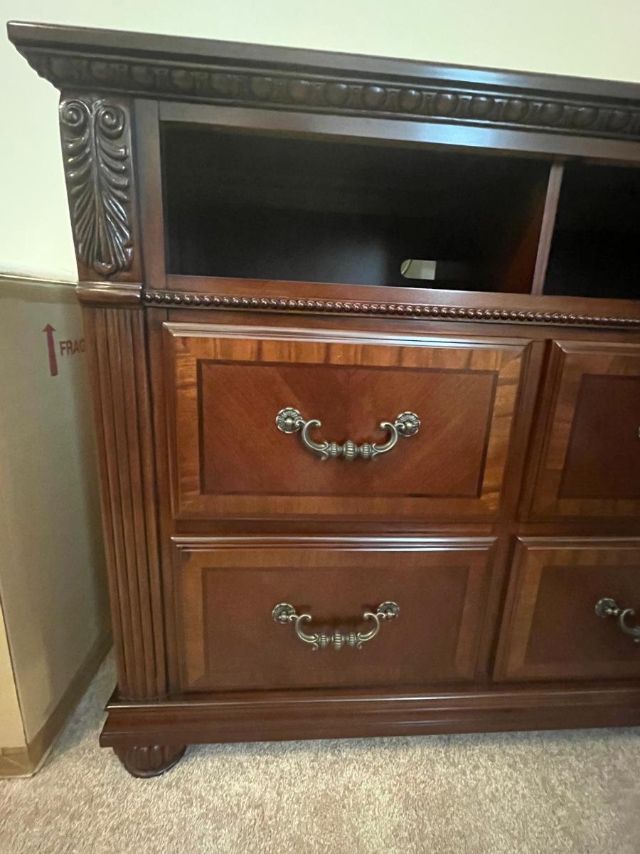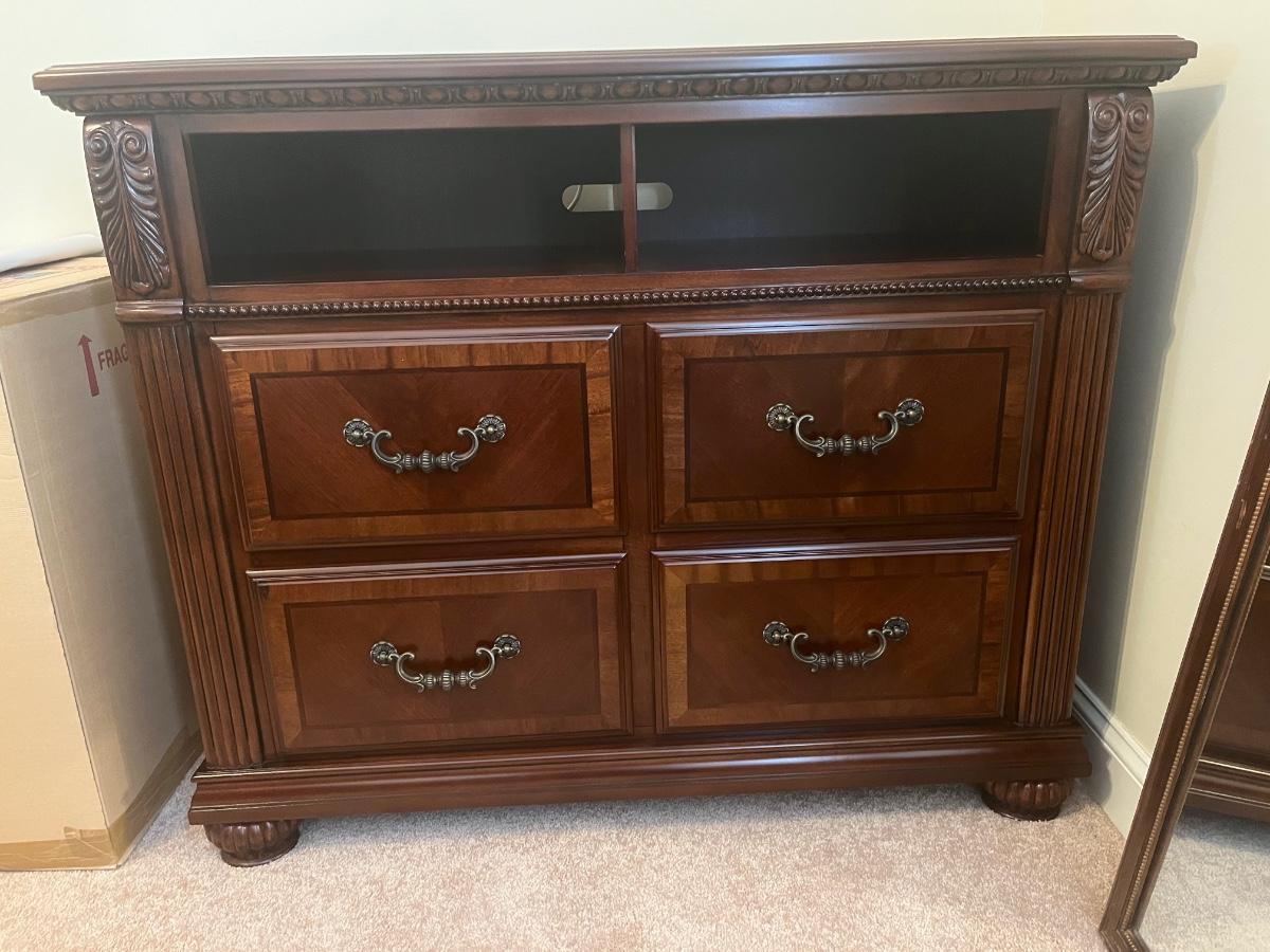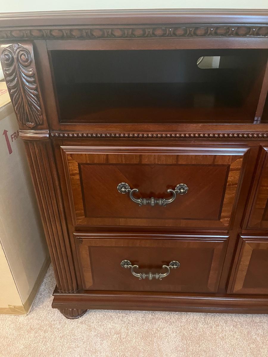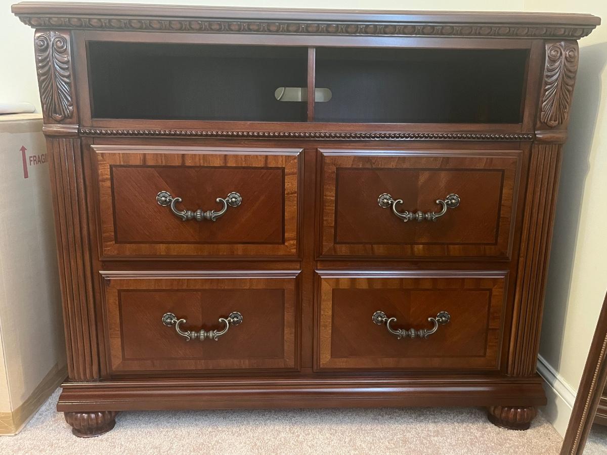 46x18x38. This piece is gorgeous in person. A modern piece with carved details and nice lines. Can function as a dresser with baskets, an entryway table, or a media stand. Lovely and functional. Please see measurements because the pictures make this appear as a smaller square, but this is a larger, solid stand rectangle in shape. Please see all pictures as they are the best representation of the items. The pictures show condition, measurements if taken, and what is included in the lot. Due to the large amount that we photograph and the time frame, we are not always able to take measurements. All items unless noted, are pre-owned and have been used. If you purchased furniture, you must bring help. We do not allow one person to carry large furniture out on their own. Bring help, tools and a truck for the safety of our client’s homes, and your personal safety. Company policy. Thank you.