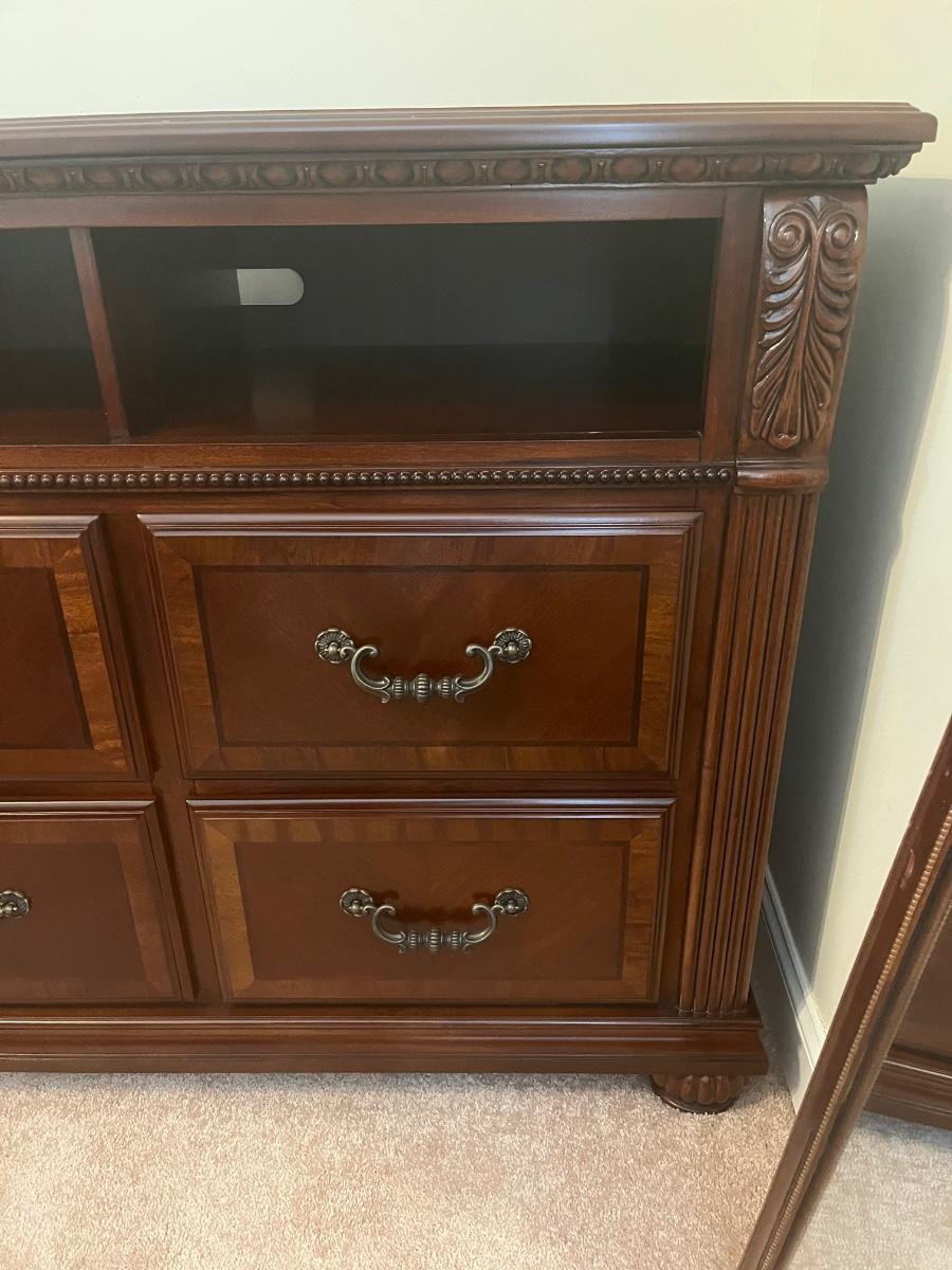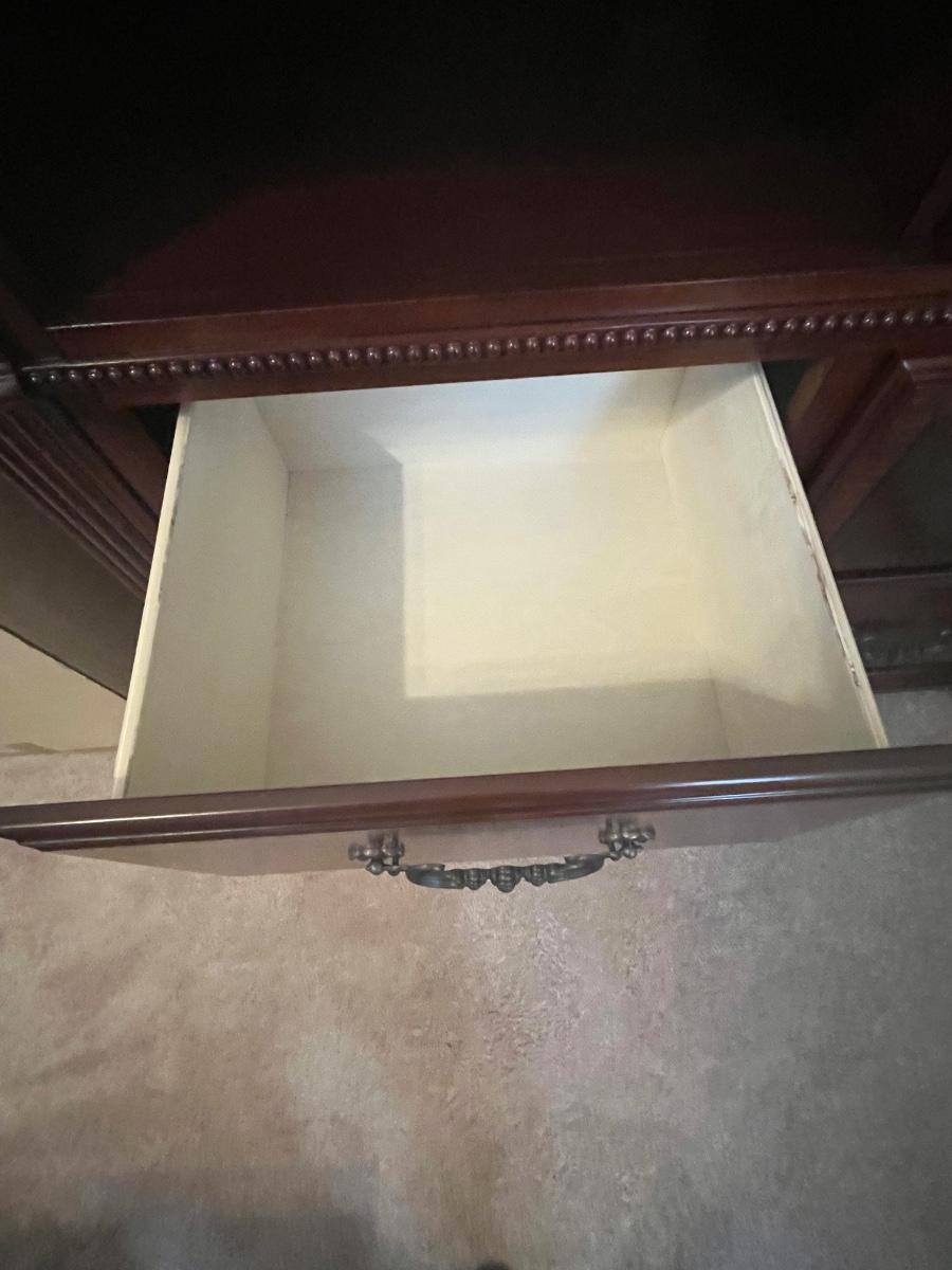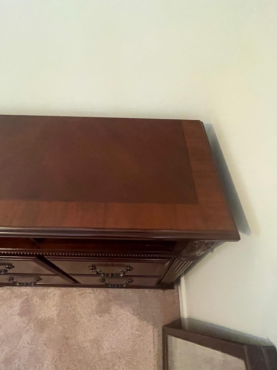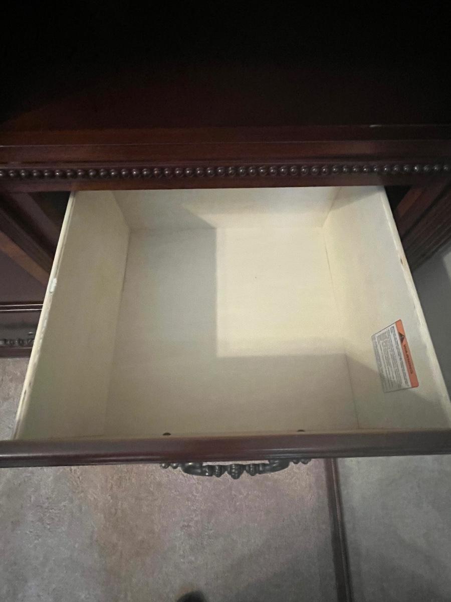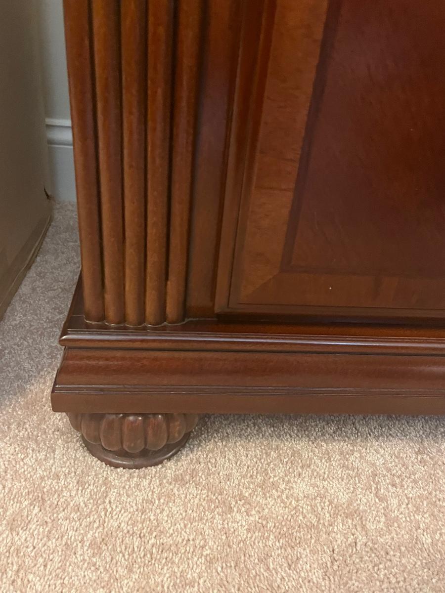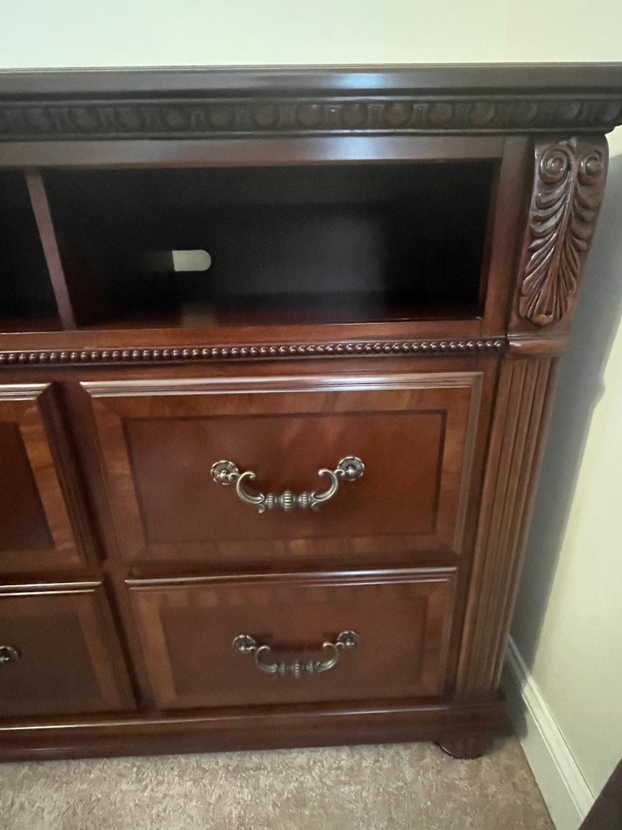 46x18x38. This piece is gorgeous in person. A modern piece with carved details and nice lines. Can function as a dresser with baskets, an entryway table, or a media stand. Lovely and functional. Please see measurements because the pictures make this appear as a smaller square, but this is a larger, solid stand rectangle in shape. Please see all pictures as they are the best representation of the items. The pictures show condition, measurements if taken, and what is included in the lot. Due to the large amount that we photograph and the time frame, we are not always able to take measurements. All items unless noted, are pre-owned and have been used. If you purchased furniture, you must bring help. We do not allow one person to carry large furniture out on their own. Bring help, tools and a truck for the safety of our client’s homes, and your personal safety. Company policy. Thank you.