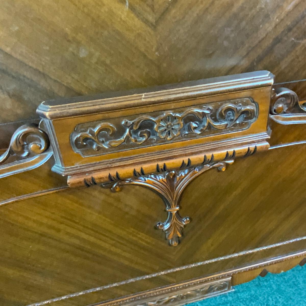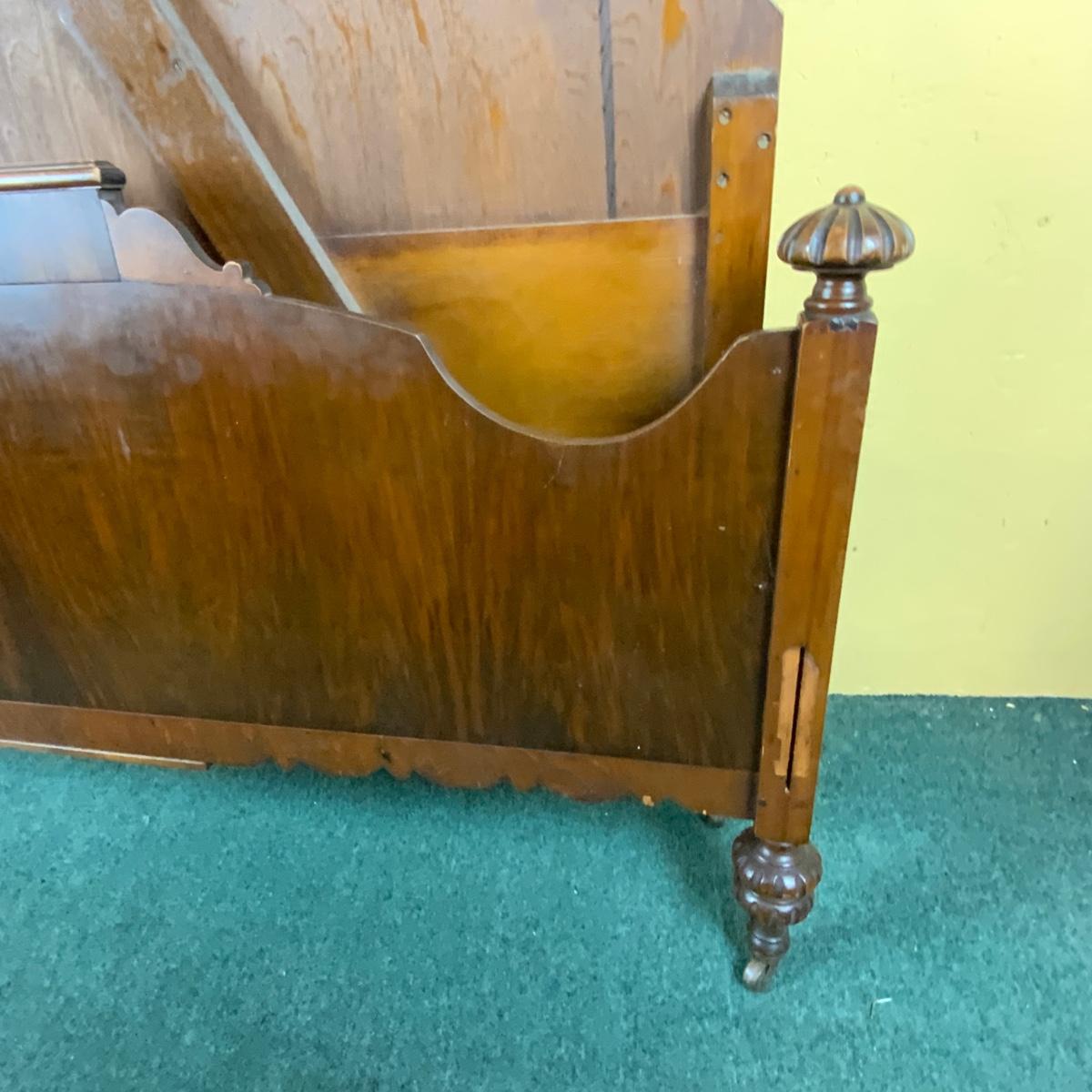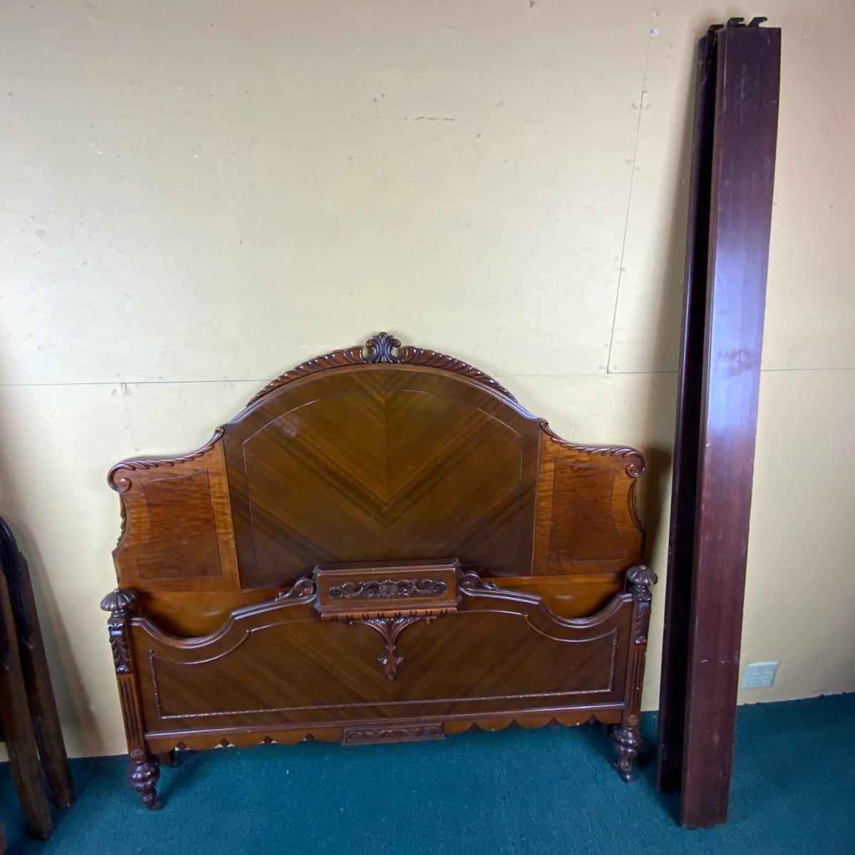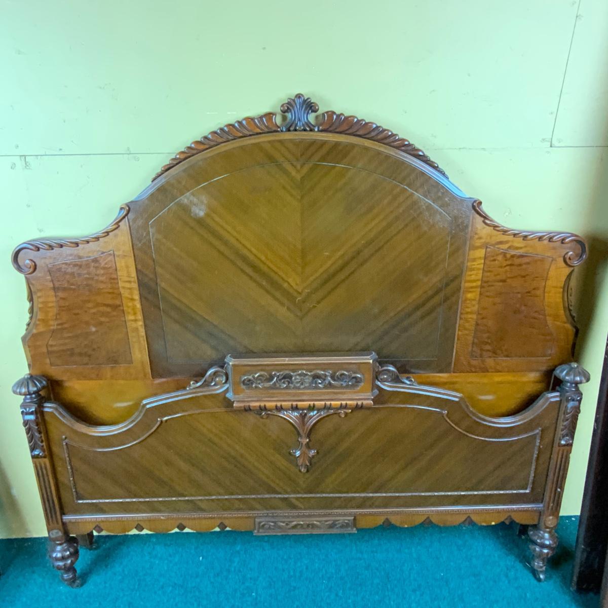 Gorgeous Antique Veneered Head and Footboard. Comes with rails. //::\\ Please see photos for details and condition. No attempt has been made to hide any imperfections. All items listed in this auction are warehouse items, and need to be cleaned. A majority of the items need restoration as well. All items are sold AS IS and WITHOUT GUARANTEE. If you are uncertain about an item, DO NOT BID. Due to the nature of this online auction in-person inspection is HIGHLY recommended. All Sales are FINAL. Pick Up Times are FIRM. Please confirm with your own schedule that you can pick up in the scheduled times listed in the Terms and Conditions. Any questions please message the auctioneer. DO NOT Contact The Harp Gallery.