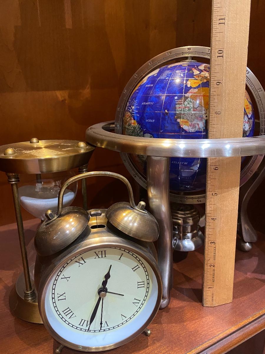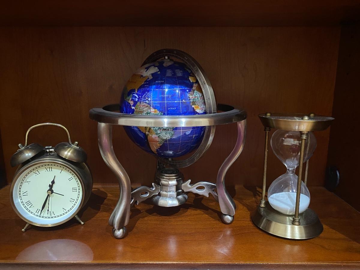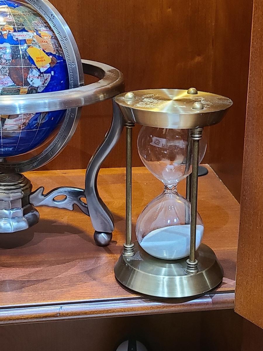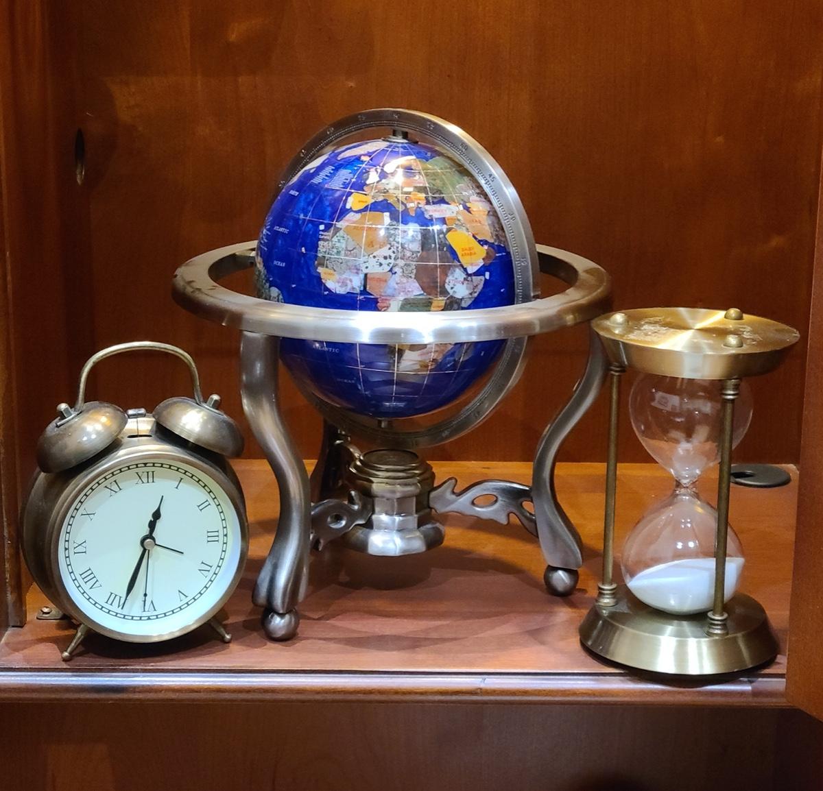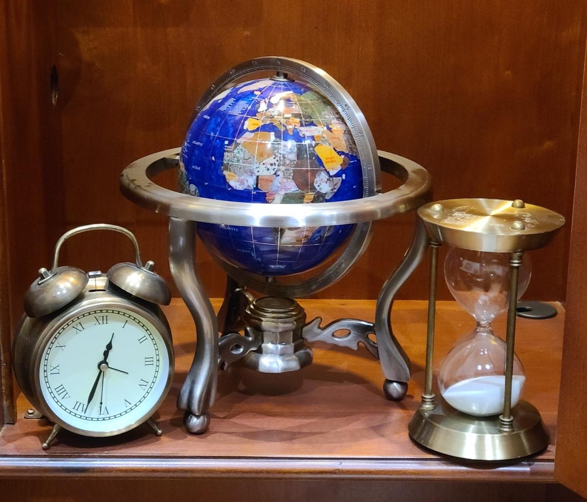 Lot 031: Compass/Globe on Swivel Stand, Sand Timer and Clock