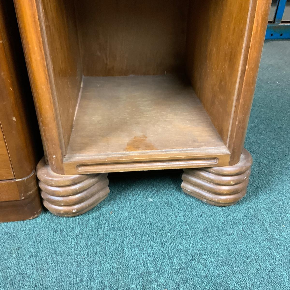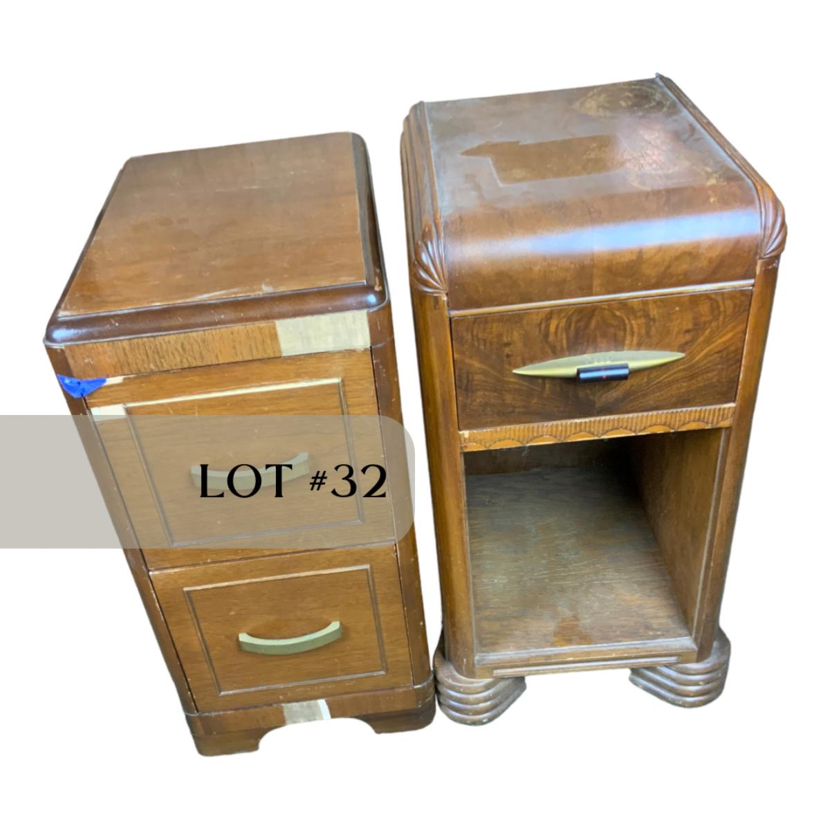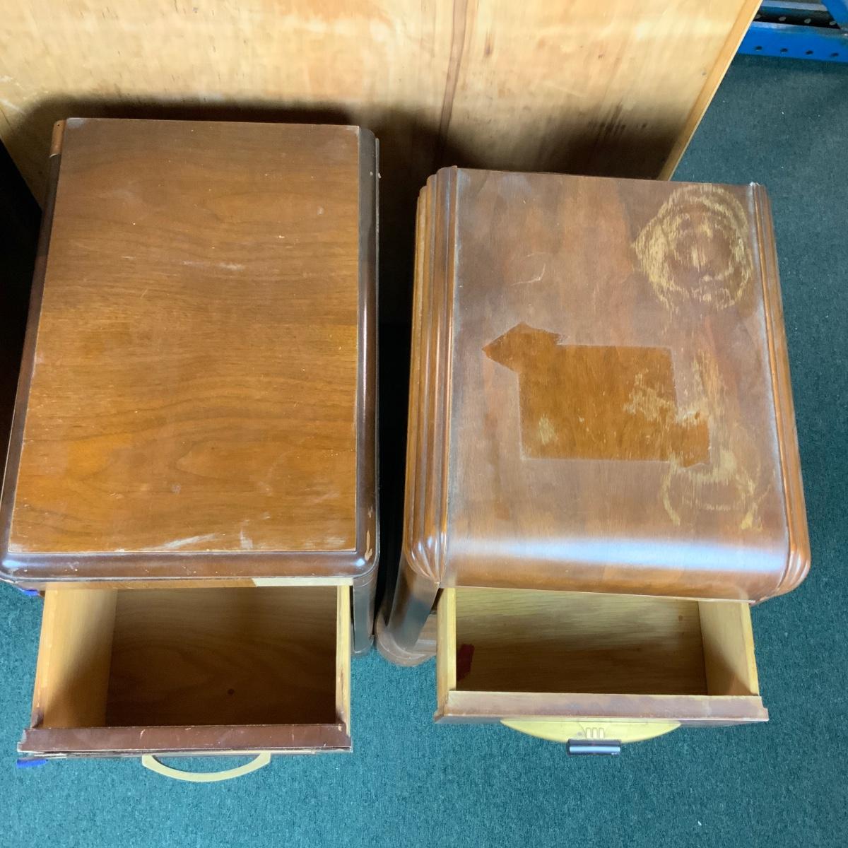 Two mid-matched Art Deco Side Tables. //::\\ Please see photos for details and condition. No attempt has been made to hide any imperfections. All items listed in this auction are warehouse items, and need to be cleaned. A majority of the items need restoration as well. All items are sold AS IS and WITHOUT GUARANTEE. If you are uncertain about an item, DO NOT BID. Due to the nature of this online auction in-person inspection is HIGHLY recommended. All Sales are FINAL. Pick Up Times are FIRM. Please confirm with your own schedule that you can pick up in the scheduled times listed in the Terms and Conditions. Any questions please message the auctioneer. DO NOT Contact The Harp Gallery.