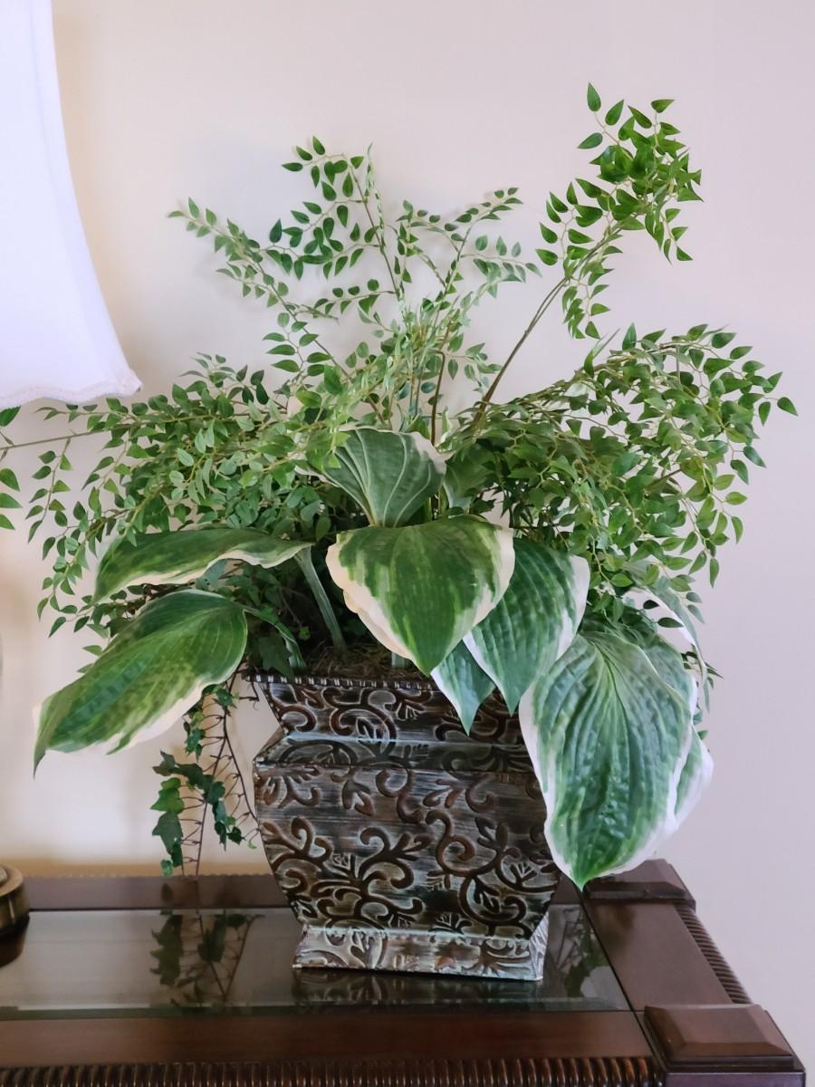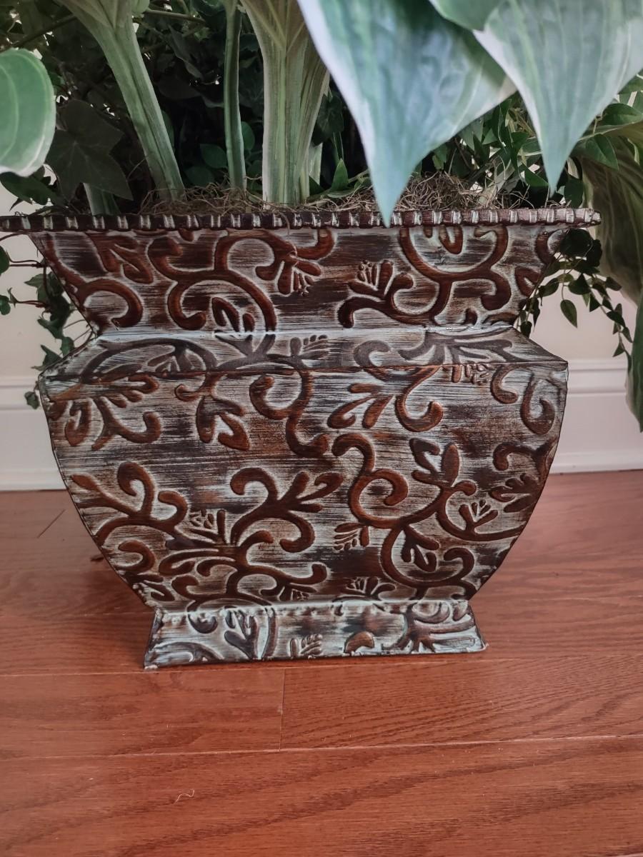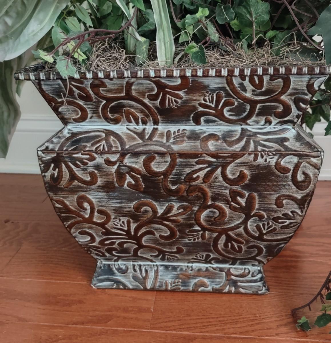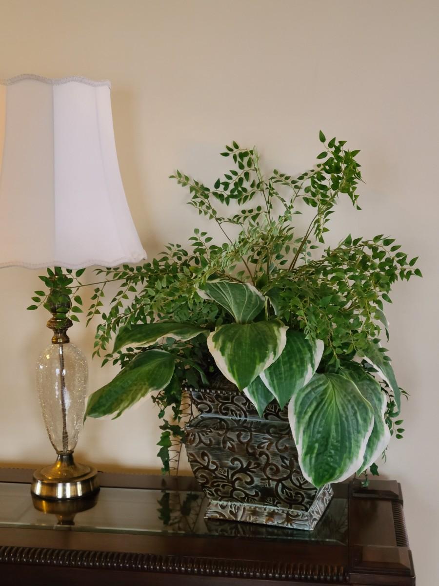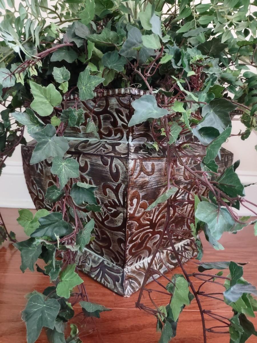Faux Plant In Metal Decorative Planter 13×22". Lamp and table not included.