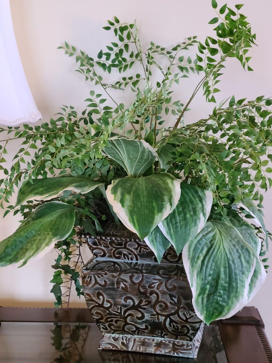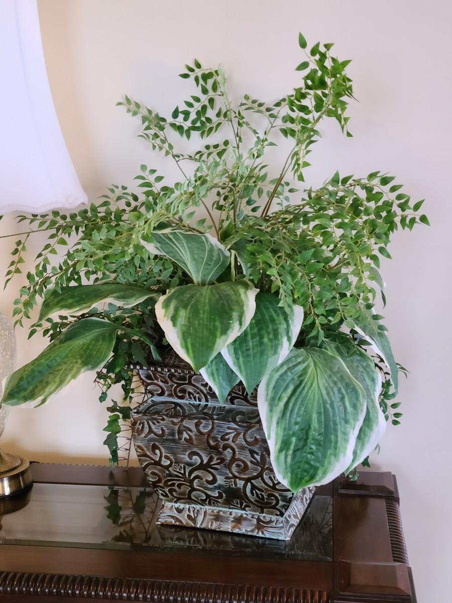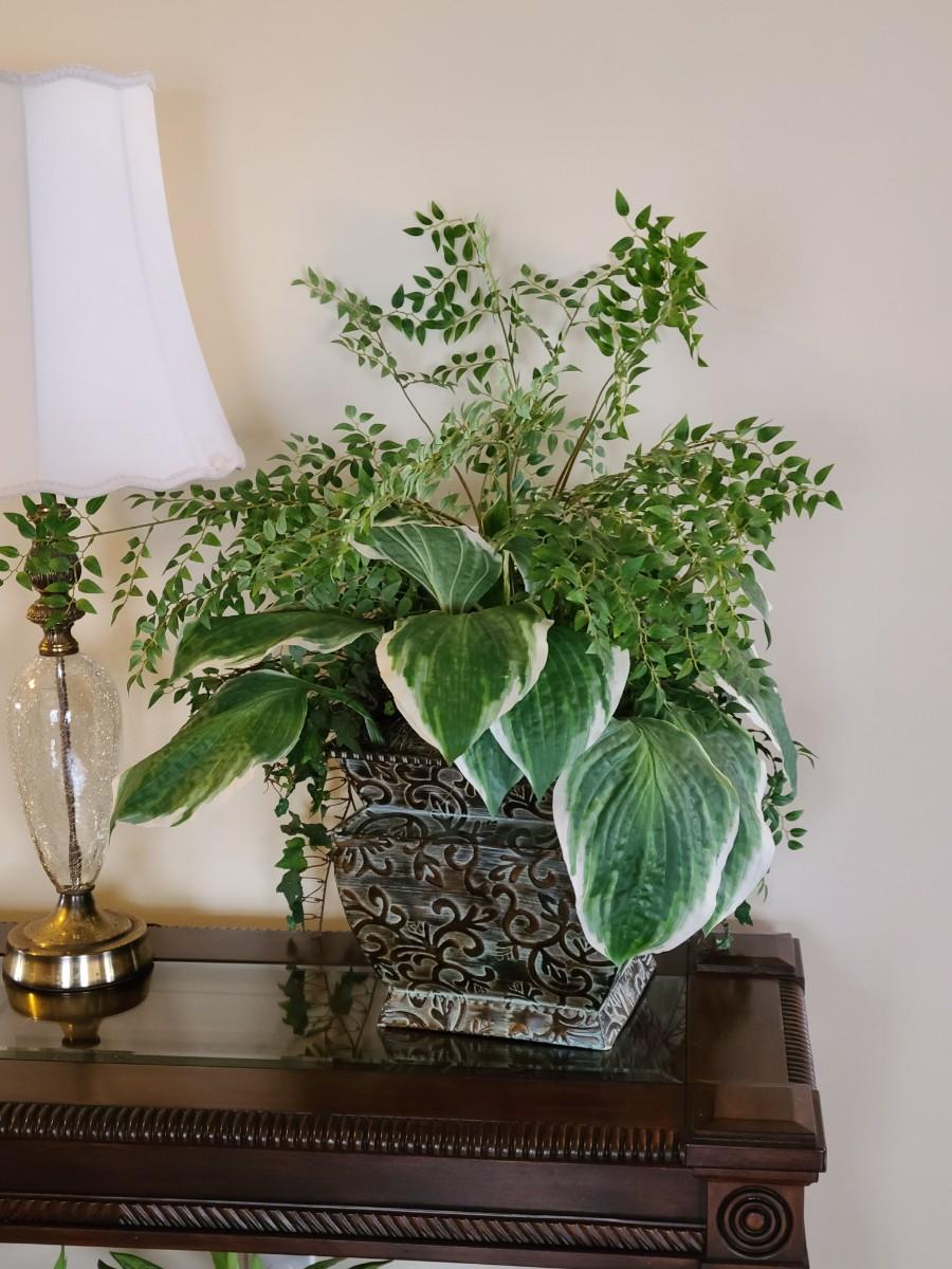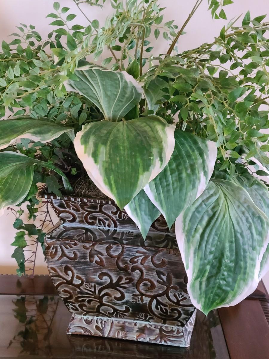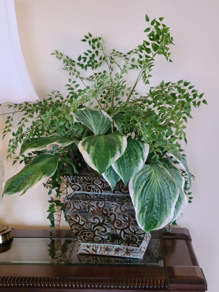 Faux Plant In Metal Decorative Planter 13×22". Lamp and table not included.