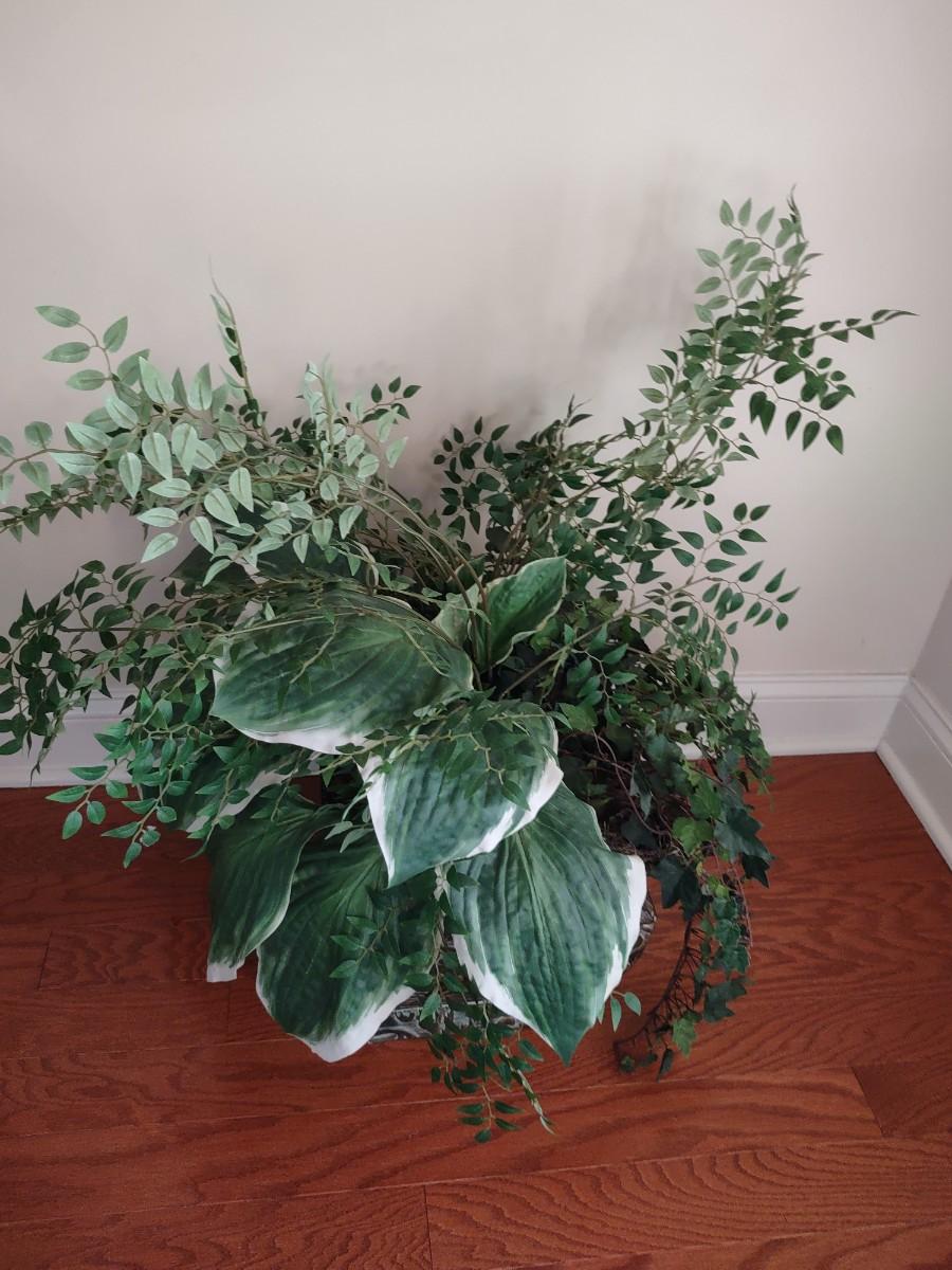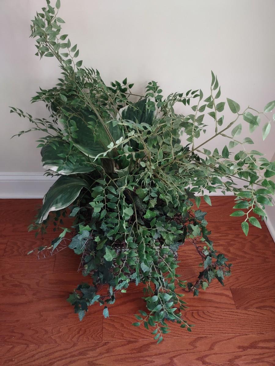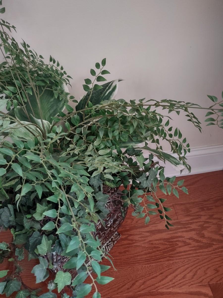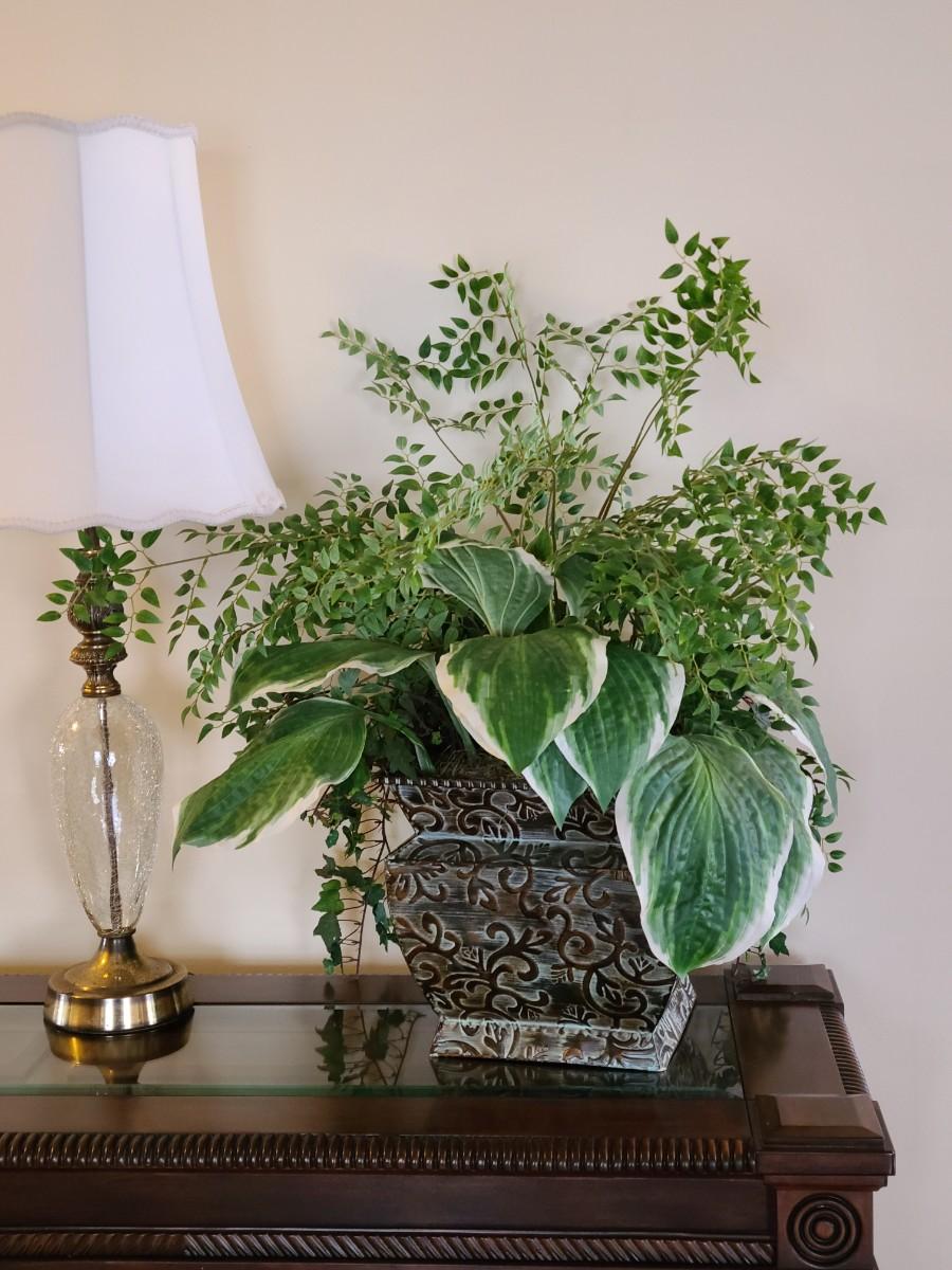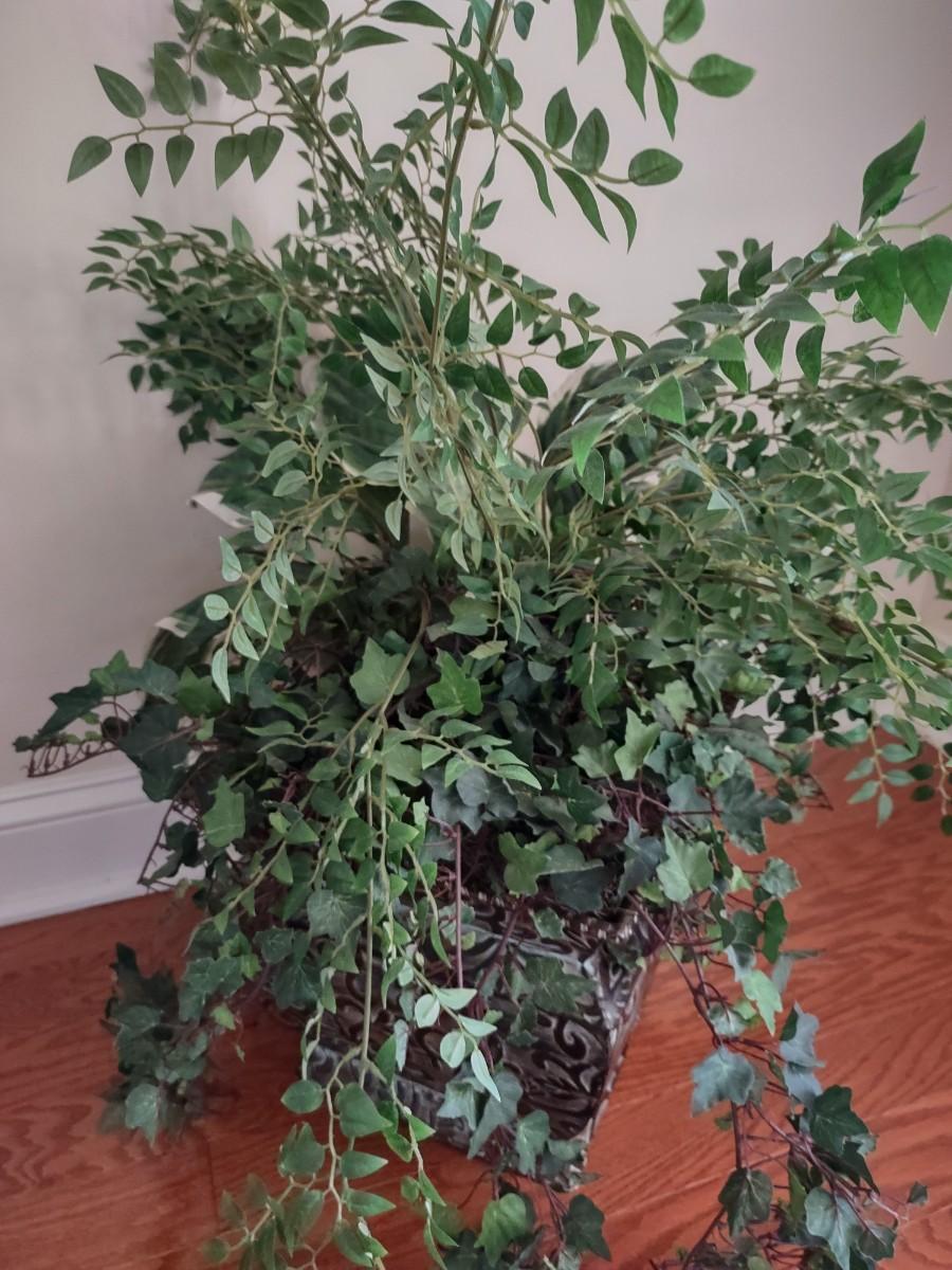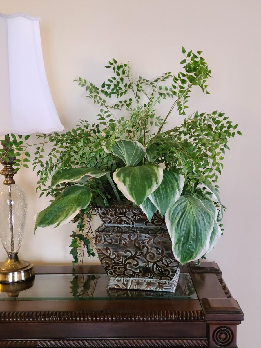 Faux Plant In Metal Decorative Planter 13×22". Lamp and table not included.