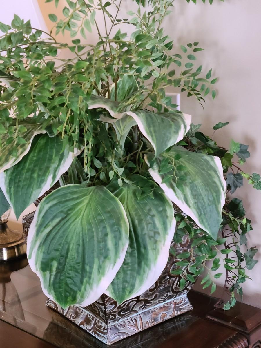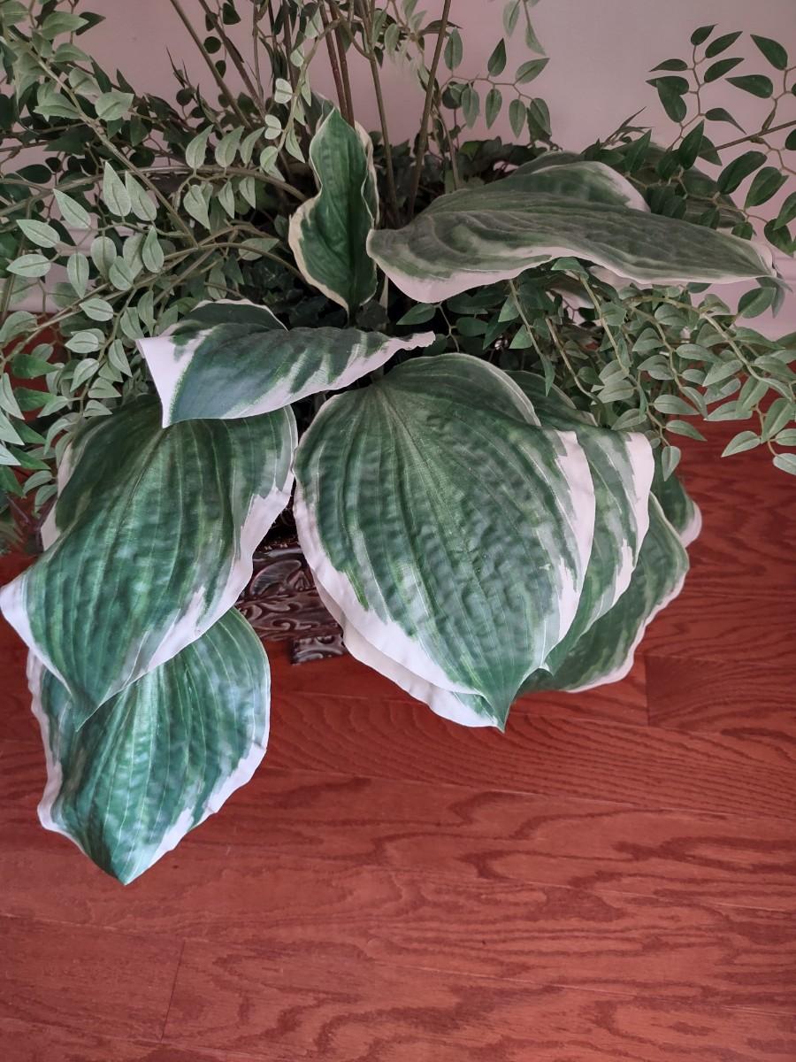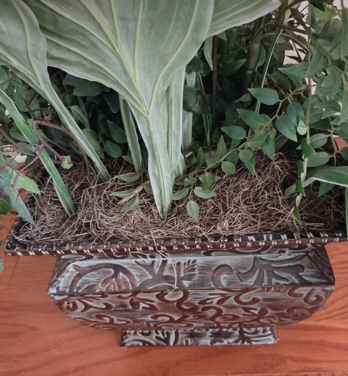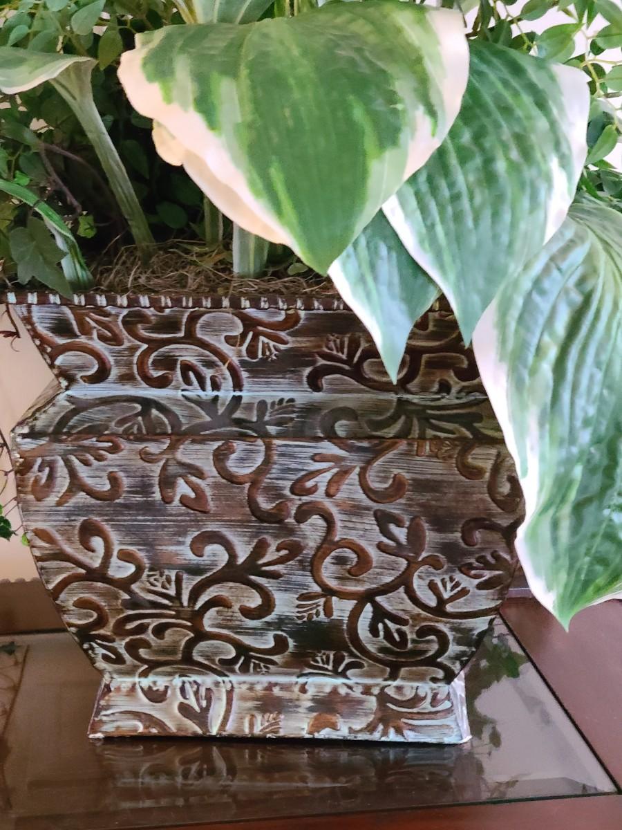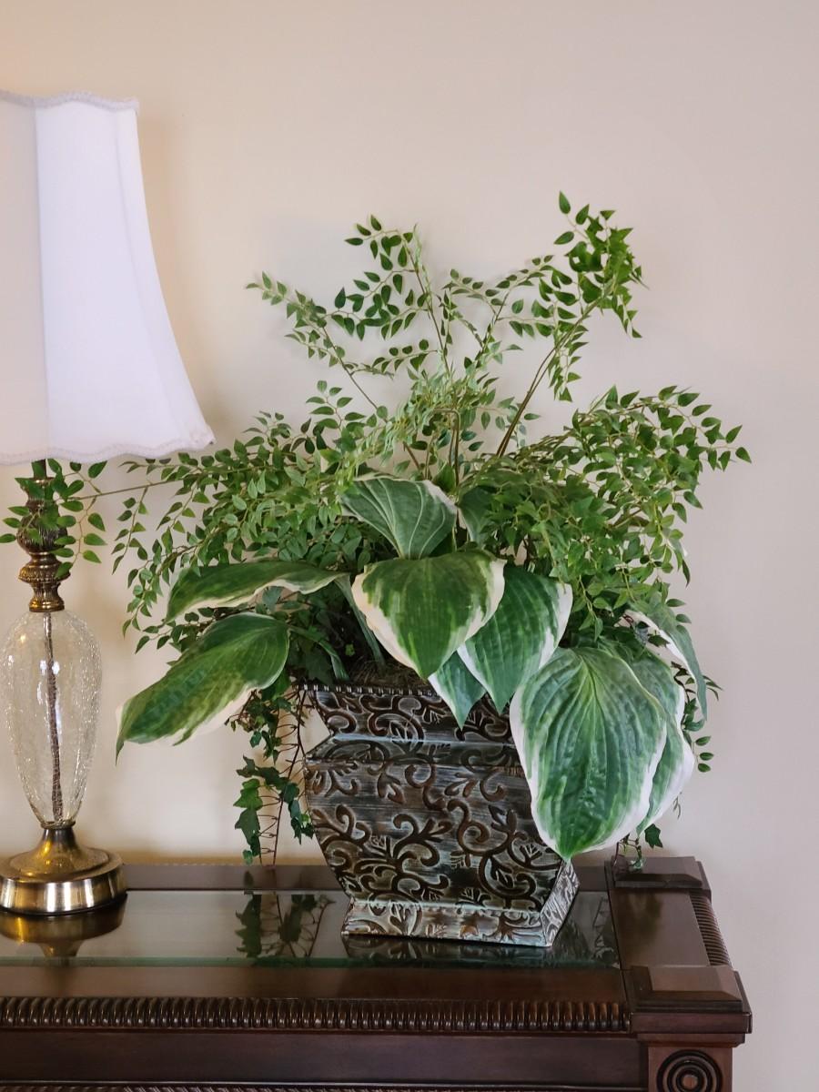 Faux Plant In Metal Decorative Planter 13×22". Lamp and table not included.