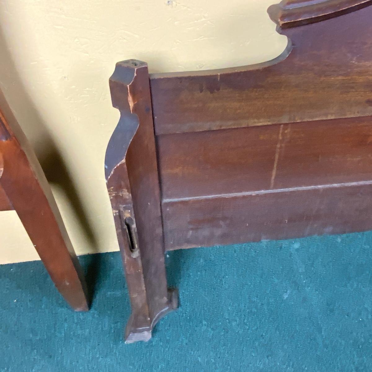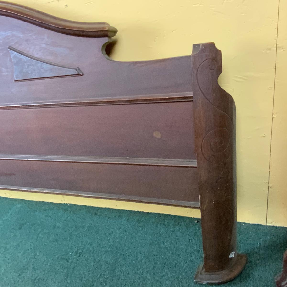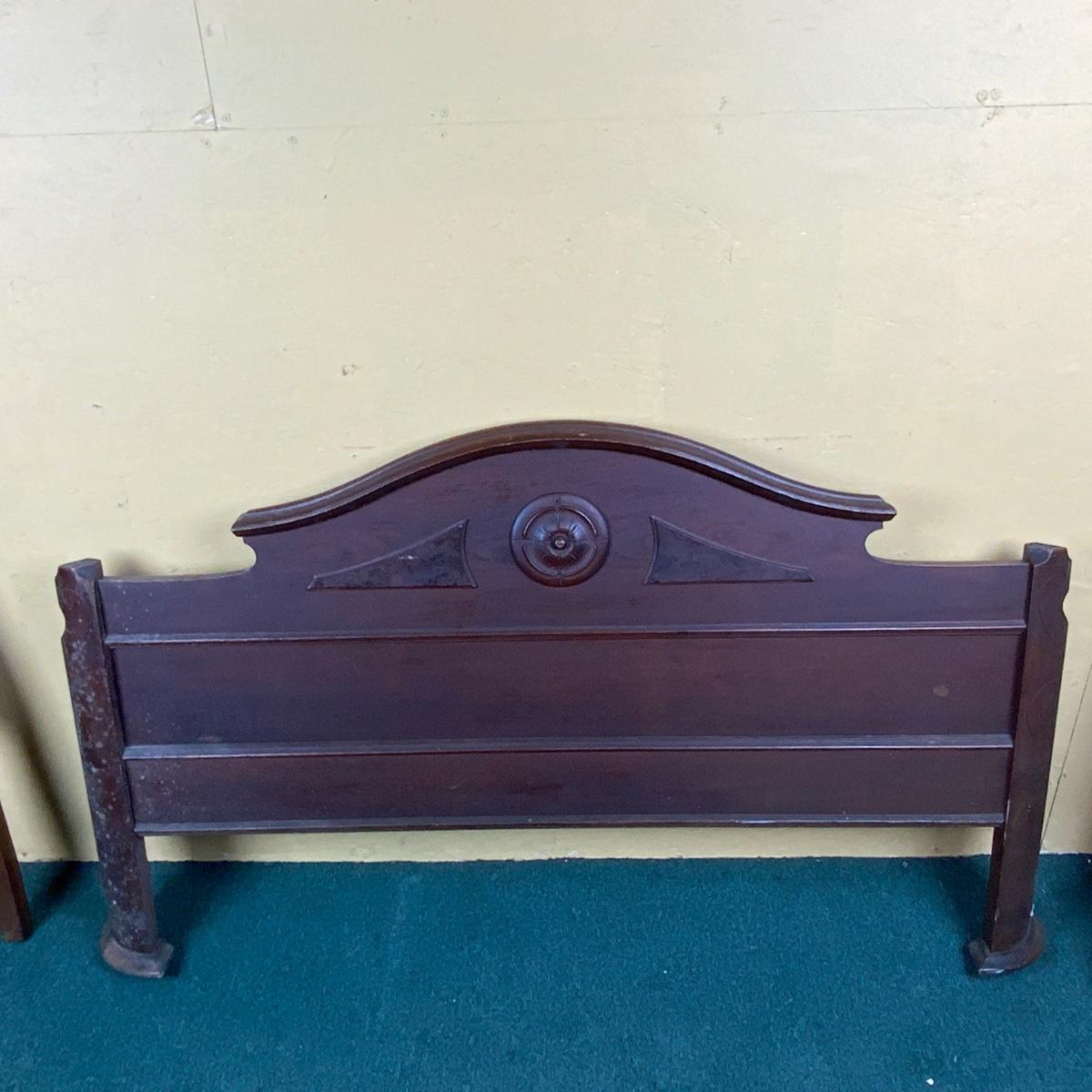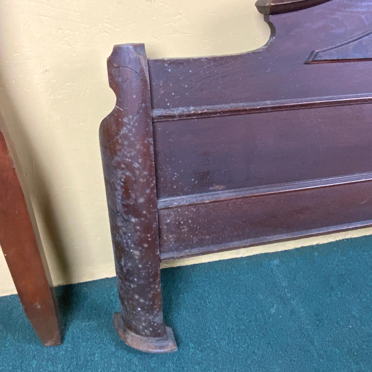 Dark Wood Hand Carved Footboard and Rails. Sturdy and made to last. //::\\ Please see photos for details and condition. No attempt has been made to hide any imperfections. All items listed in this auction are warehouse items, and need to be cleaned. A majority of the items need restoration as well. All items are sold AS IS and WITHOUT GUARANTEE. If you are uncertain about an item, DO NOT BID. Due to the nature of this online auction in-person inspection is HIGHLY recommended. All Sales are FINAL. Pick Up Times are FIRM. Please confirm with your own schedule that you can pick up in the scheduled times listed in the Terms and Conditions. Any questions please message the auctioneer. DO NOT Contact The Harp Gallery.