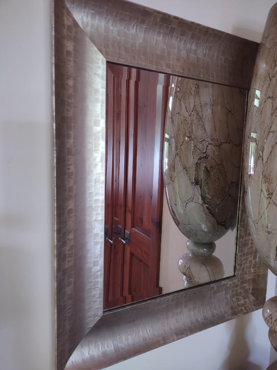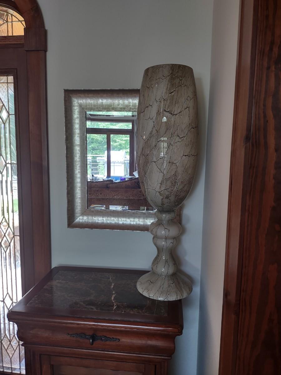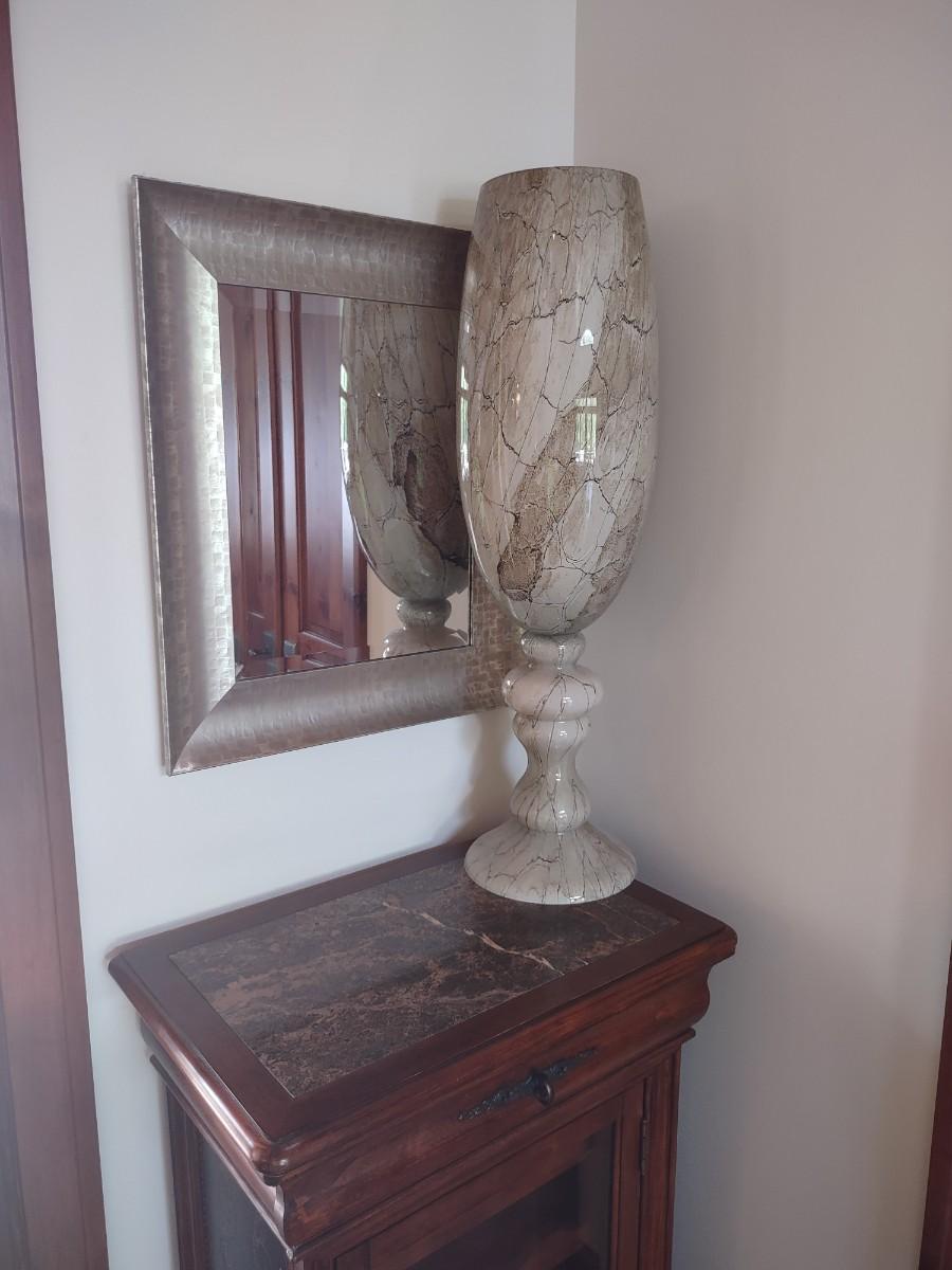 Beautiful Large Glass Vase and Mirror with gold accents. Mirror size is 22"×26" Please see all pictures as they are the best representation of the items. The pictures show condition, measurements if taken, and what is included in the lot. Due to the large amount that we photograph and the time frame, we are not always able to take measurements. All items unless noted, are pre-owned and have been used. If you purchased furniture, you must bring help. We do not allow one person to carry large furniture out on their own. Bring help, tools and a truck for the safety of our clients homes, and your personal safety. Company policy. Thank you.