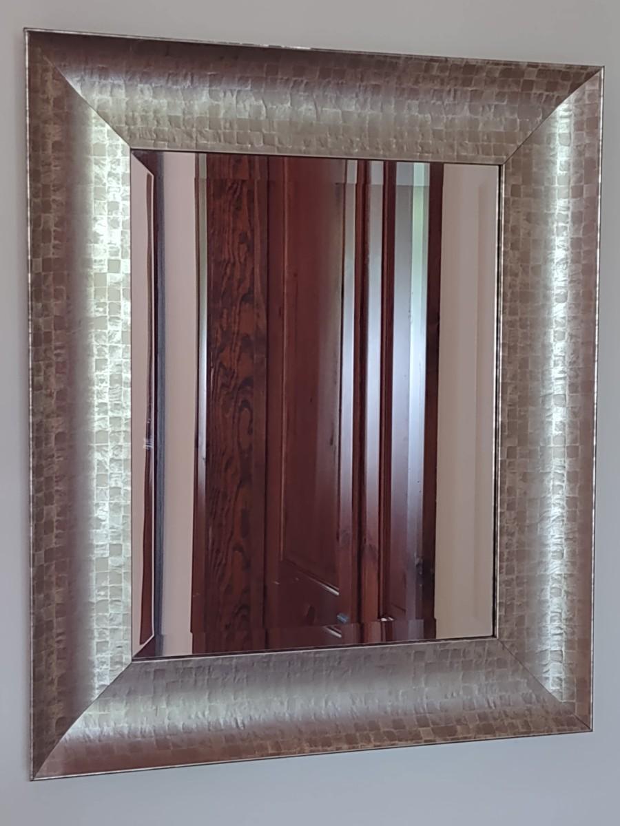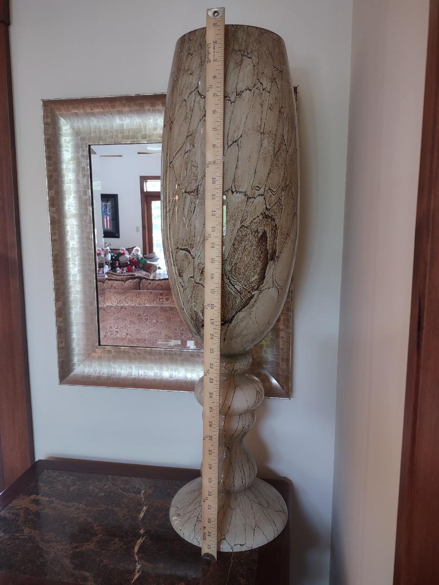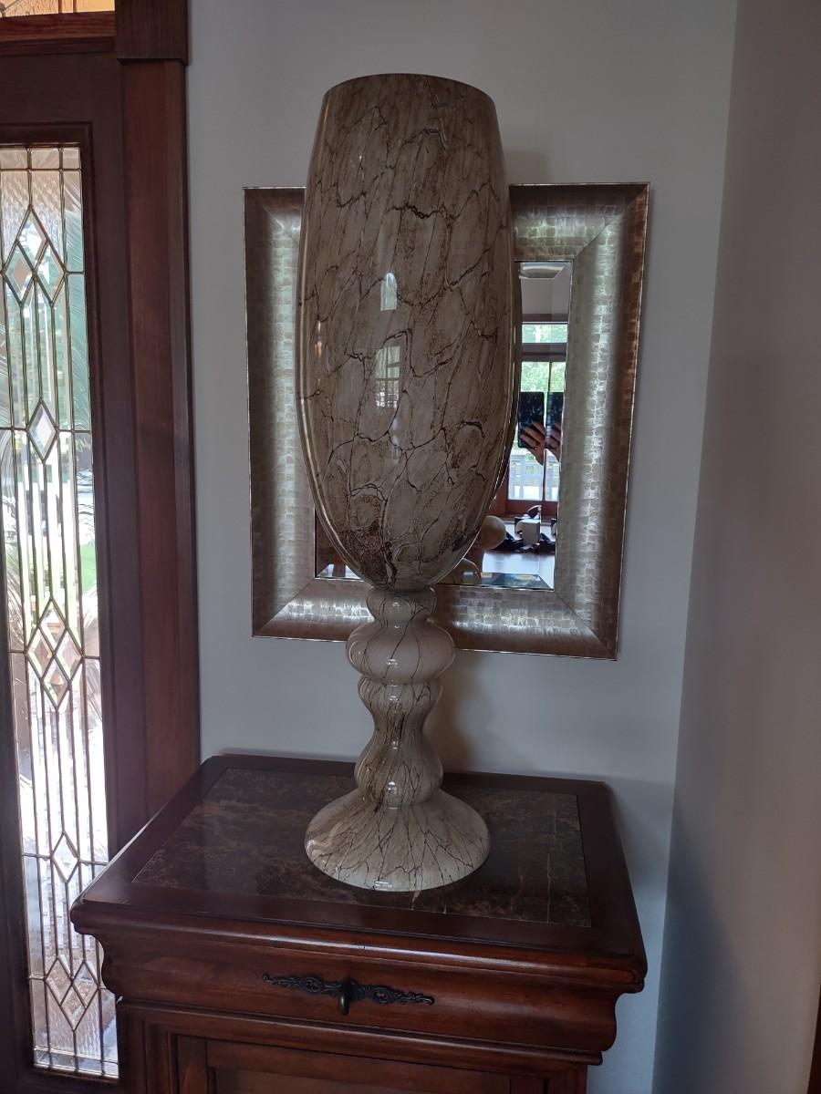 Beautiful Large Glass Vase and Mirror with gold accents. Mirror size is 22"×26" Please see all pictures as they are the best representation of the items. The pictures show condition, measurements if taken, and what is included in the lot. Due to the large amount that we photograph and the time frame, we are not always able to take measurements. All items unless noted, are pre-owned and have been used. If you purchased furniture, you must bring help. We do not allow one person to carry large furniture out on their own. Bring help, tools and a truck for the safety of our clients homes, and your personal safety. Company policy. Thank you.