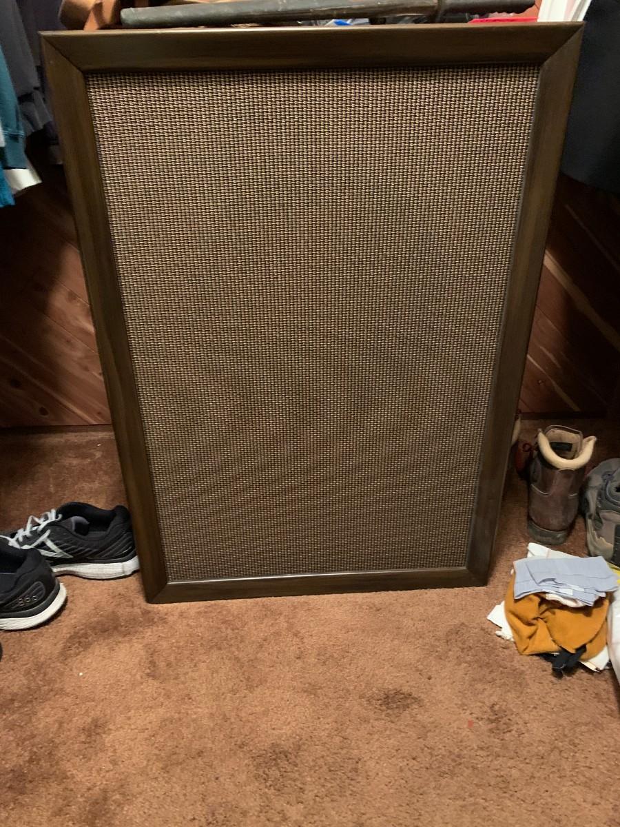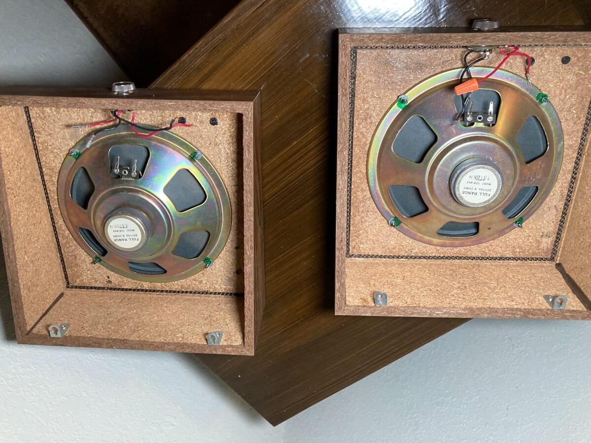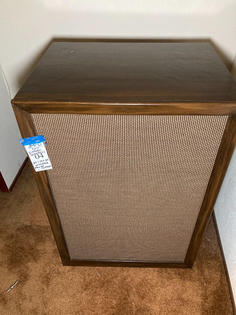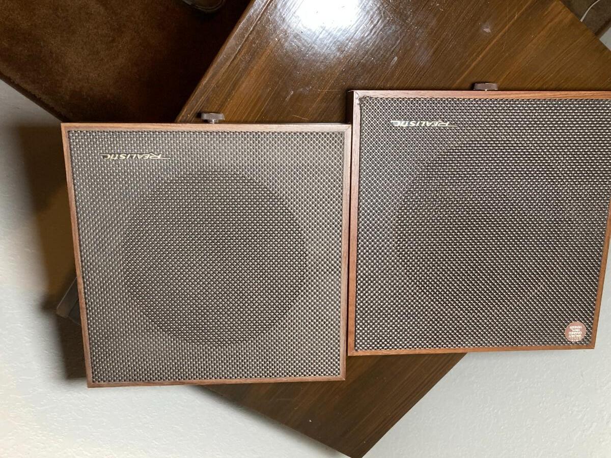 4 Vintage speakers, untested. Pair of custom 24x19x34 - no labels. Pair of Realistic vintage smaller speakers, untested. Speaker faces and bodies in good condition.