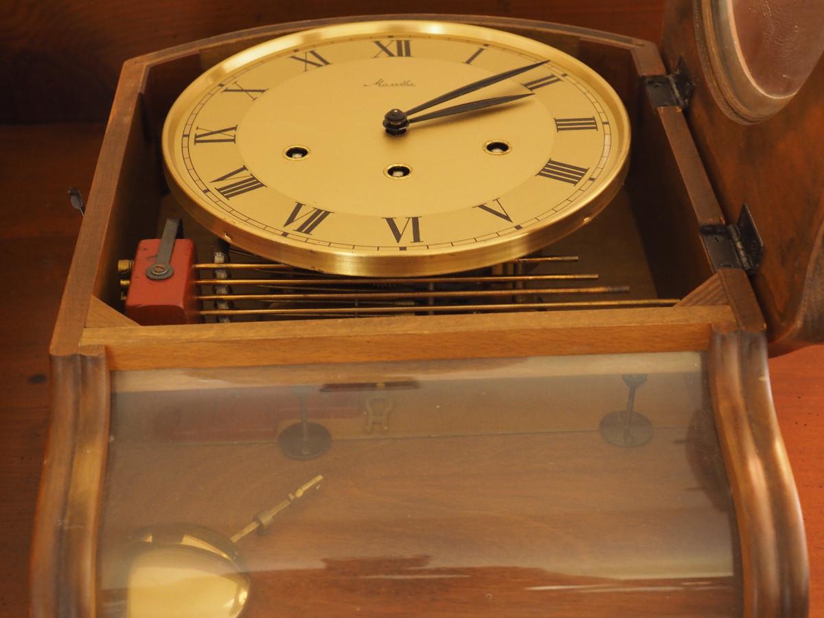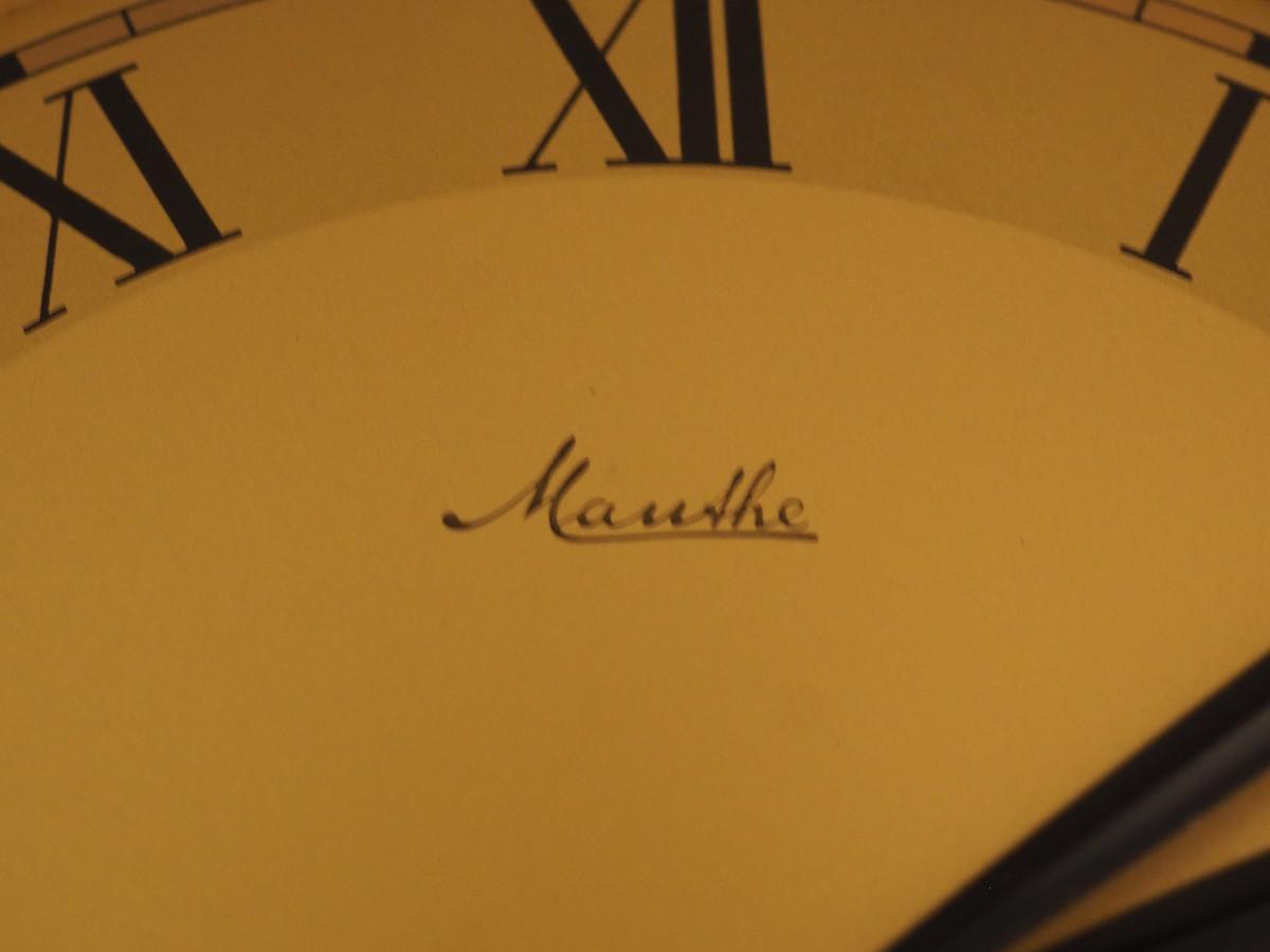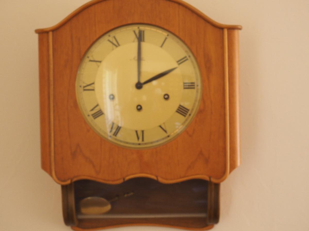 Lot 040 Mauthe Chiming Pendulum wood wall clock- Not currently working. manual sound of the chime is very sweet. 13" X 16" X 5".