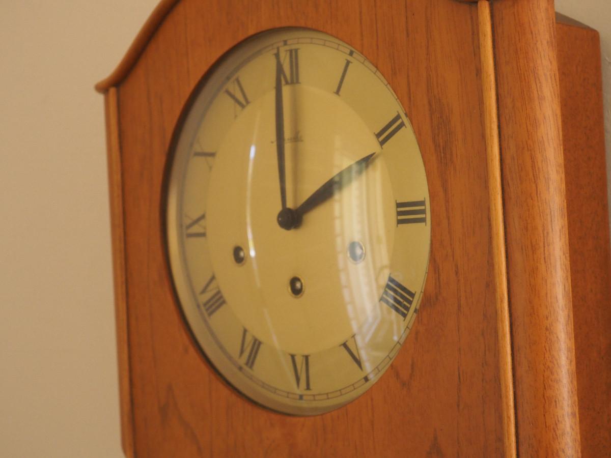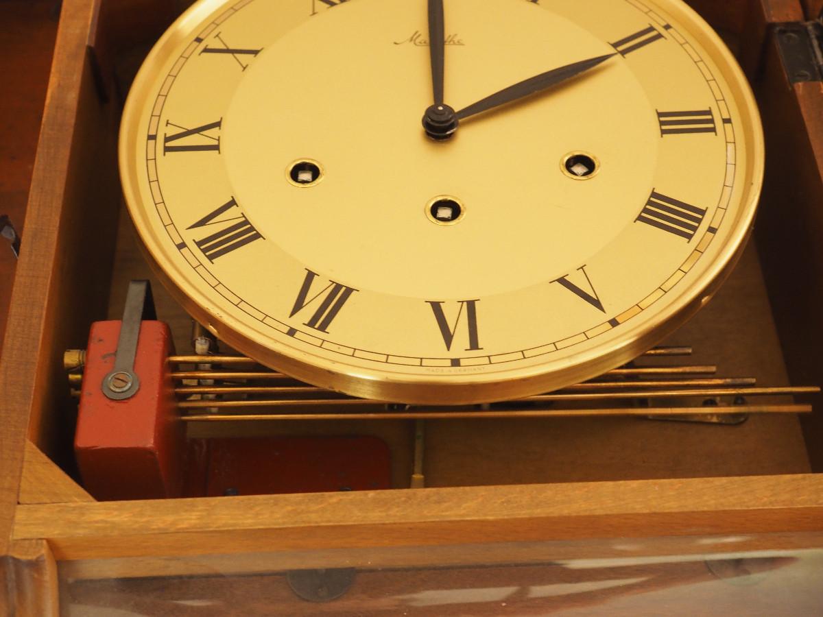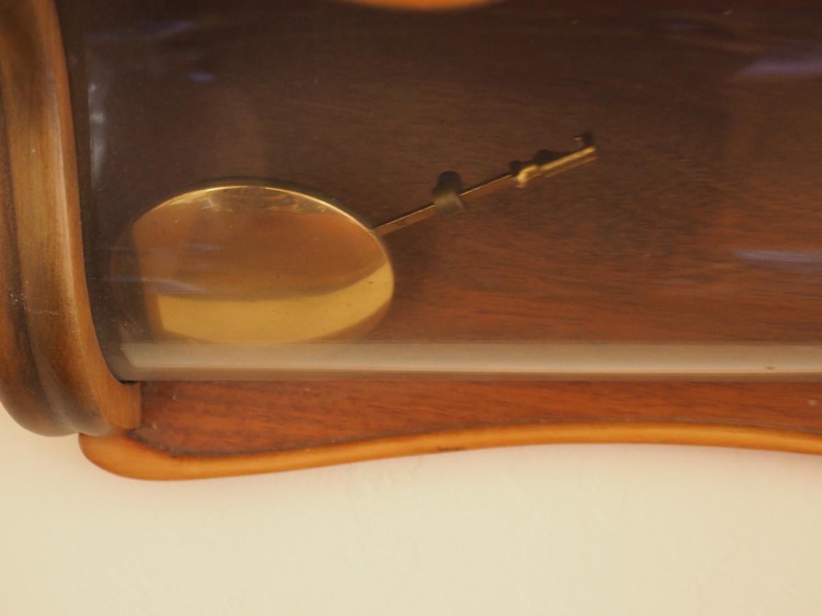 Lot 040 Mauthe Chiming Pendulum wood wall clock- Not currently working. manual sound of the chime is very sweet. 13" X 16" X 5".