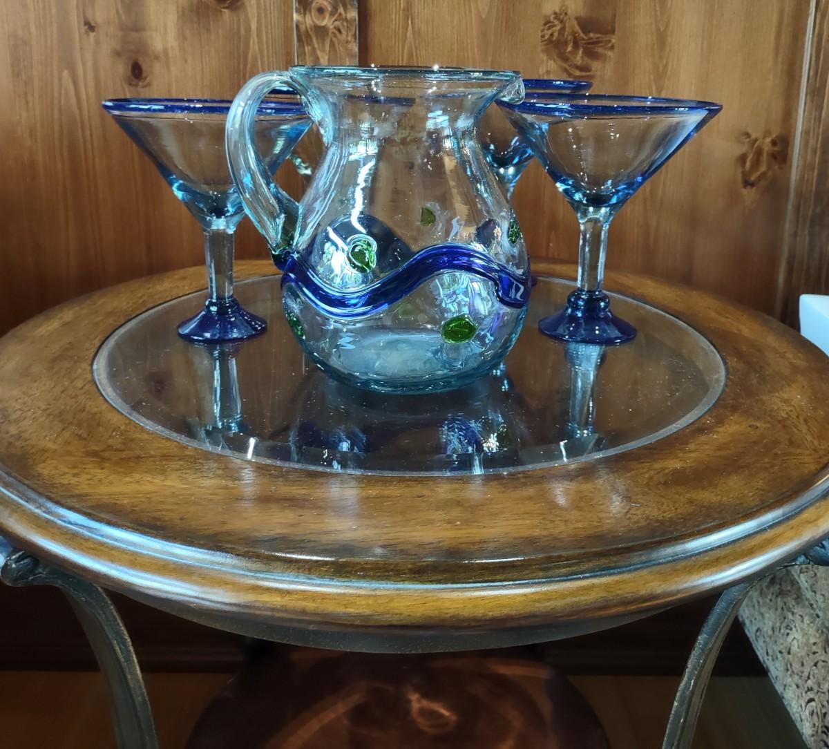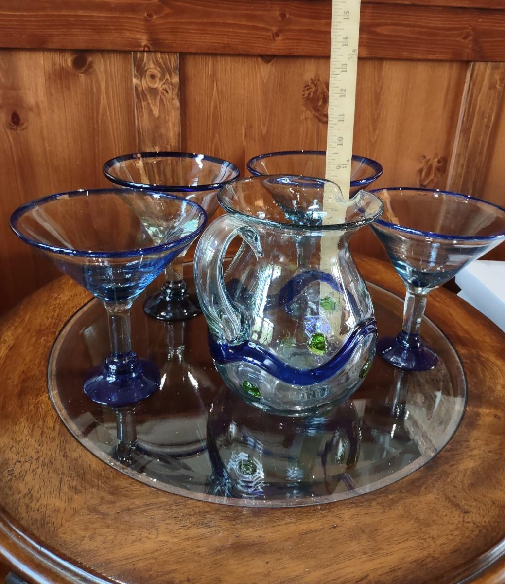 Hand Blown Pitcher & Margaretta Glasses.. Glasses Vary in Size Due To Being Hand Blown Please see all pictures as they are the best representation of the items. The pictures show condition, measurements if taken, and what is included in the lot. Due to the large amount that we photograph and the time frame, we are not always able to take measurements. All items unless noted, are pre-owned and have been used. If you purchased furniture, you must bring help. We do not allow one person to carry large furniture out on their own. Bring help, tools and a truck for the safety of our clients homes, and your personal safety. Company policy. Thank you.