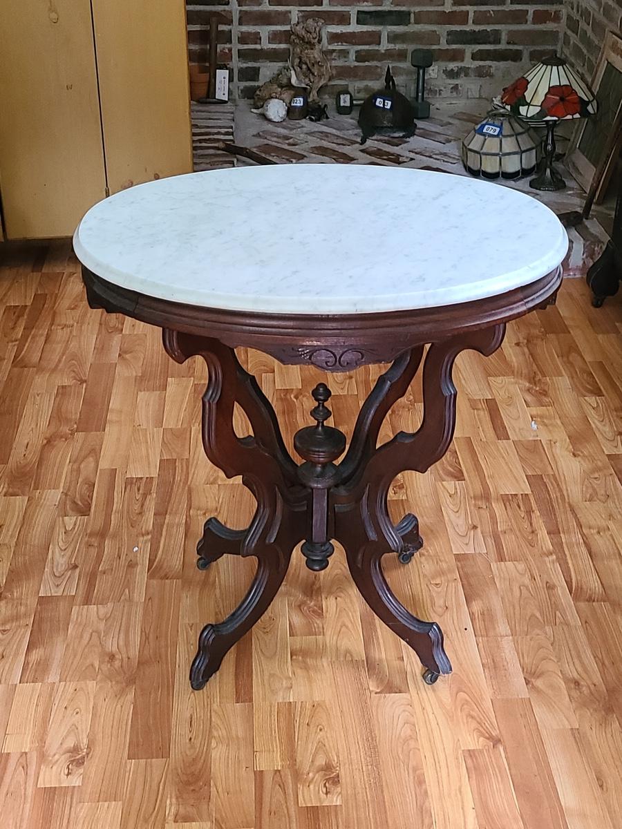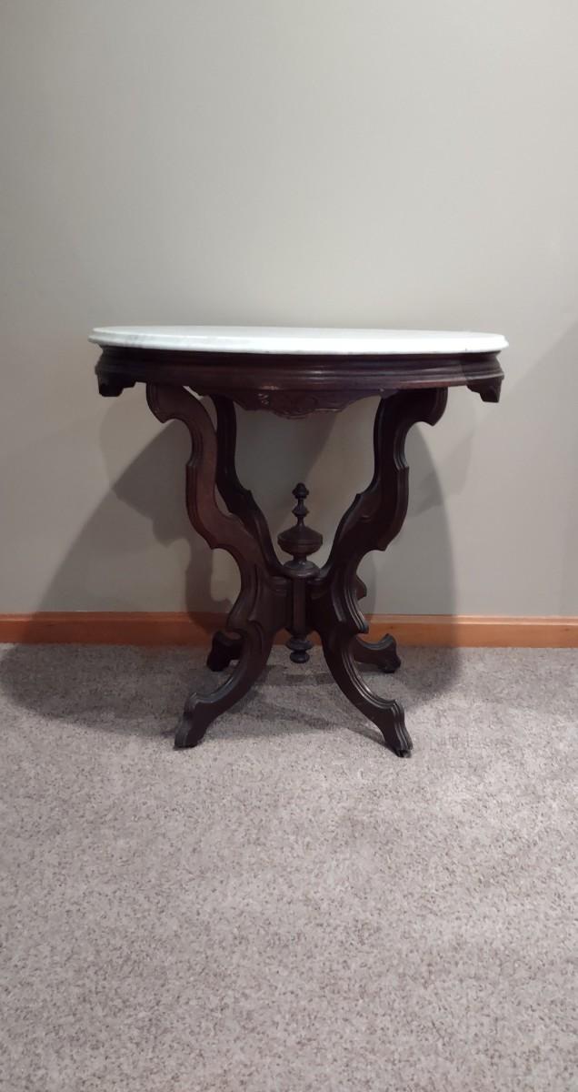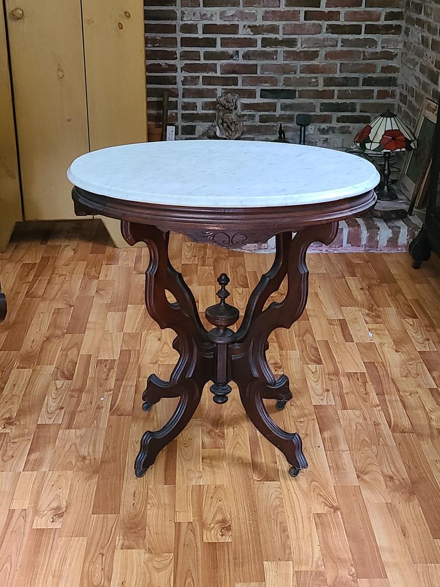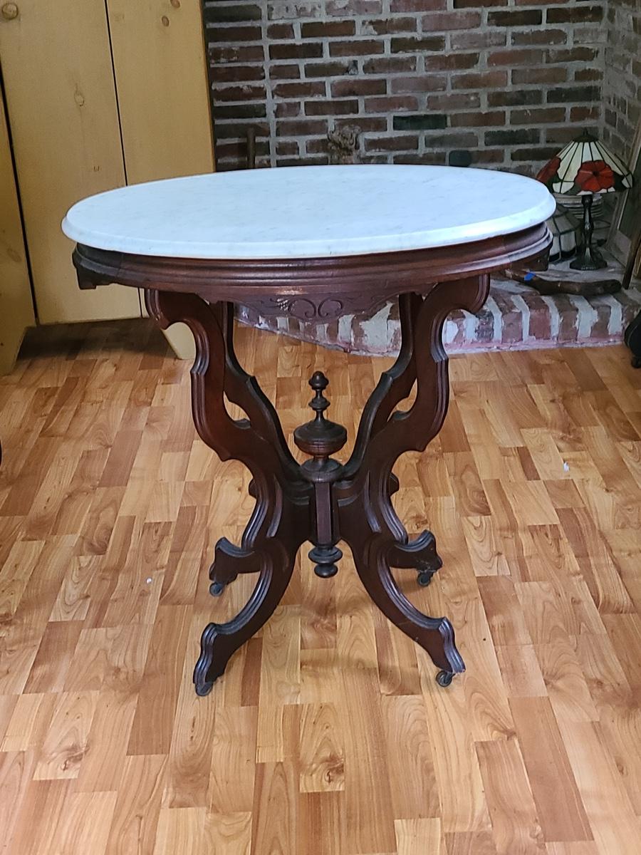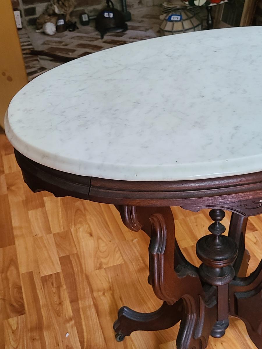 Antique Marble Top Parlor Table 29×22×29. Please see all pictures as they are the best representation of the items. The pictures show condition, measurements if taken, and what is included in the lot. Due to the large amount that we photograph and the time frame, we are not always able to take measurements. All items unless noted, are pre-owned and have been used. If you purchased furniture, you must bring help. We do not allow one person to carry large furniture out on their own. Bring help, tools and a truck for the safety of our client’s homes, and your personal safety. Company policy. Thank you.