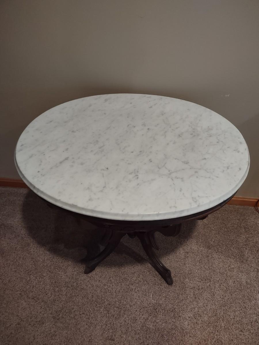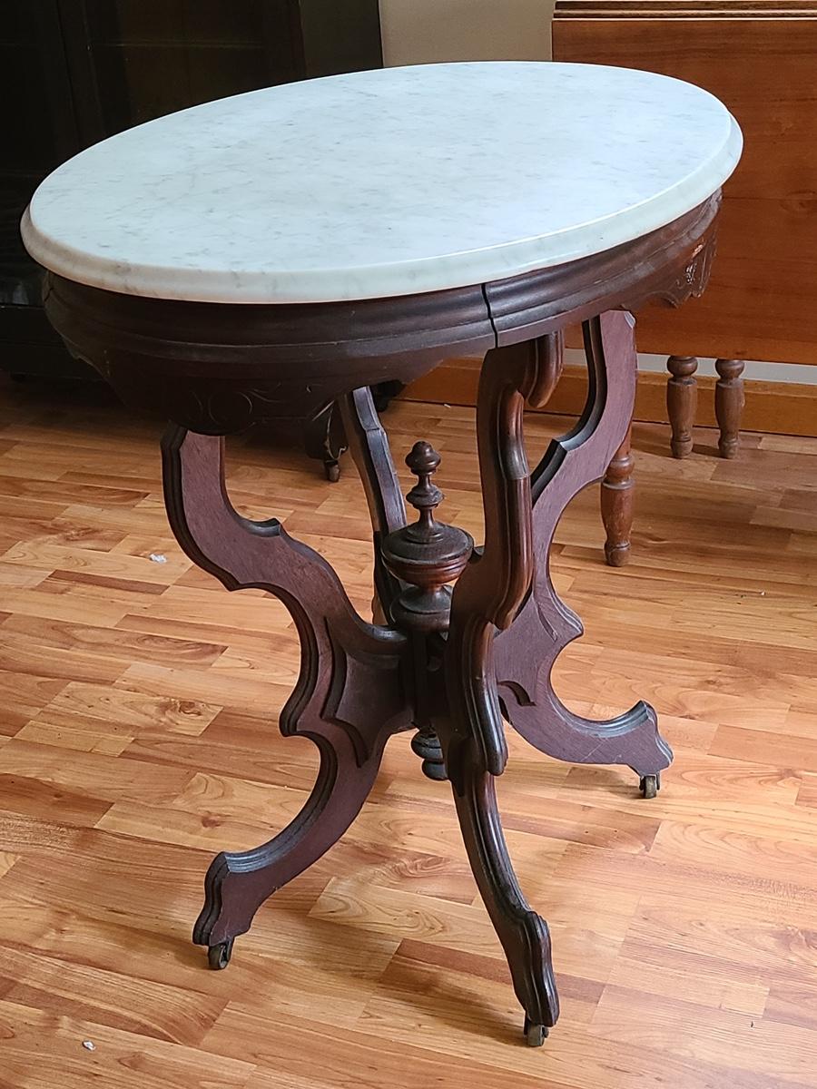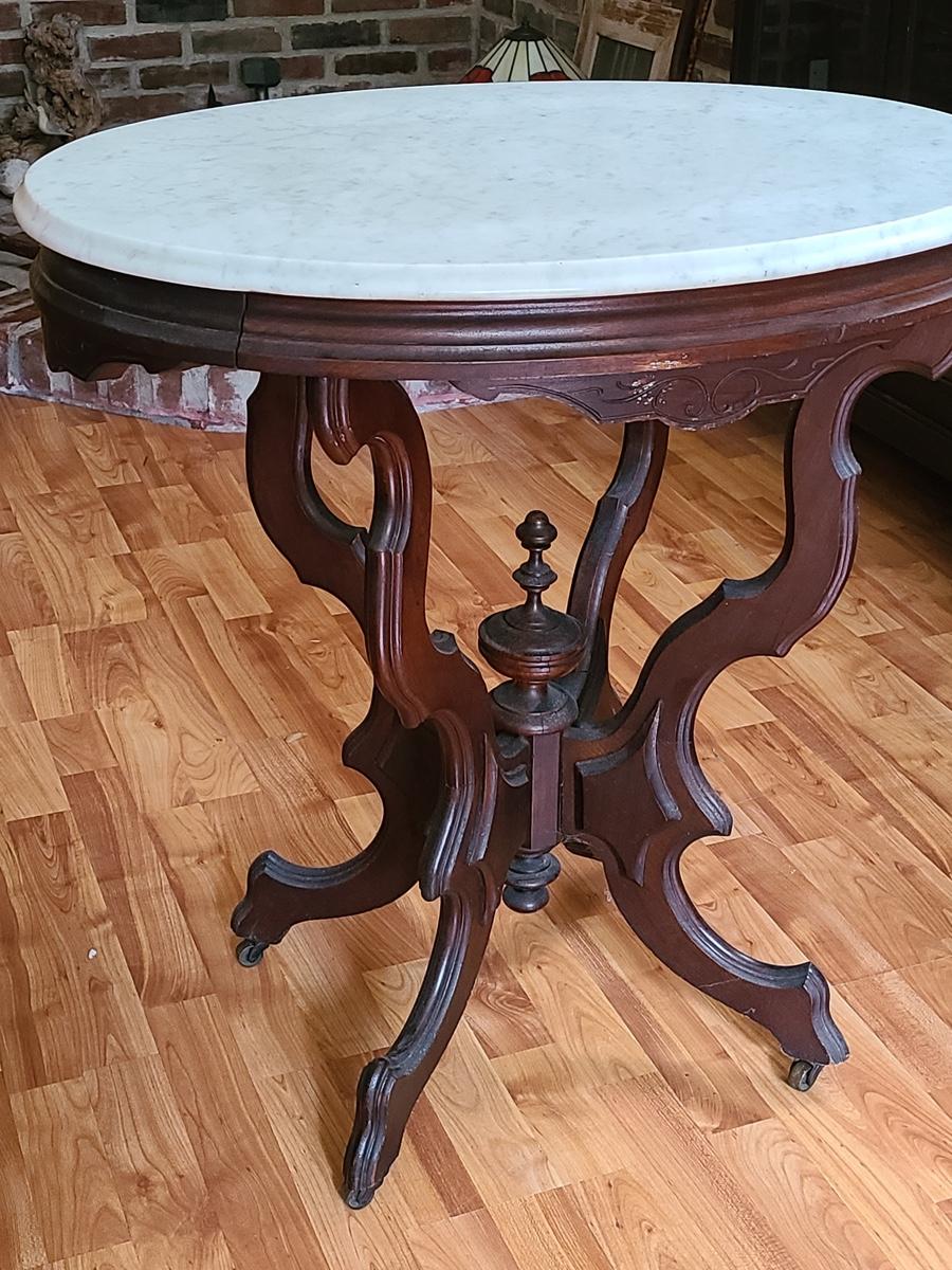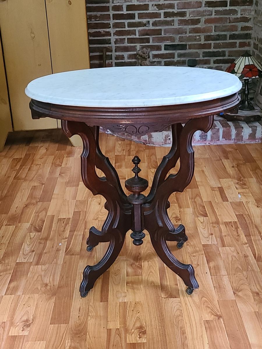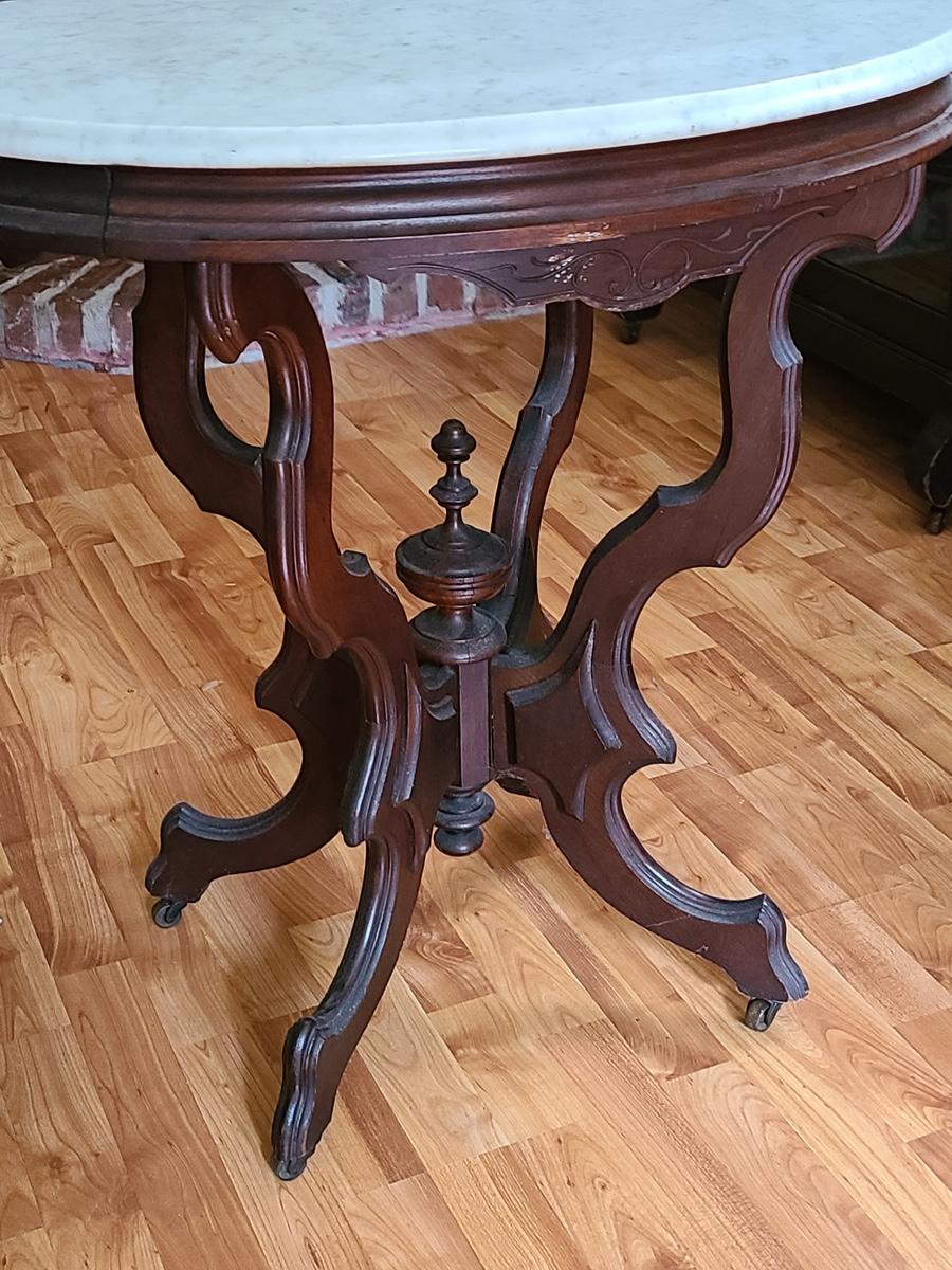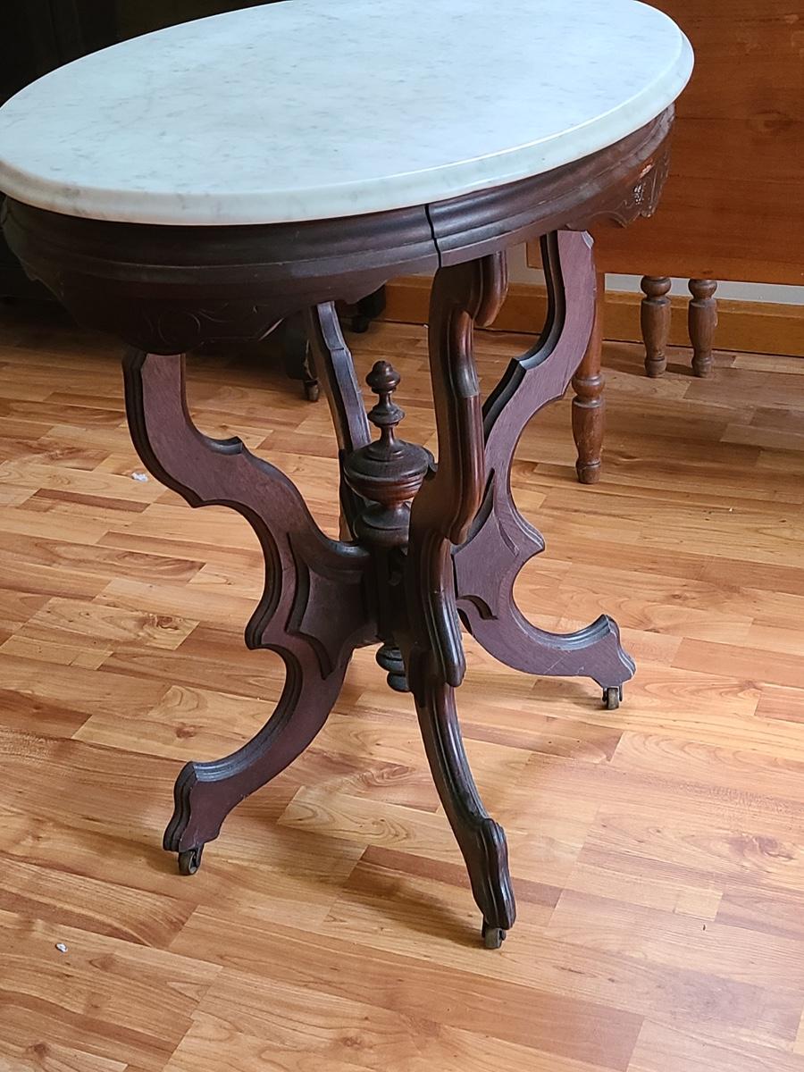 Antique Marble Top Parlor Table 29×22×29. Please see all pictures as they are the best representation of the items. The pictures show condition, measurements if taken, and what is included in the lot. Due to the large amount that we photograph and the time frame, we are not always able to take measurements. All items unless noted, are pre-owned and have been used. If you purchased furniture, you must bring help. We do not allow one person to carry large furniture out on their own. Bring help, tools and a truck for the safety of our client’s homes, and your personal safety. Company policy. Thank you.