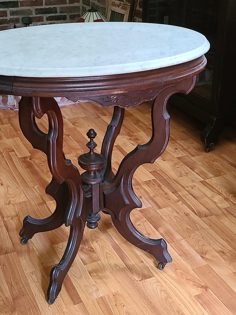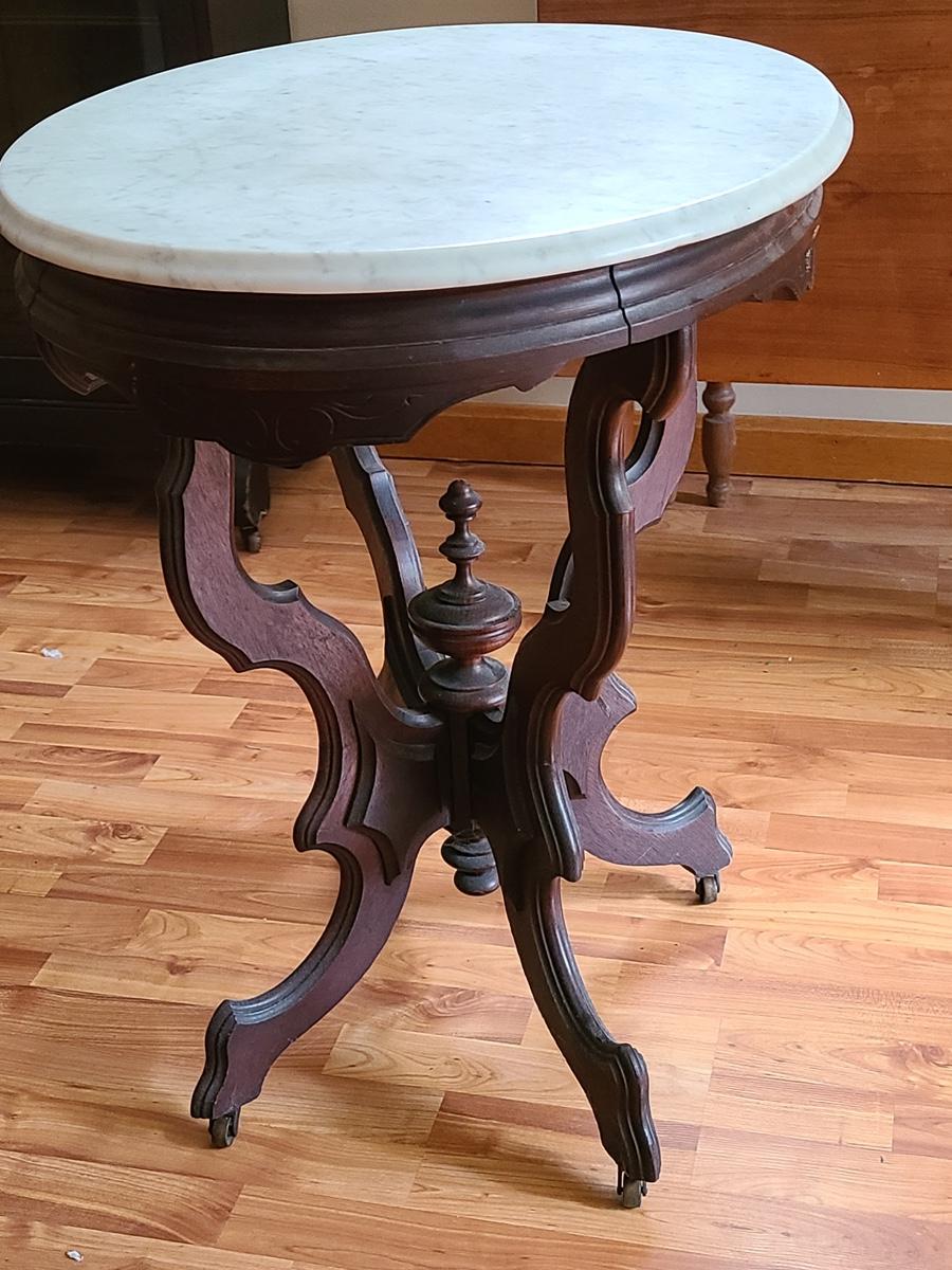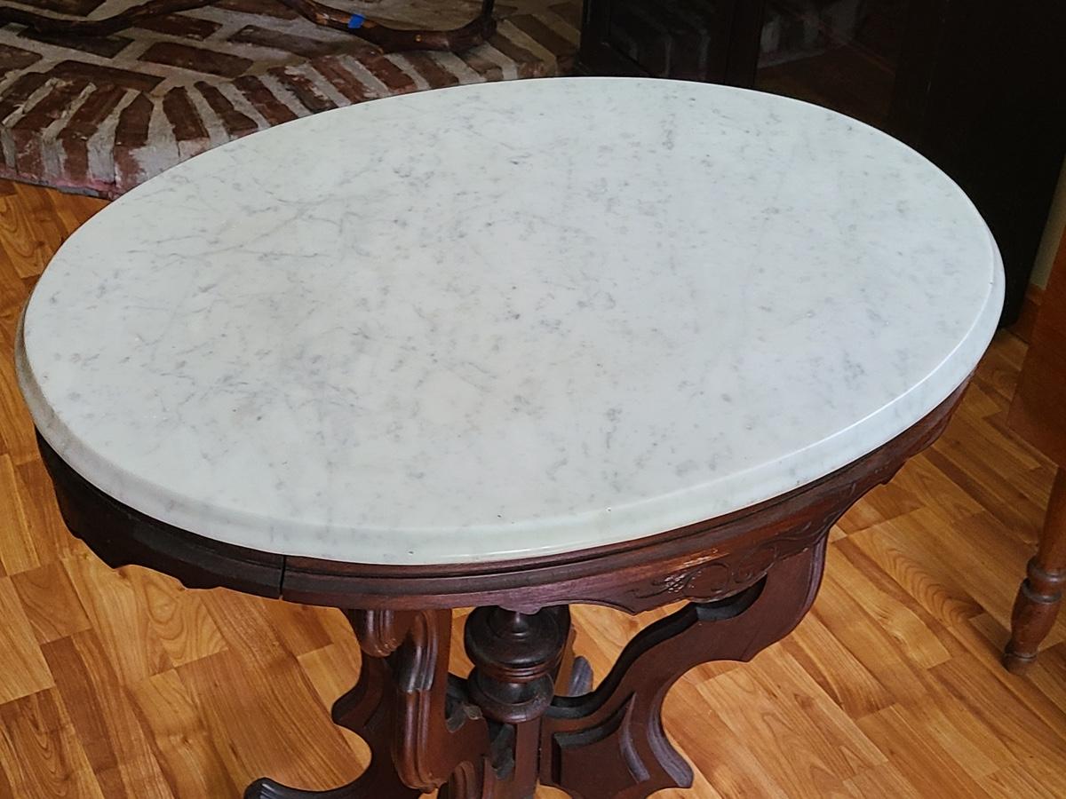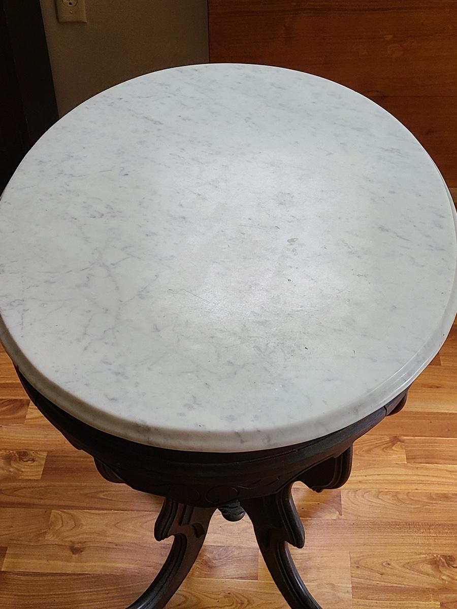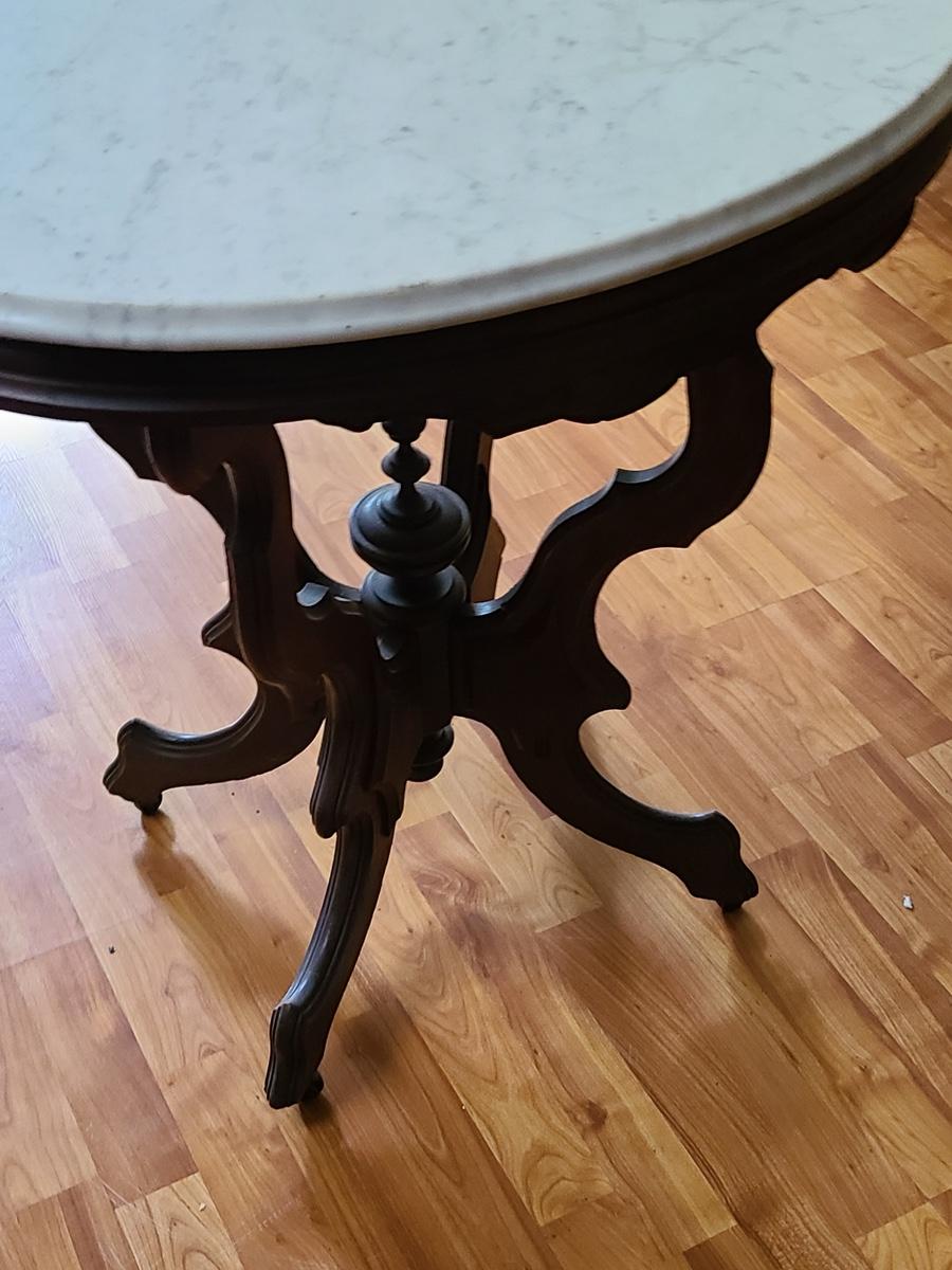 Antique Marble Top Parlor Table 29×22×29. Please see all pictures as they are the best representation of the items. The pictures show condition, measurements if taken, and what is included in the lot. Due to the large amount that we photograph and the time frame, we are not always able to take measurements. All items unless noted, are pre-owned and have been used. If you purchased furniture, you must bring help. We do not allow one person to carry large furniture out on their own. Bring help, tools and a truck for the safety of our client’s homes, and your personal safety. Company policy. Thank you.