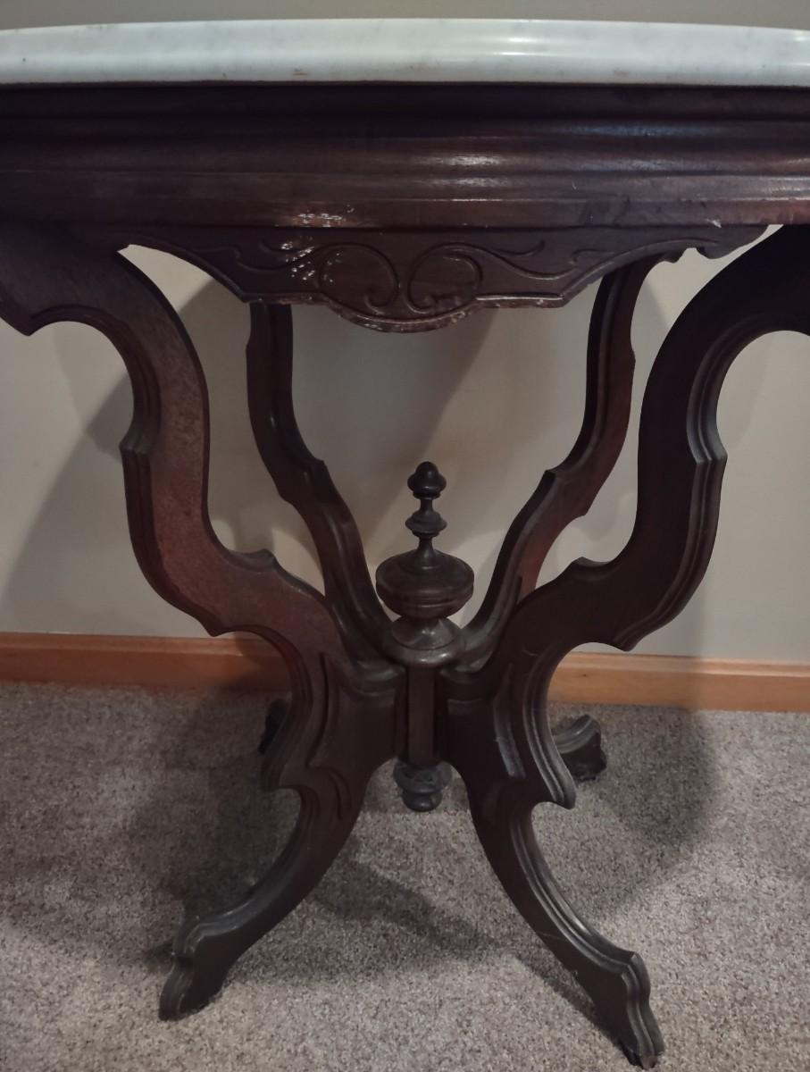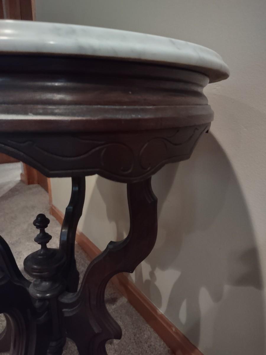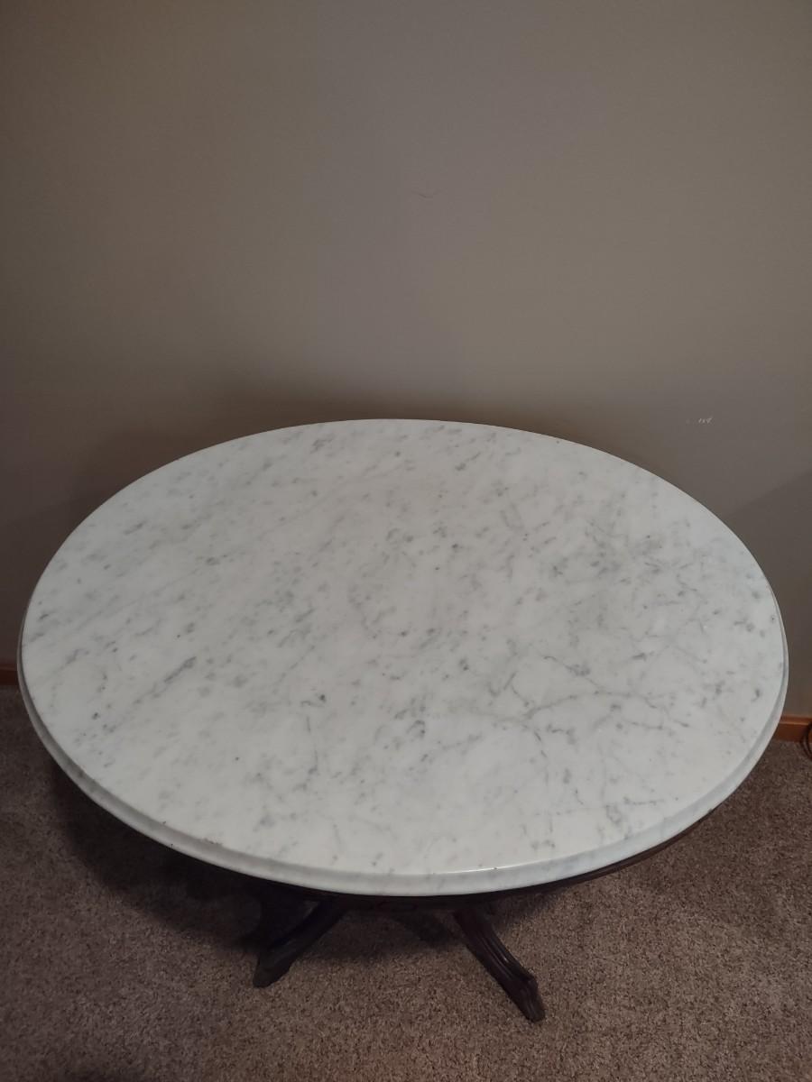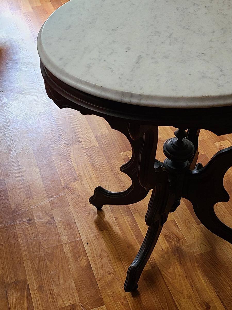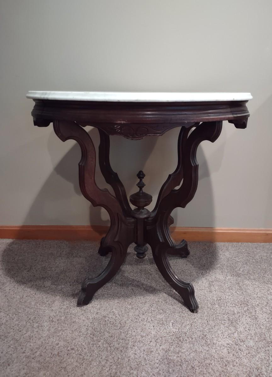Antique Marble Top Parlor Table 29×22×29. Please see all pictures as they are the best representation of the items. The pictures show condition, measurements if taken, and what is included in the lot. Due to the large amount that we photograph and the time frame, we are not always able to take measurements. All items unless noted, are pre-owned and have been used. If you purchased furniture, you must bring help. We do not allow one person to carry large furniture out on their own. Bring help, tools and a truck for the safety of our client’s homes, and your personal safety. Company policy. Thank you.