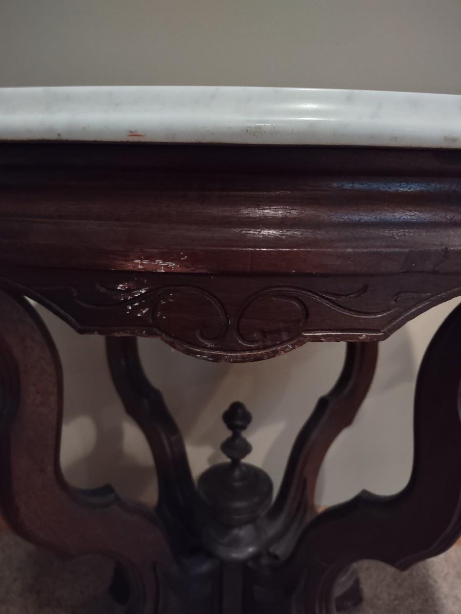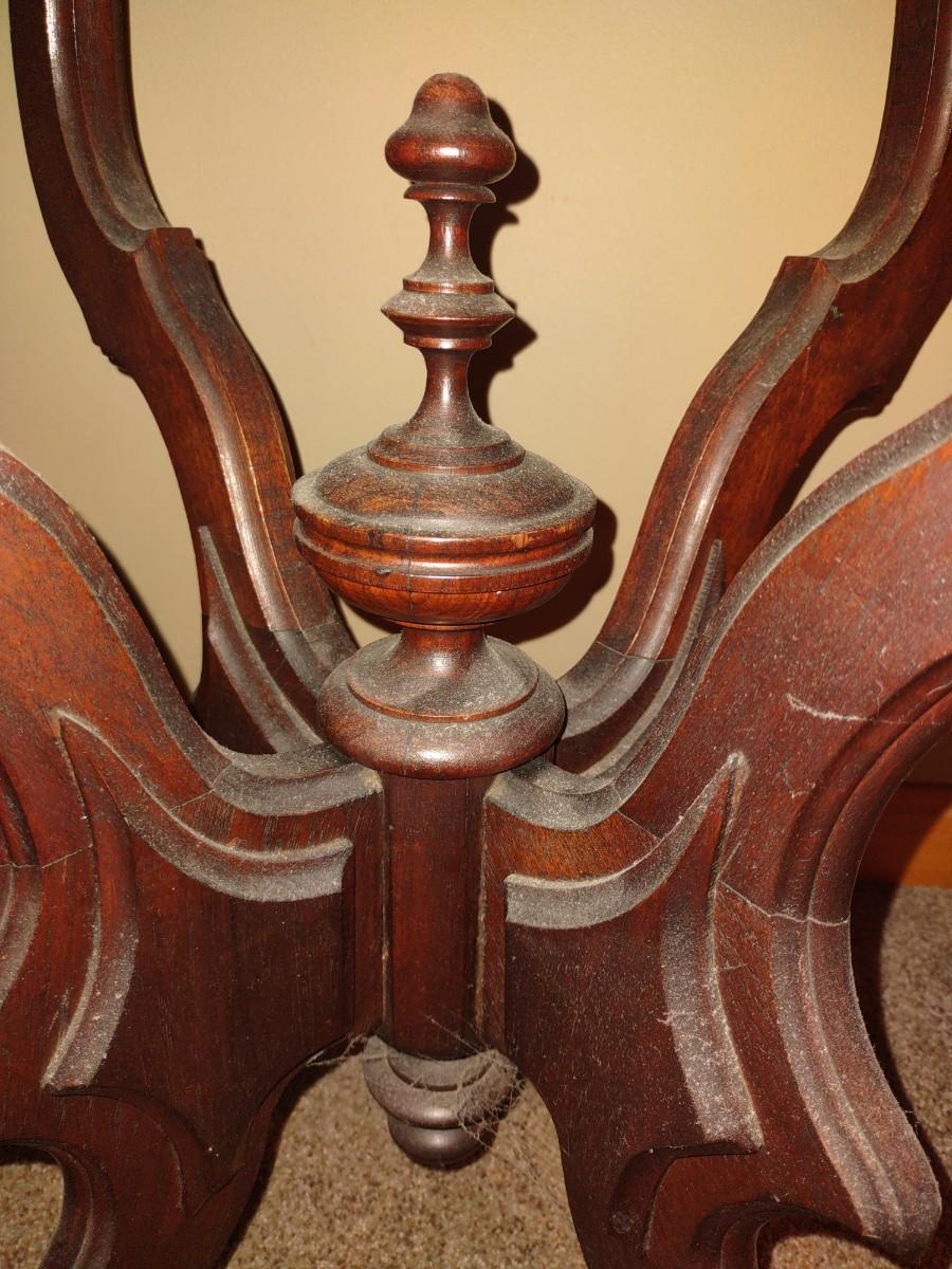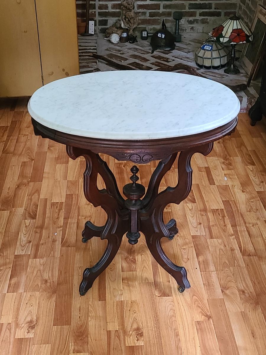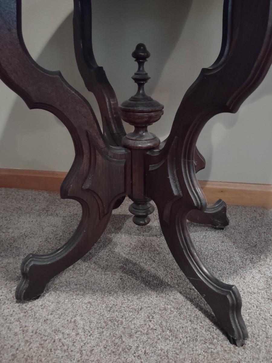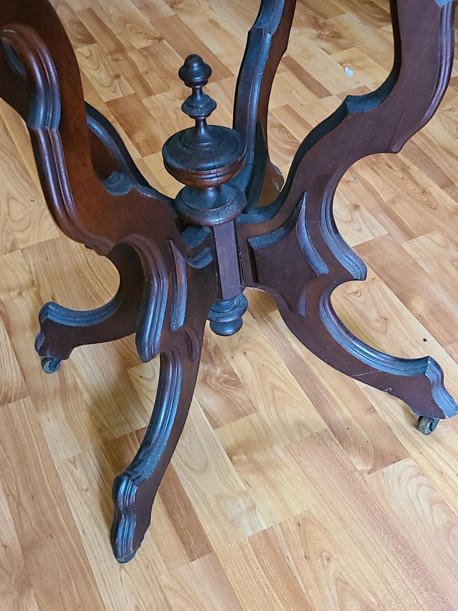 Antique Marble Top Parlor Table 29×22×29. Please see all pictures as they are the best representation of the items. The pictures show condition, measurements if taken, and what is included in the lot. Due to the large amount that we photograph and the time frame, we are not always able to take measurements. All items unless noted, are pre-owned and have been used. If you purchased furniture, you must bring help. We do not allow one person to carry large furniture out on their own. Bring help, tools and a truck for the safety of our client’s homes, and your personal safety. Company policy. Thank you.