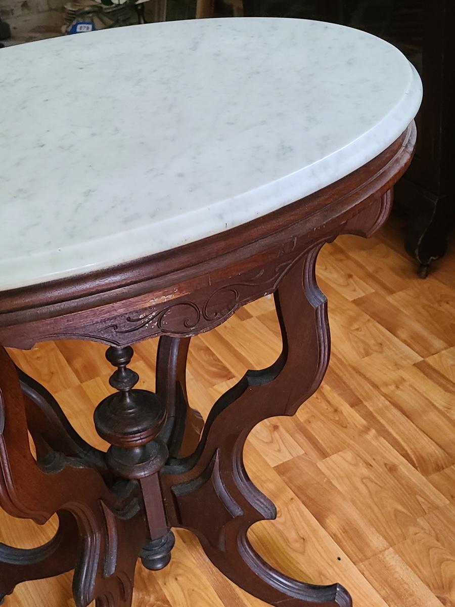 Lot 040: Victorian Oval, Wood Carved/Marble Top Parlor Table