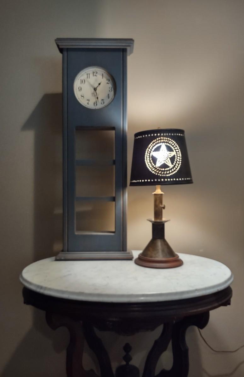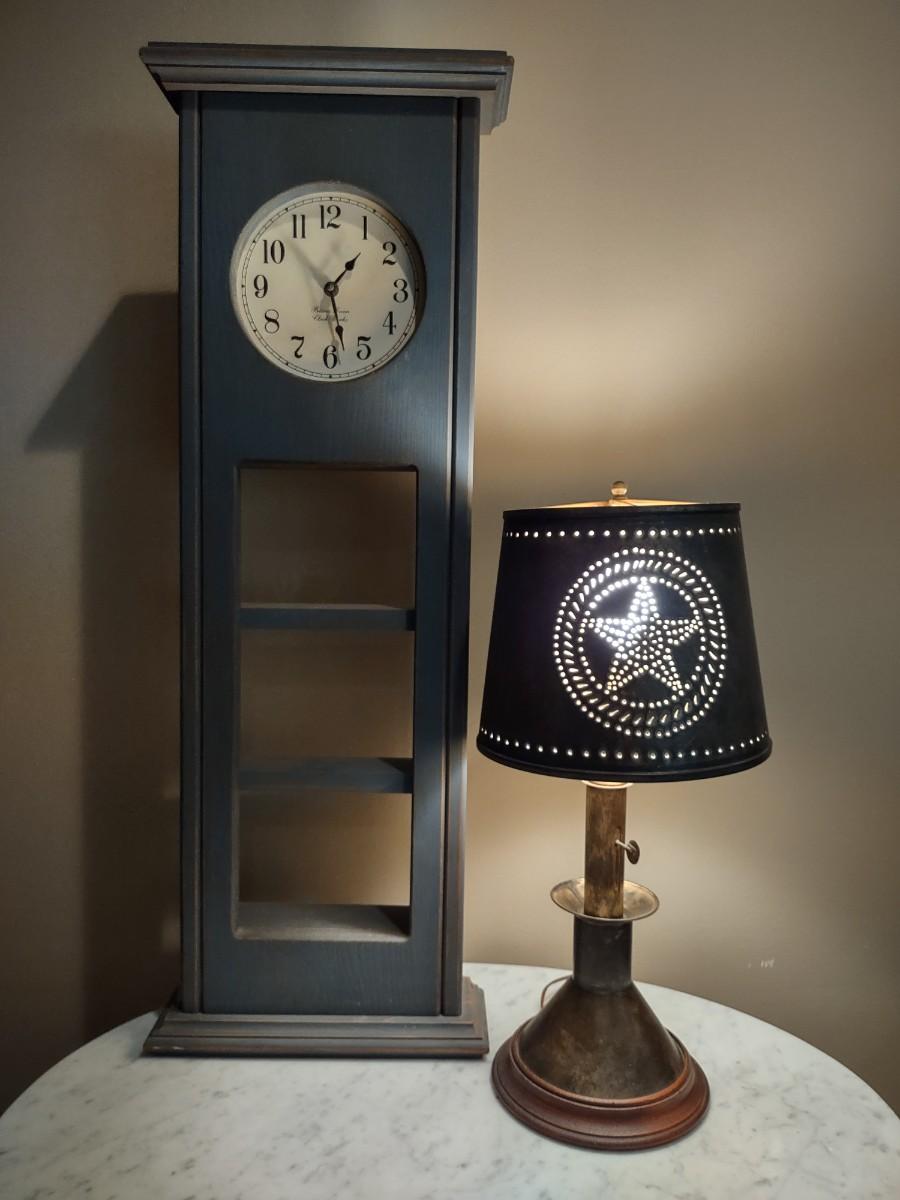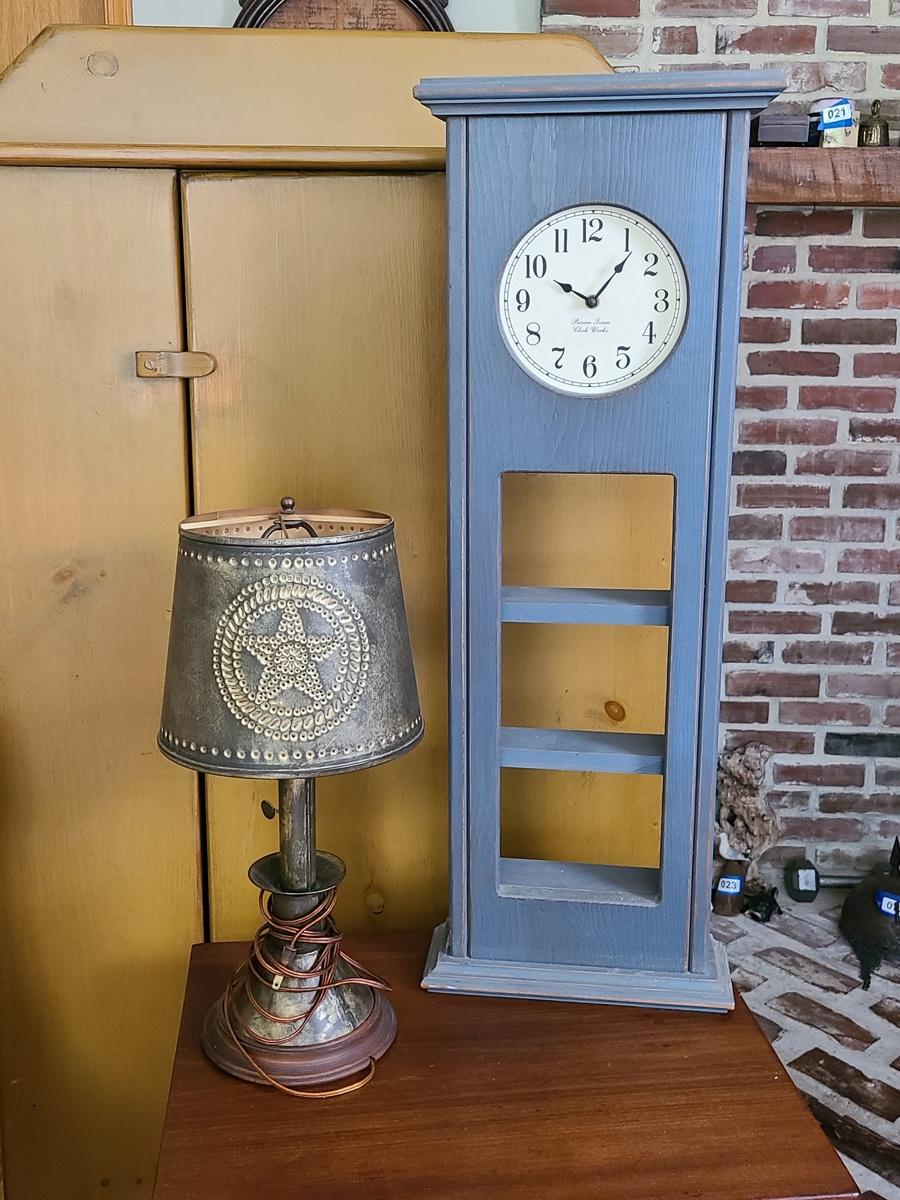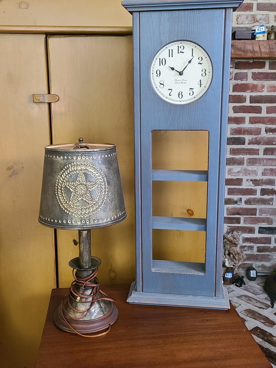 Battery Operated Clock 34"" tall with shelves. Primitive Punched Tin Star Lamp 19". Please see all pictures as they are the best representation of the items. The pictures show condition, measurements if taken, and what is included in the lot. Due to the large amount that we photograph and the time frame, we are not always able to take measurements. All items unless noted, are pre-owned and have been used. If you purchased furniture, you must bring help. We do not allow one person to carry large furniture out on their own. Bring help, tools and a truck for the safety of our client’s homes, and your personal safety. Company policy. Thank you.
