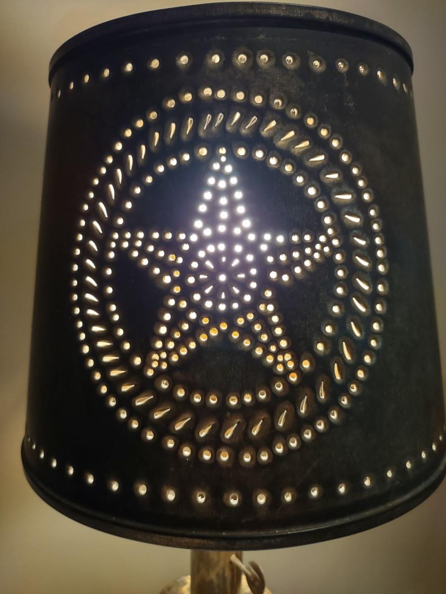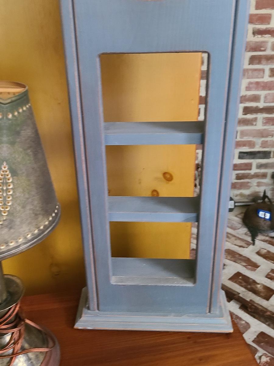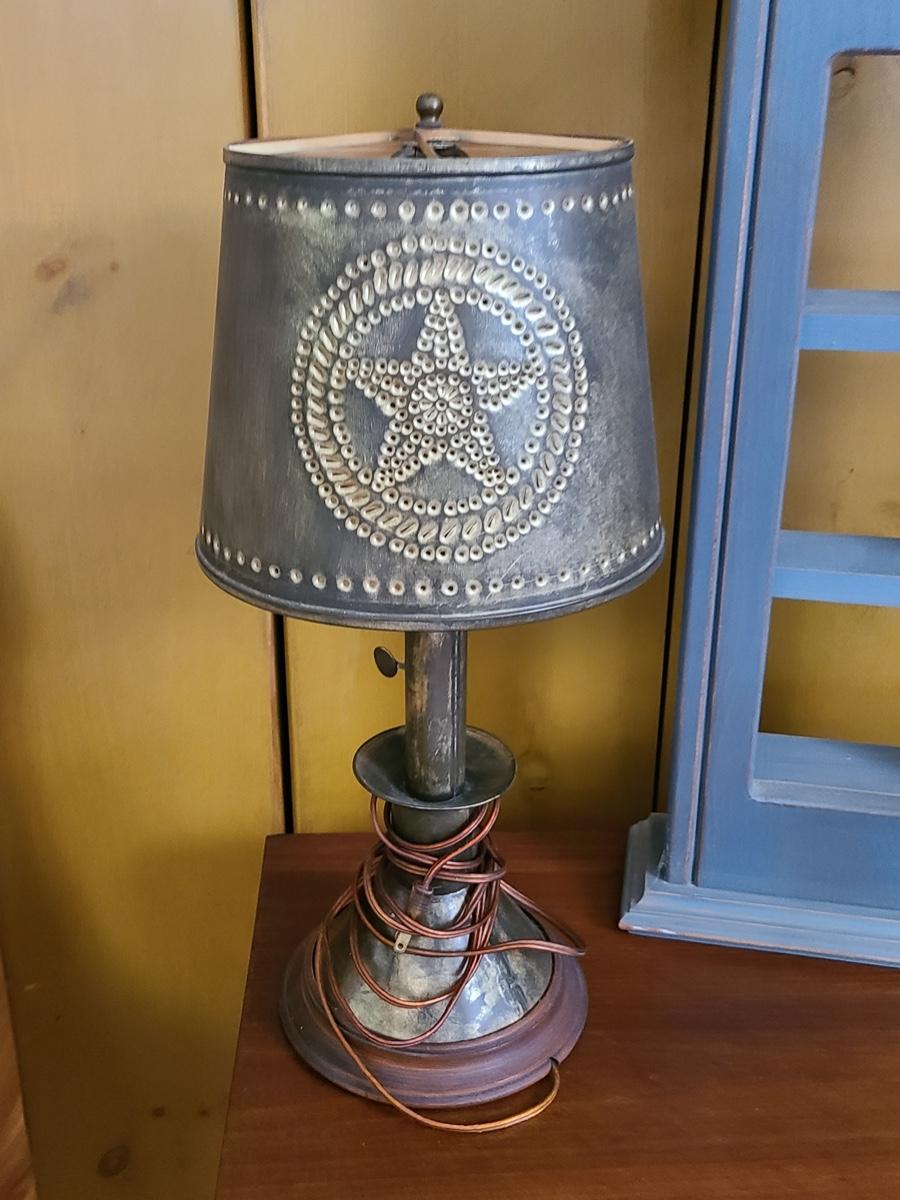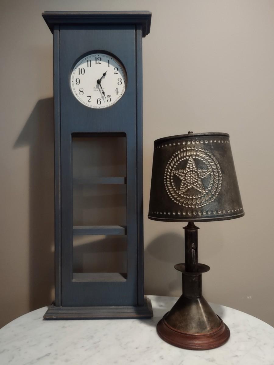 Battery Operated Clock 34"" tall with shelves. Primitive Punched Tin Star Lamp 19". Please see all pictures as they are the best representation of the items. The pictures show condition, measurements if taken, and what is included in the lot. Due to the large amount that we photograph and the time frame, we are not always able to take measurements. All items unless noted, are pre-owned and have been used. If you purchased furniture, you must bring help. We do not allow one person to carry large furniture out on their own. Bring help, tools and a truck for the safety of our client’s homes, and your personal safety. Company policy. Thank you.