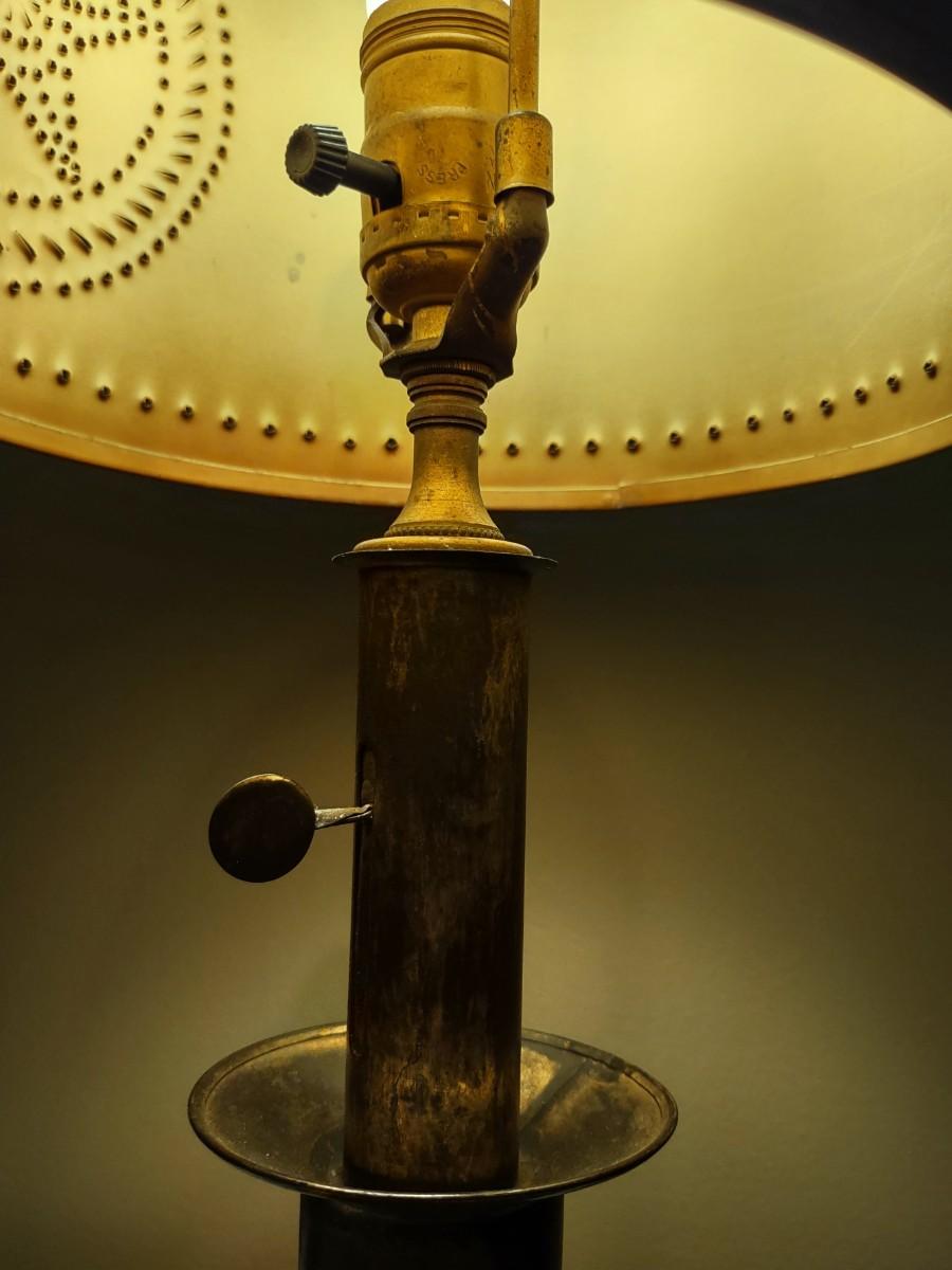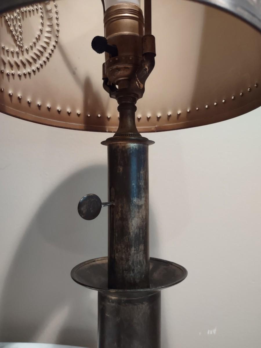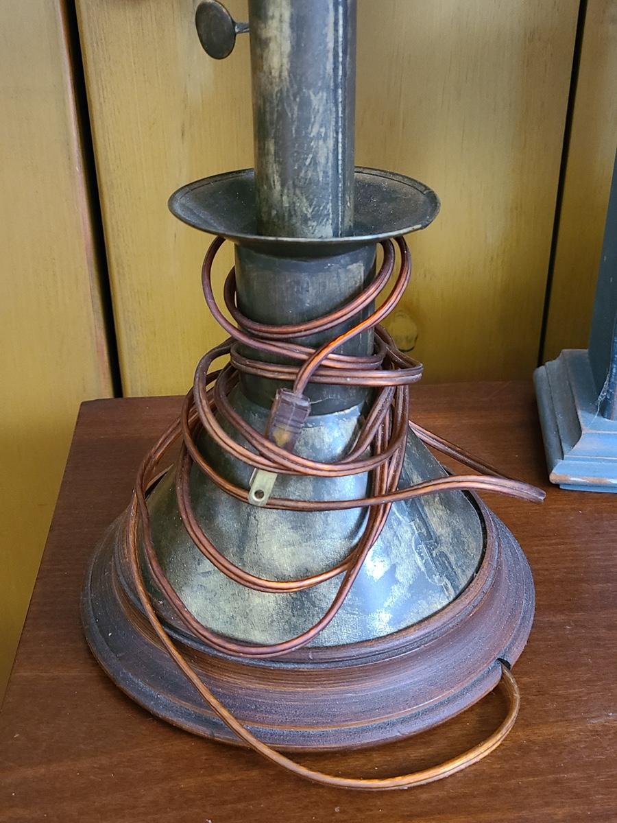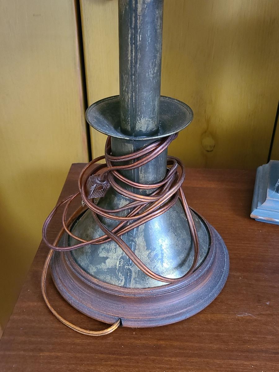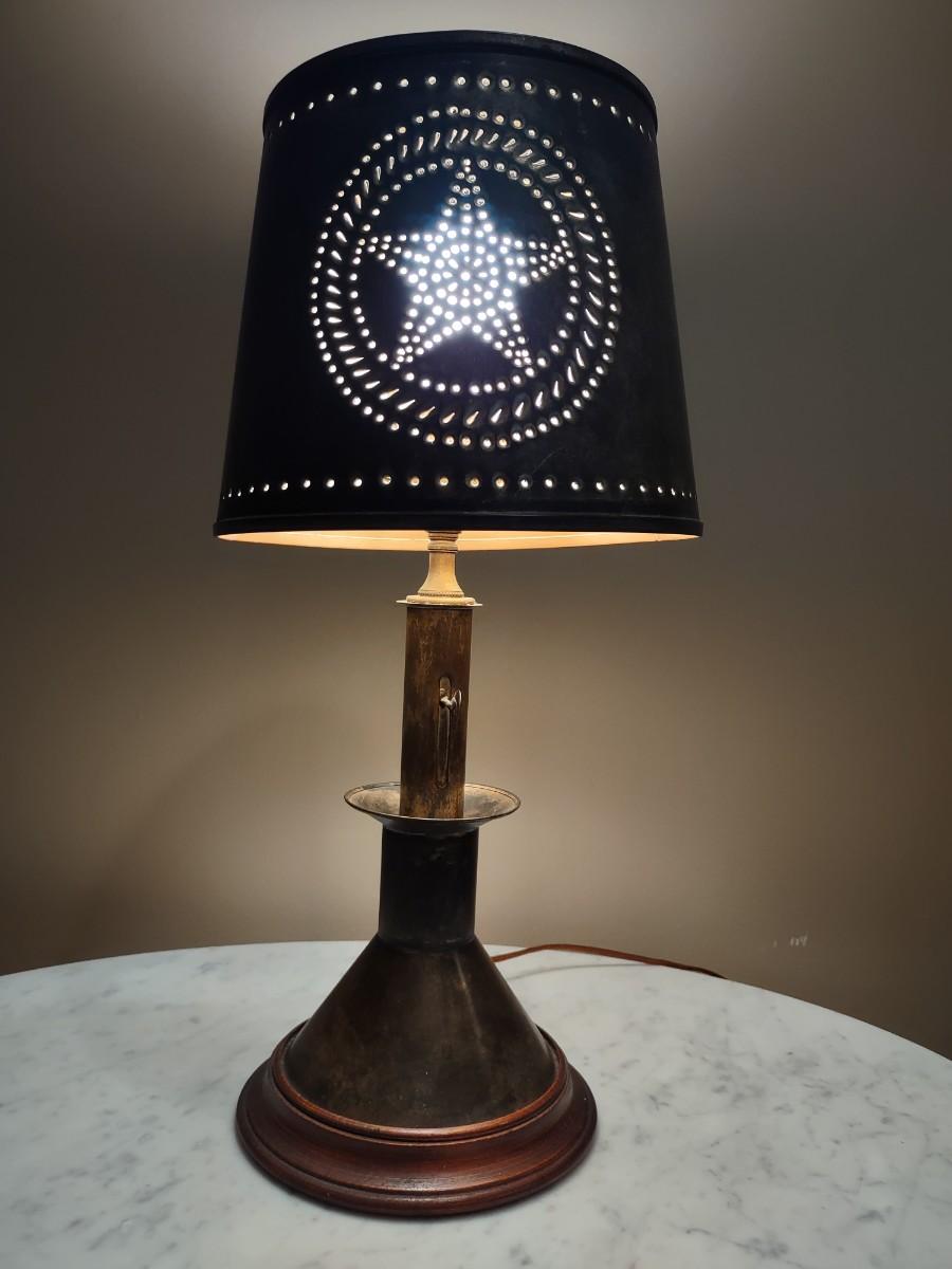 Lot 041: Cottage Blue Clock Shelf & Punched Tin "Star" Candlestick Lamp