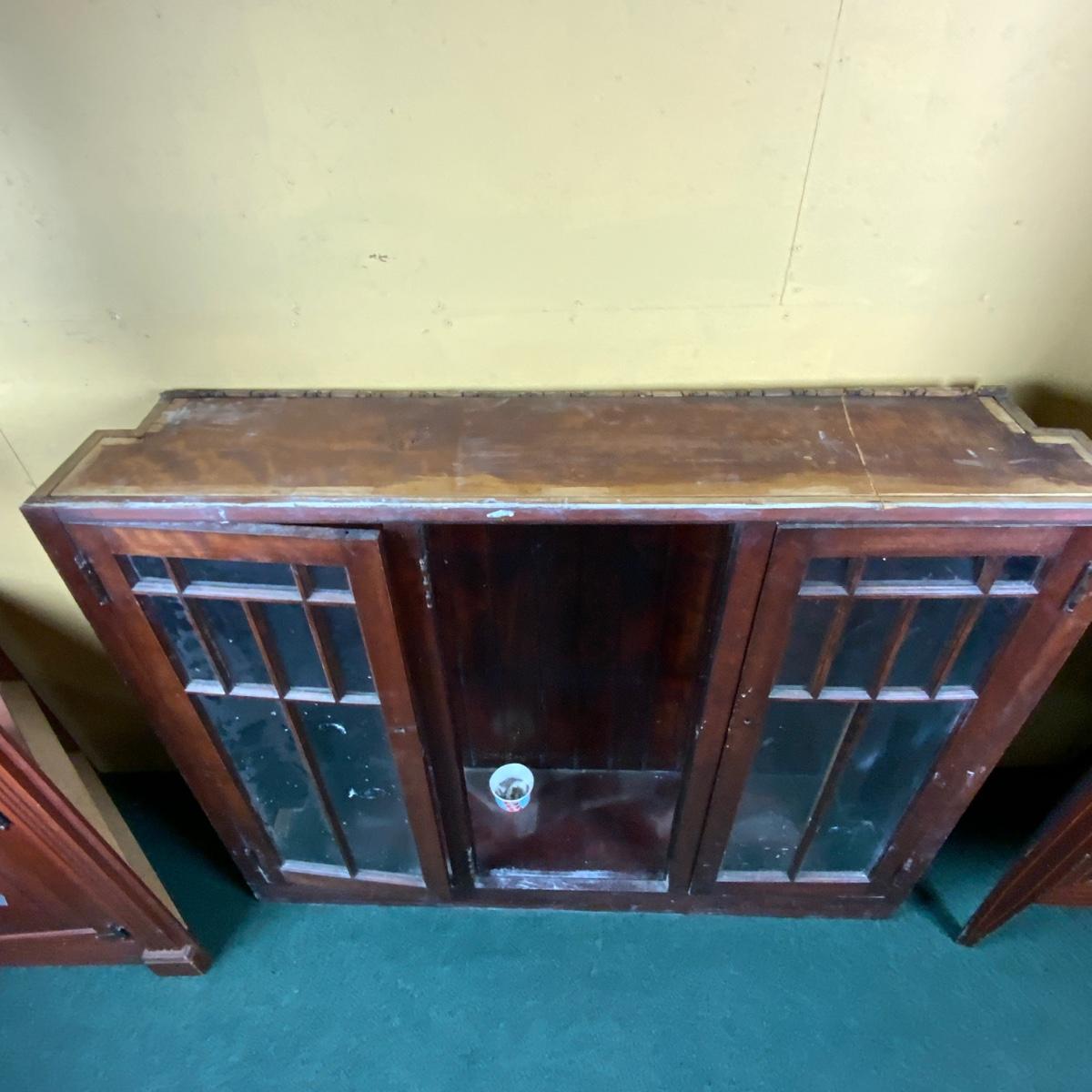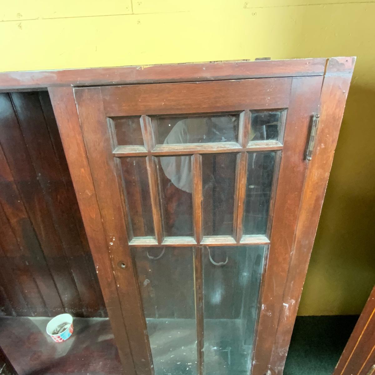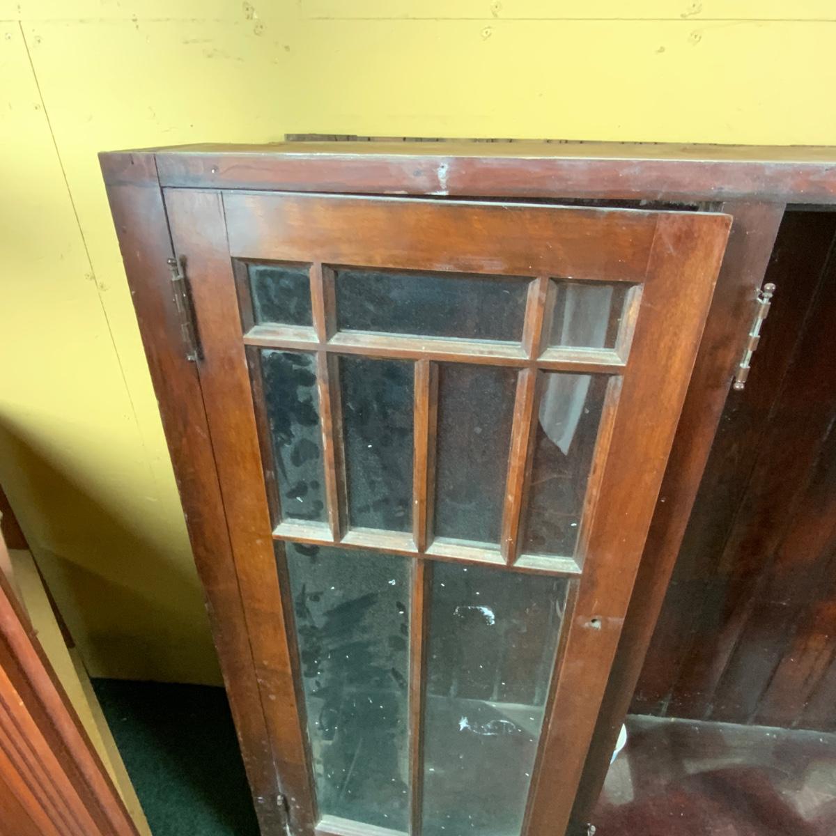 Mission Style Wall Cabinet. Top and sides are unfinished. Believed to be salvaged from part of a built-in. //::\\ Please see photos for details and condition. No attempt has been made to hide any imperfections. All items listed in this auction are warehouse items, and need to be cleaned. A majority of the items need restoration as well. All items are sold AS IS and WITHOUT GUARANTEE. If you are uncertain about an item, DO NOT BID. Due to the nature of this online auction in-person inspection is HIGHLY recommended. All Sales are FINAL. Pick Up Times are FIRM. Please confirm with your own schedule that you can pick up in the scheduled times listed in the Terms and Conditions. Any questions please message the auctioneer. DO NOT Contact The Harp Gallery.