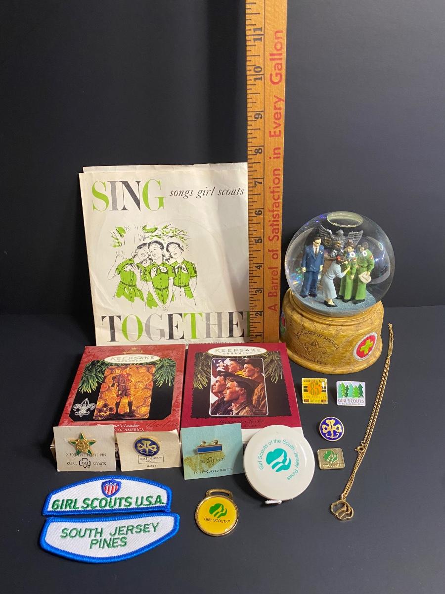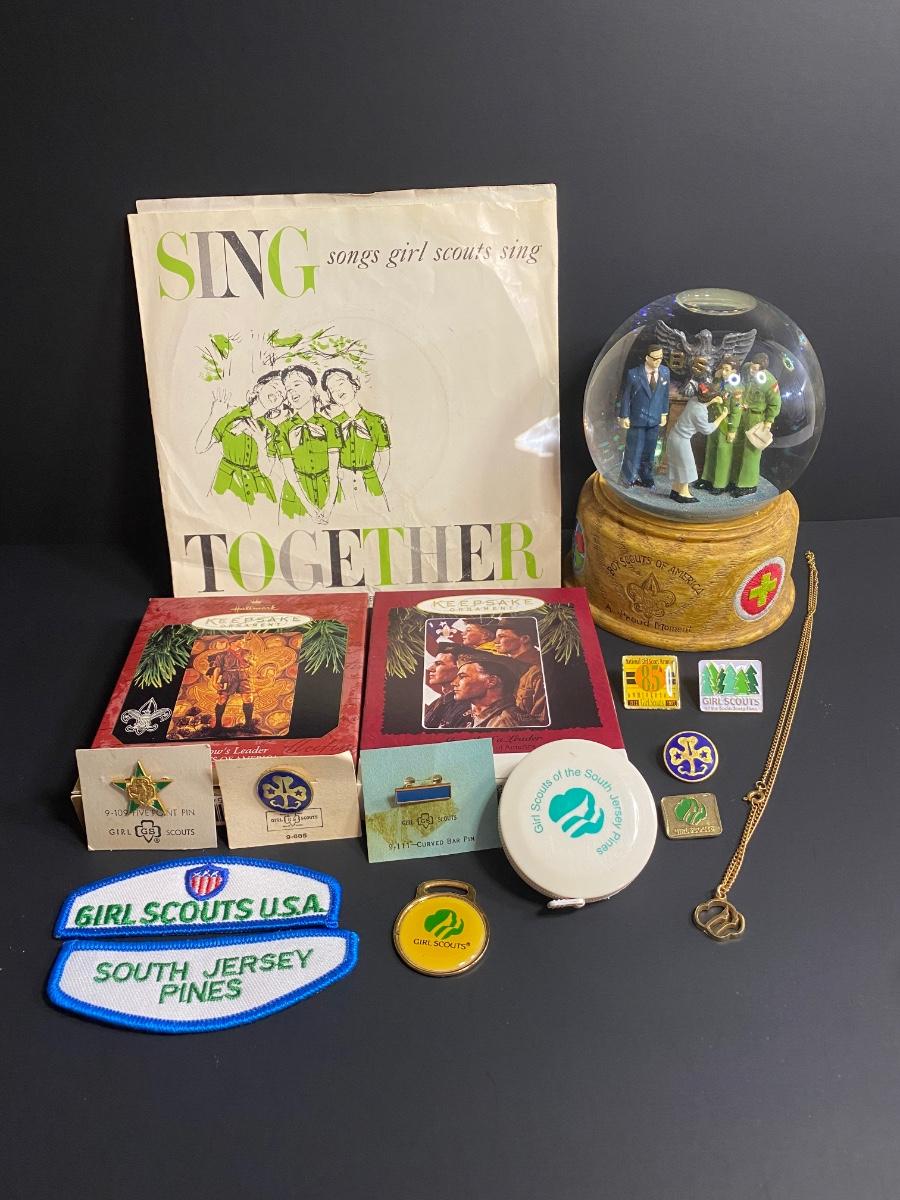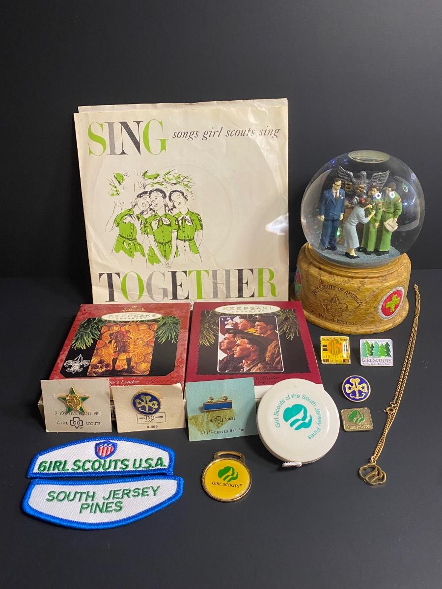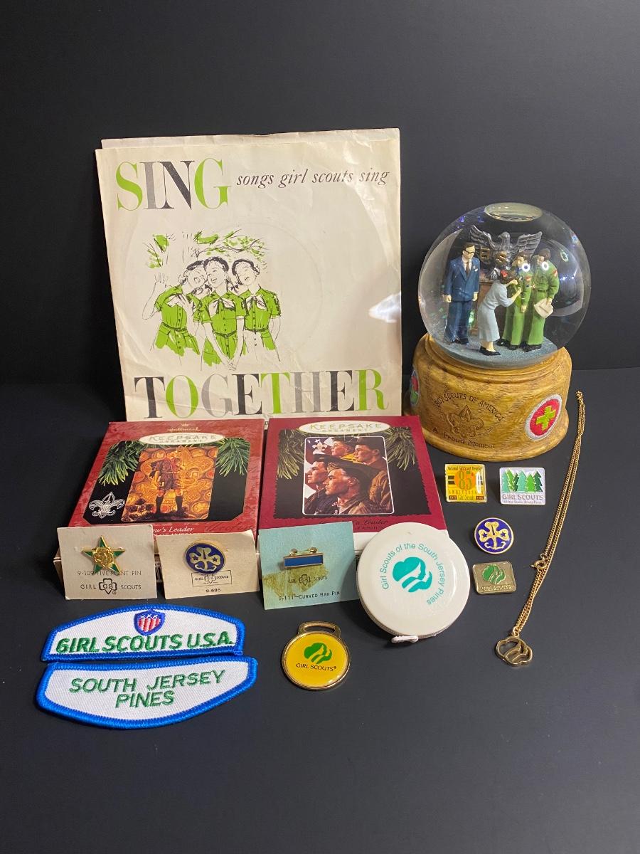 Vintage Boy/Girl Scouts memorabilia. Musical globe, Jewlry, patches, record, ornaments and more. Please see all pictures as they are the best representation of the items. The pictures show condition, measurements if taken, and what is included in the lot. Due to the large amount that we photograph and the time frame, we are not always able to take measurements. All items unless noted, are pre-owned and have been used. If you purchased furniture, you must bring help. We do not allow one person to carry large furniture out on their own. Bring help, tools and a truck for the safety of our client’s homes, and your personal safety. Company policy. Thank you.