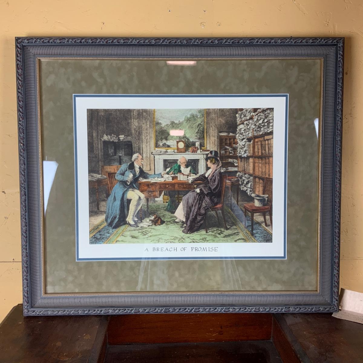 Breach of Promise Vintage Print. Professionally framed. Would look excellent in an office! //::\\ Please see photos for details and condition. No attempt has been made to hide any imperfections. All items listed in this auction are warehouse items, and need to be cleaned. A majority of the items need restoration as well. All items are sold AS IS and WITHOUT GUARANTEE. If you are uncertain about an item, DO NOT BID. Due to the nature of this online auction in-person inspection is HIGHLY recommended. All Sales are FINAL. Pick Up Times are FIRM. Please confirm with your own schedule that you can pick up in the scheduled times listed in the Terms and Conditions. Any questions please message the auctioneer. DO NOT Contact The Harp Gallery.