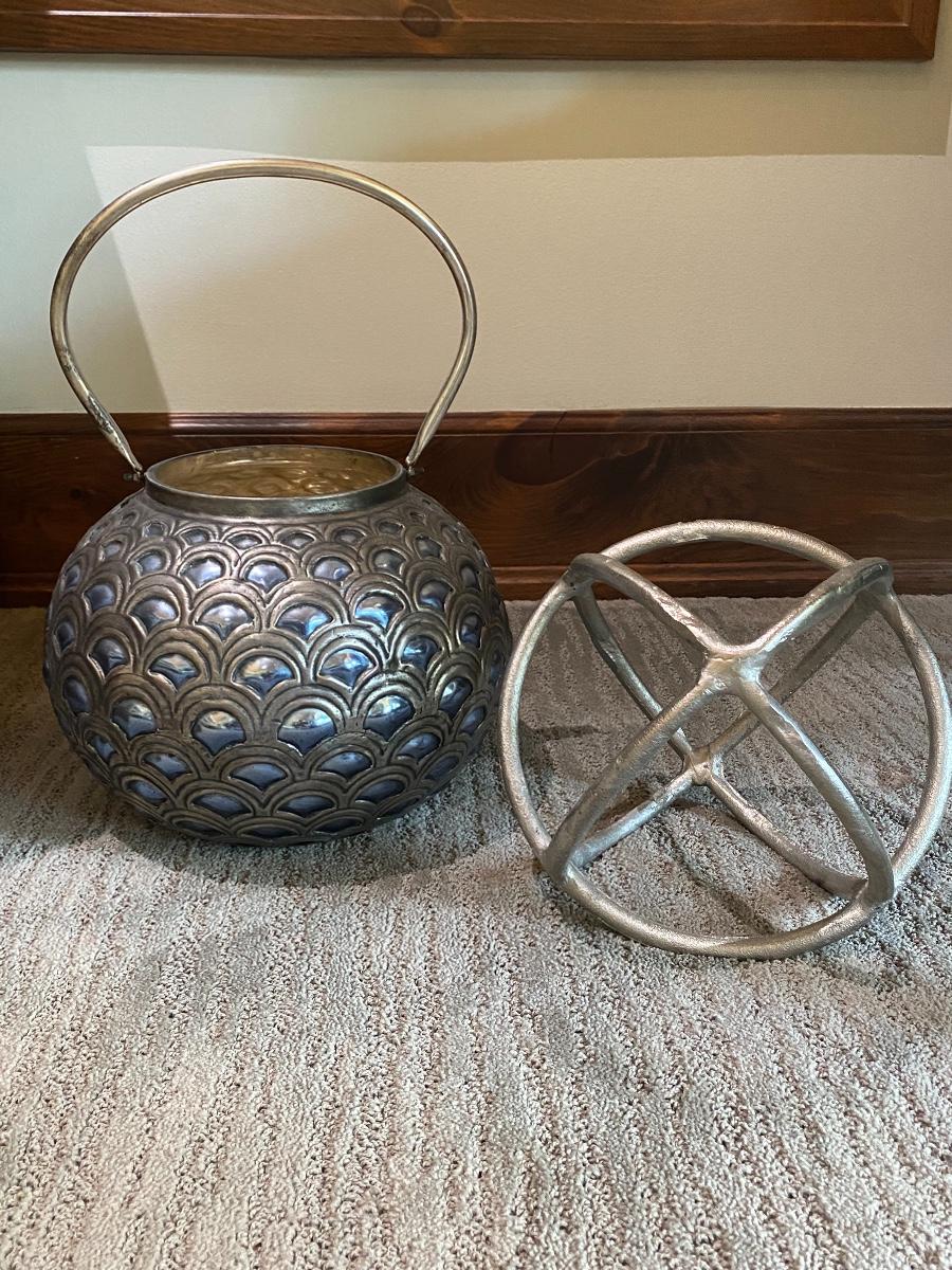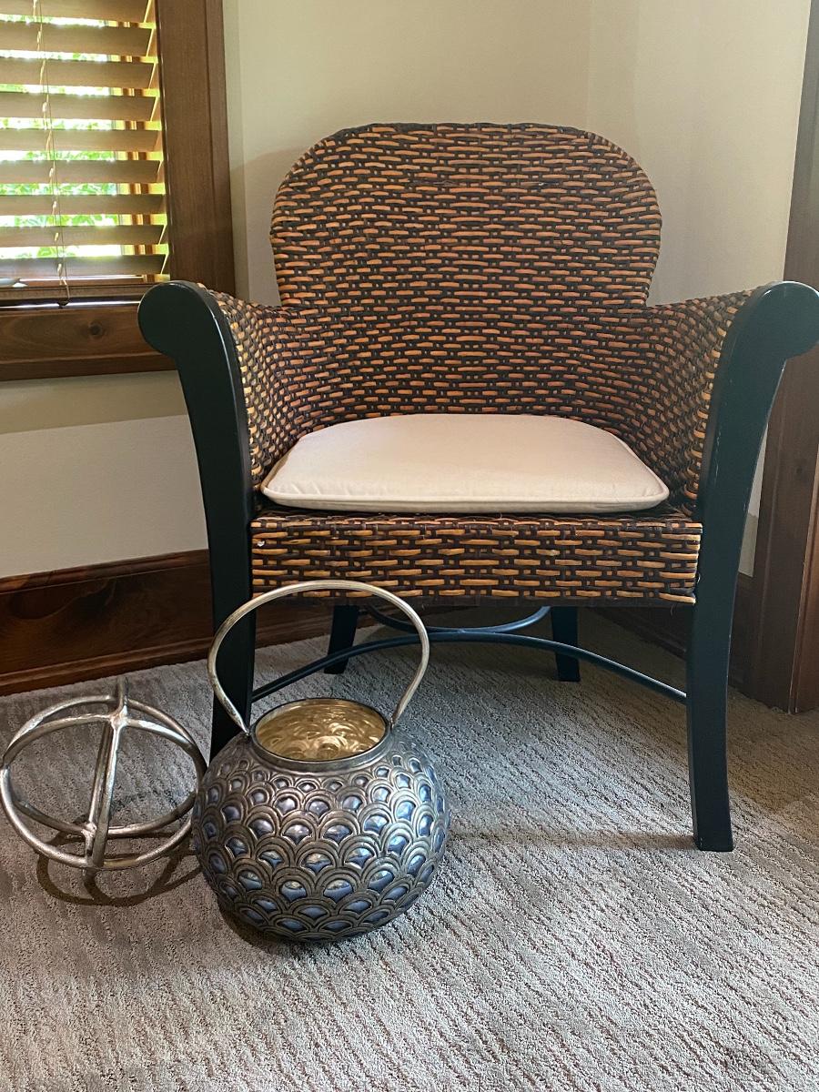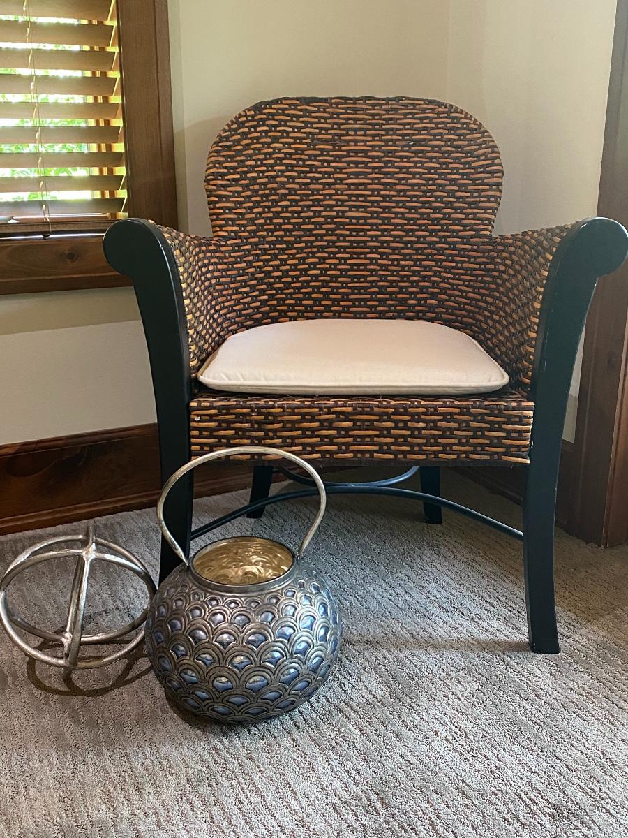 Side indoor/outdoor chair. Modern metal decor pieces. Please see all pictures as they are the best representation of the items in the lot, the condition of the lot, and will show measurements if taken. If purchasing furniture you must be able to move yourself with your own help, and truck.