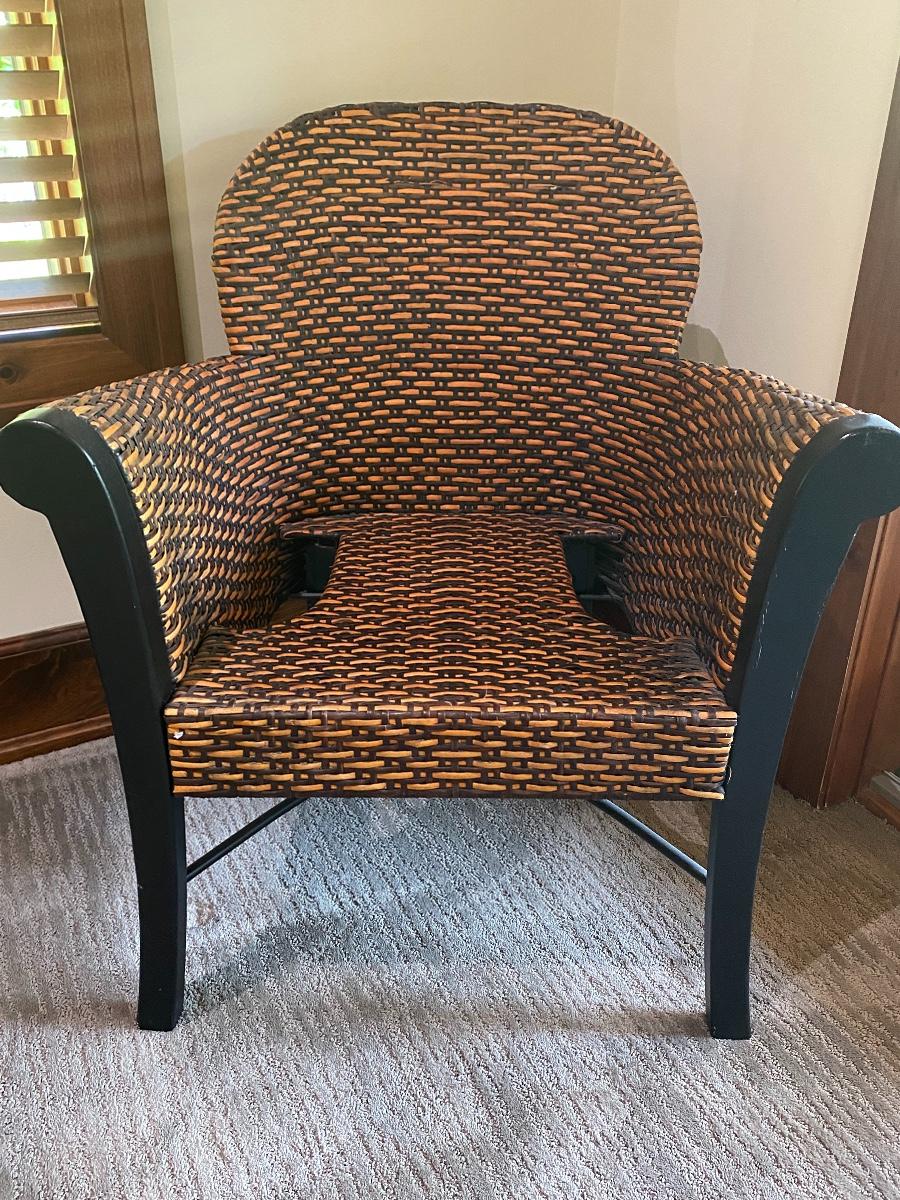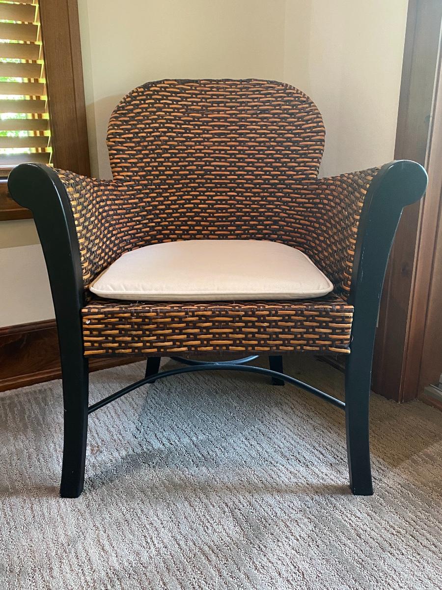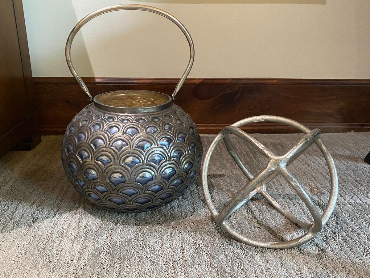 Side indoor/outdoor chair. Modern metal decor pieces. Please see all pictures as they are the best representation of the items in the lot, the condition of the lot, and will show measurements if taken. If purchasing furniture you must be able to move yourself with your own help, and truck.